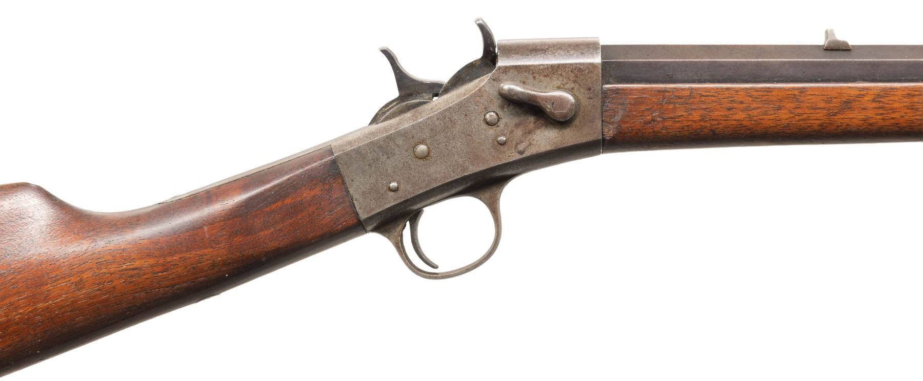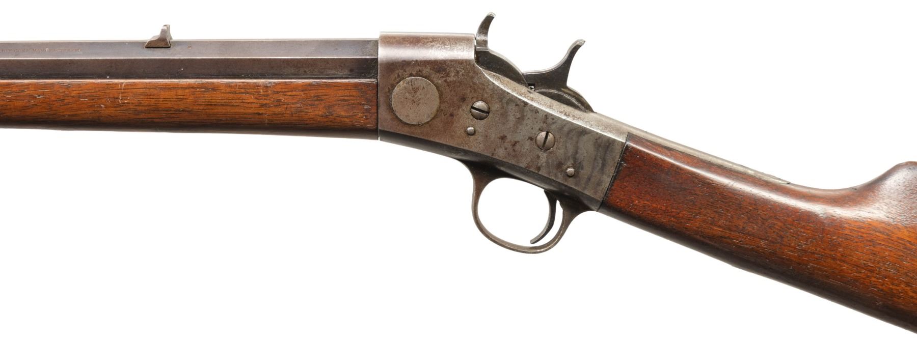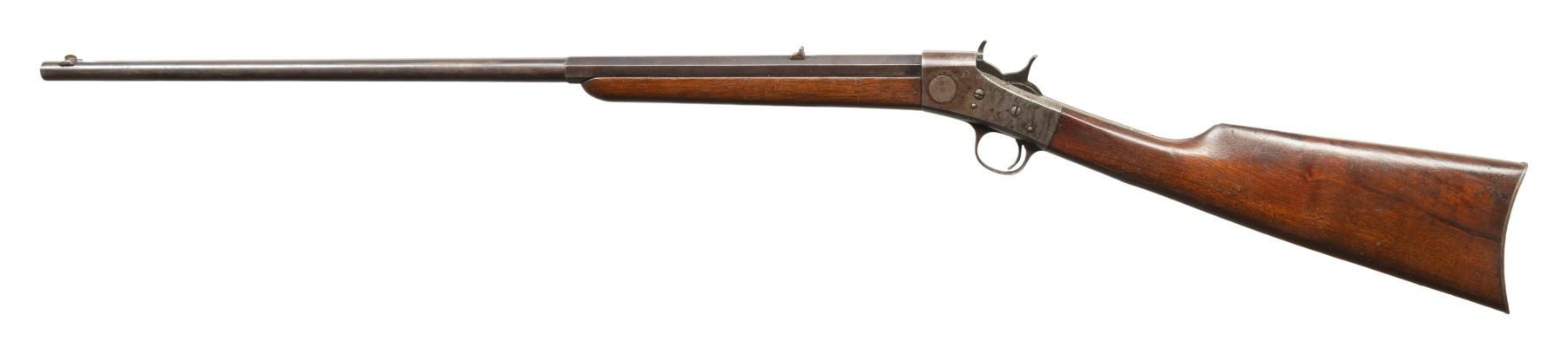 ROLLING BLOCK RIFLE. Cal. 32 RF. S# 3358. Half. oct., half rnd. 24" rifled; was also sold smoothbore. Sporting sights. Takedown rolling block action. Walnut stock set w/ curved buttplate. CONDITION: barrel is mix of blue & brown patina with muzzle wear, patina & marks. Receiver has traces of case colors with balance being brown/ gray patina. Good wood finish with sm. cracks behind top tang & scattered handling marks. Pitted worn rifling. PROVENANCE: Estate of Groves Herrick. (25-5674/MD). CURIO. $300-500.