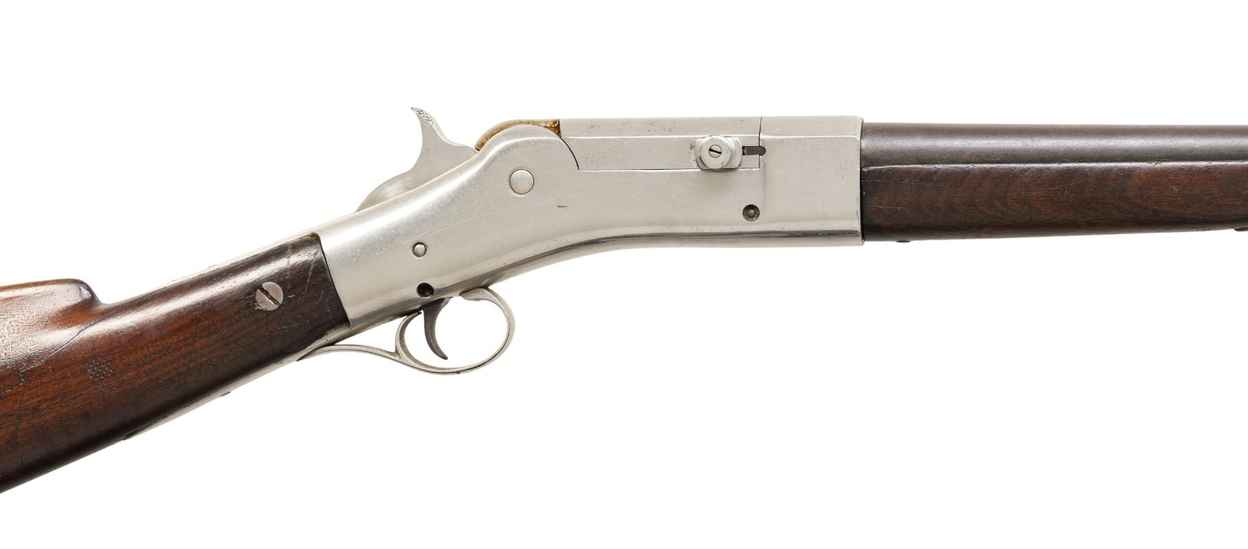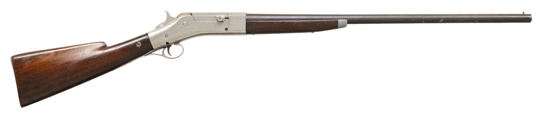Cal. 16 Ga. S# 27. Charles E Billings was President of Roper Repeating Rifle CO. from 1865-1869,then operated 1869-1876 with Christopher Spencer. Bbl. 25" w/ tall bead. Trapdoor style action. Walnut stock set. CONDITION: barrel has brown patina appearance with traces of blue at muzzle & pitting throughout. Re-nickeled action with pinprick patina. Sanded & refinished wood shows bolt repair through wrist with screw's head on right side along with large crack extending from top tang. Wood finish shows blistering with vice marks & other cracks. Bore shows pitting. PROVENANCE: Estate of Groves Herrick. (01-28895/MD). ANTIQUE. $400-600.