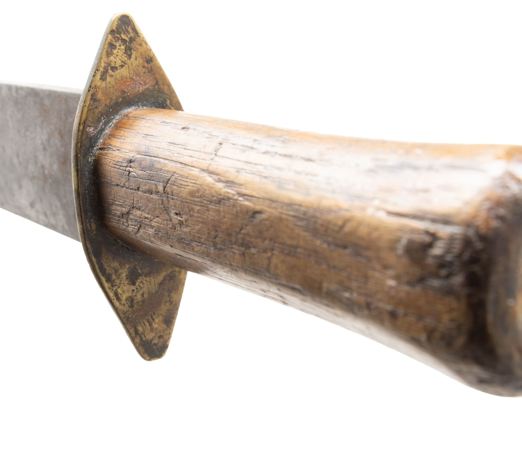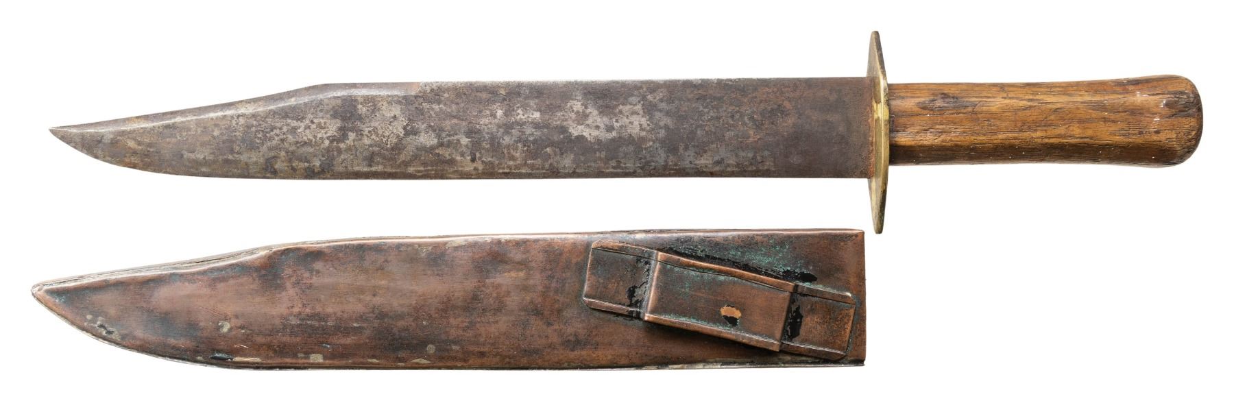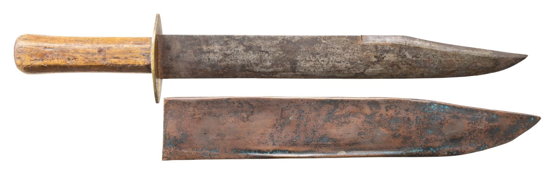 18" overall, 13" clip point blade, 4.5" clip, .28" thick, 1.6" wide, sculpted octagonal wood handle, 3" brass cross guard, heavy copper soldered scabbard with belt loop. CONDITION: very good overall, smooth iron patina, light pitting, sharpening, added scabbard fits but wider than blade. PROVENANCE: Bob Alispones estate collection. (02-26043/JS). NON-GUN. $1,200-1,500.