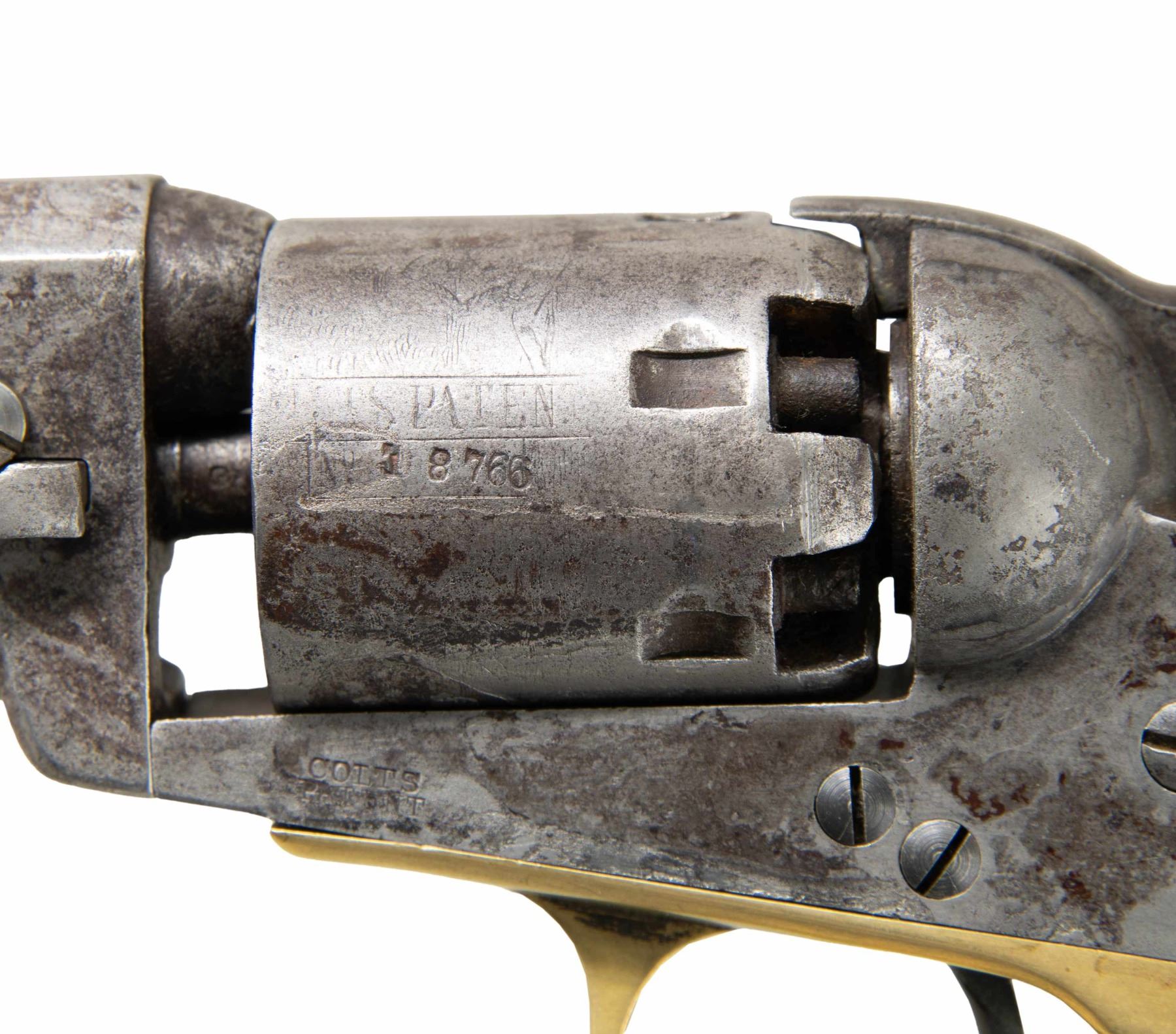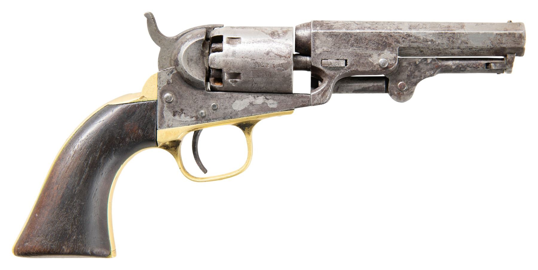 Cal. 31. S# 218766. Standard configuration made during Civil War in 1862, 4" octagonal barrel with 1-line NEW YORK US AMERICA address, small "COLT'S / PATENT" right side of frame, stagecoach holdup scene rolled 6-shot cylinder. Brass trigger guard and backstrap hold varnished walnut grips. CONDITION: good overall, all matching and complete, partial cylinder scene, mottled gray pitted metal, Mechanically functional, good pitted rifled bore, grips worn & well fit. PROVENANCE: Estate Collection of John "Jack" Dhooghe. (01-28254/JS). ANTIQUE. $600-800.