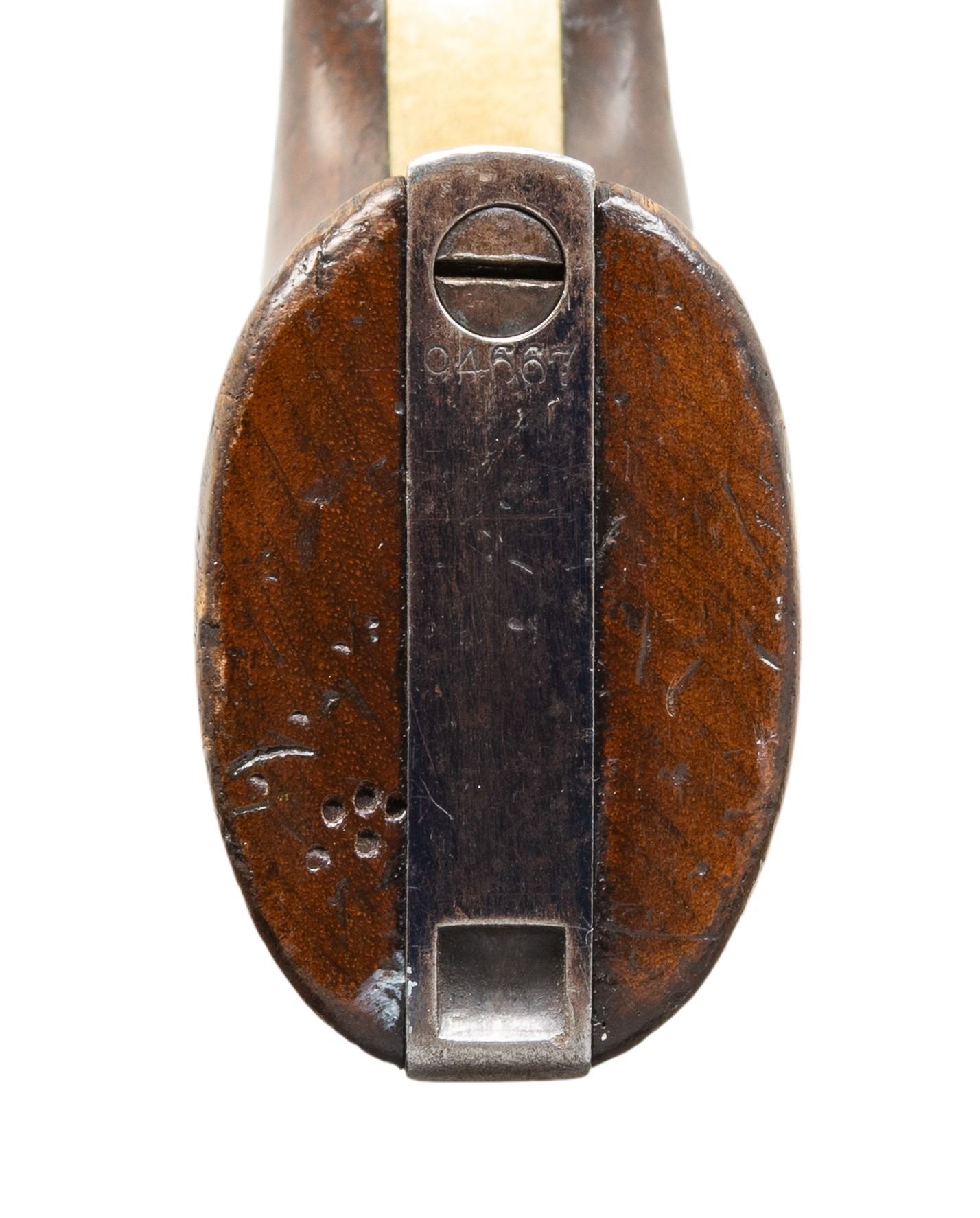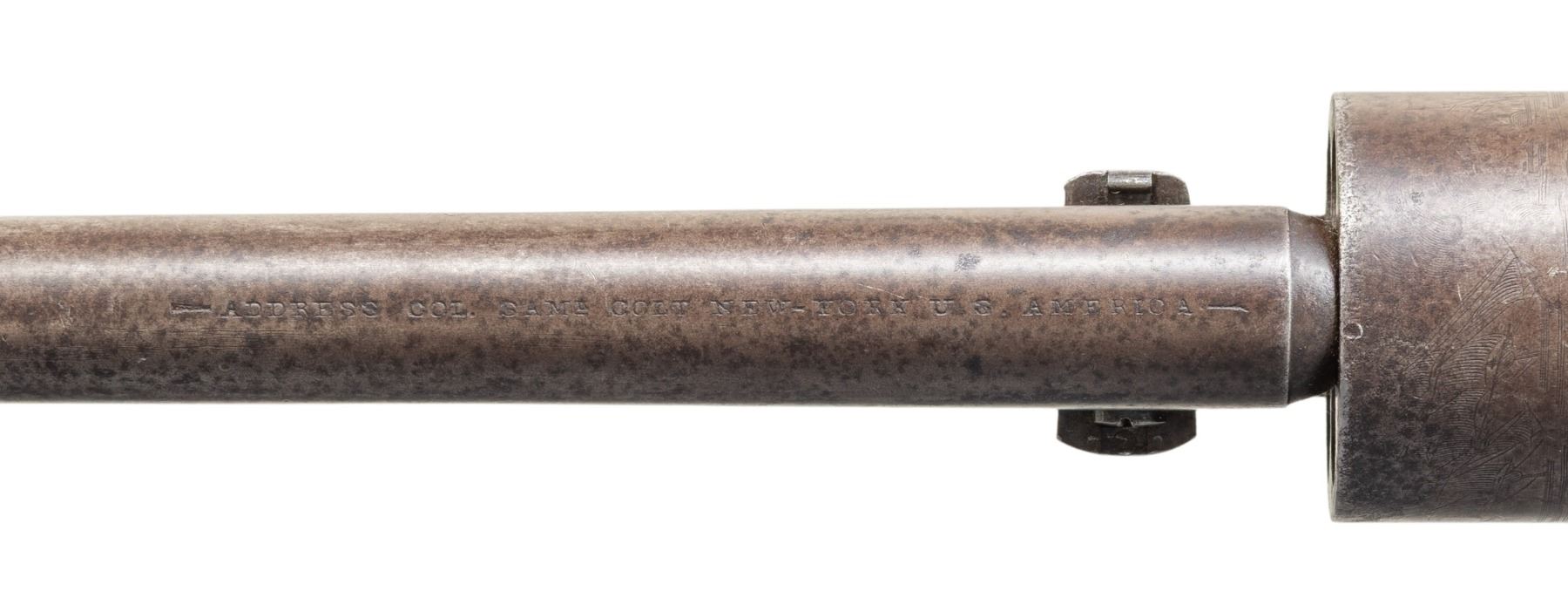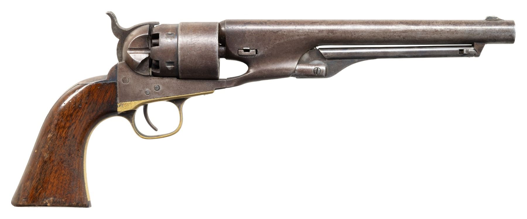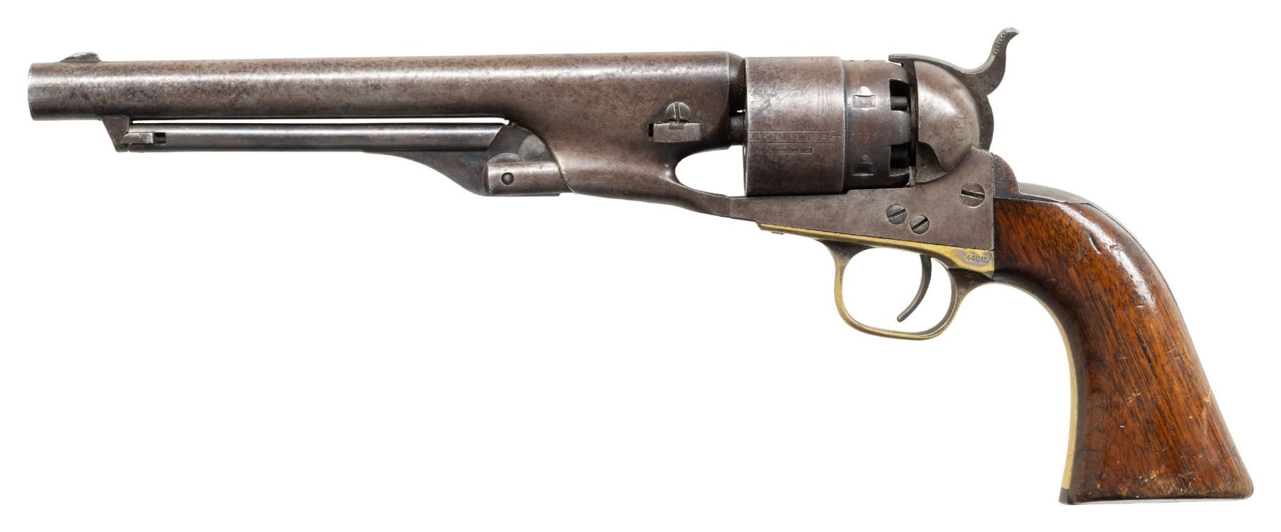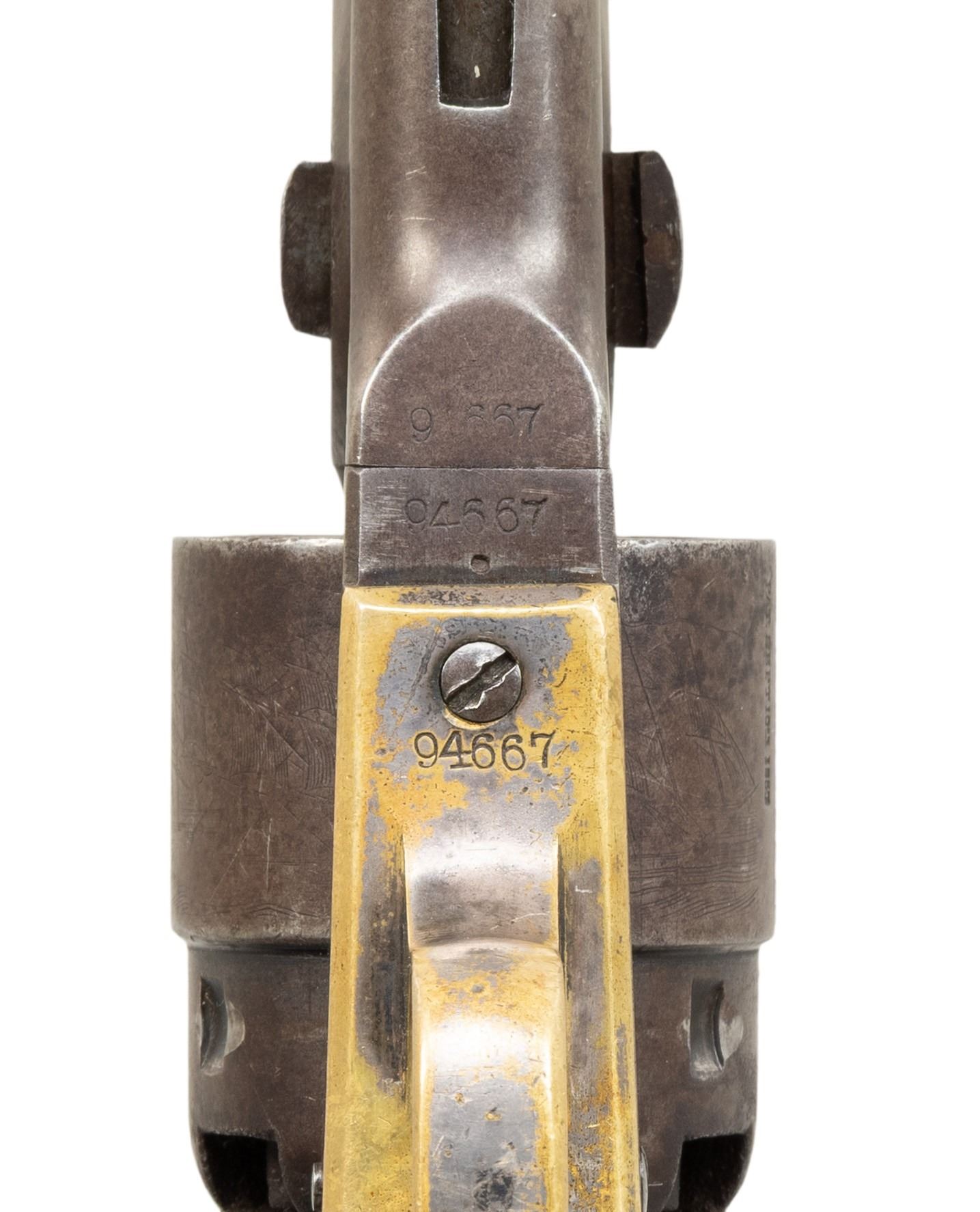 Cal. 44. S# 94667. This Colt 1860 army revolver is made from mix of condemned military inspected parts and sold by Colt in civilian market with silver plated brass triggerguard and varnished walnut grips. Revolver has all matching serial numbers included inked number in grip backstrap channel. The cylinder is factory re-numbered to match from military inspected cylinder that was condemned as shown by punch mark, frame also has punch mark condemnation mark. Standard configuration, blued 8" round barrel with rolled address "--ADDRESS COL. SAML COLT NEW-YORK U.S. AMERICA--", case colored frame stamped on left "COLTS/PATENT", blued steel back strap with shoulder stock notch, brass trigger guard stamped "44 CAL". Cylinder has rolled Texas Navy battle scene, "ENGAGED 16 MAY 1843" and "COLT'S PATENT No./PAT. SEPT 10th 1850". This revolver was added to Colt inventory Feb. 23, 1863 as one of 32 revolvers, all with plated trigger guards. CONDITION: very good overall, complete, original, all matching & good markings, retaining traces of blue in protected areas, some muted case color, traces of silver plate, about half original varnish retained on grips. Mechanically fine, crisp rifled bore. PROVENANCE: Norman Olliff Estate. (01-26916/JS). ANTIQUE. $1,500-2,000.
