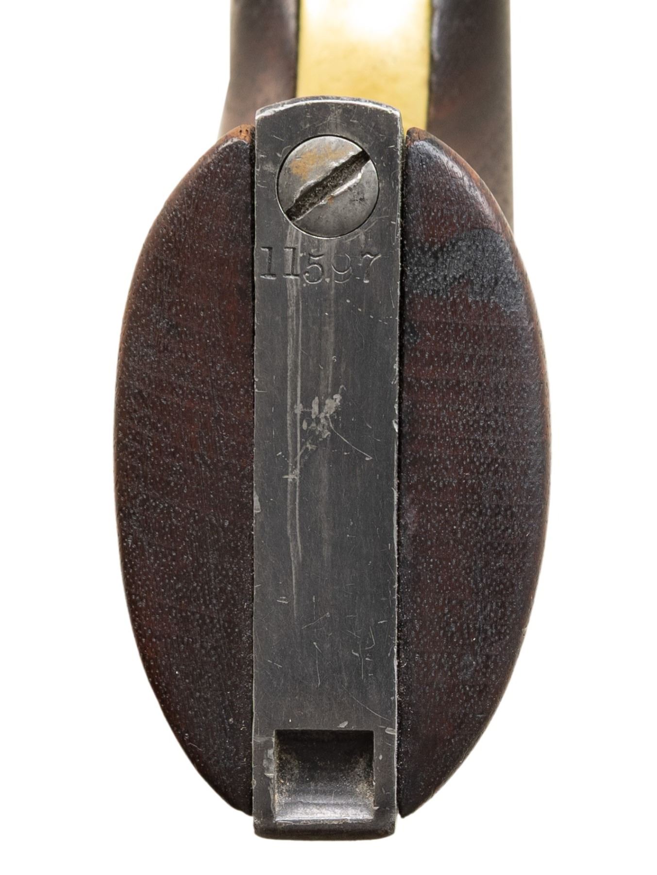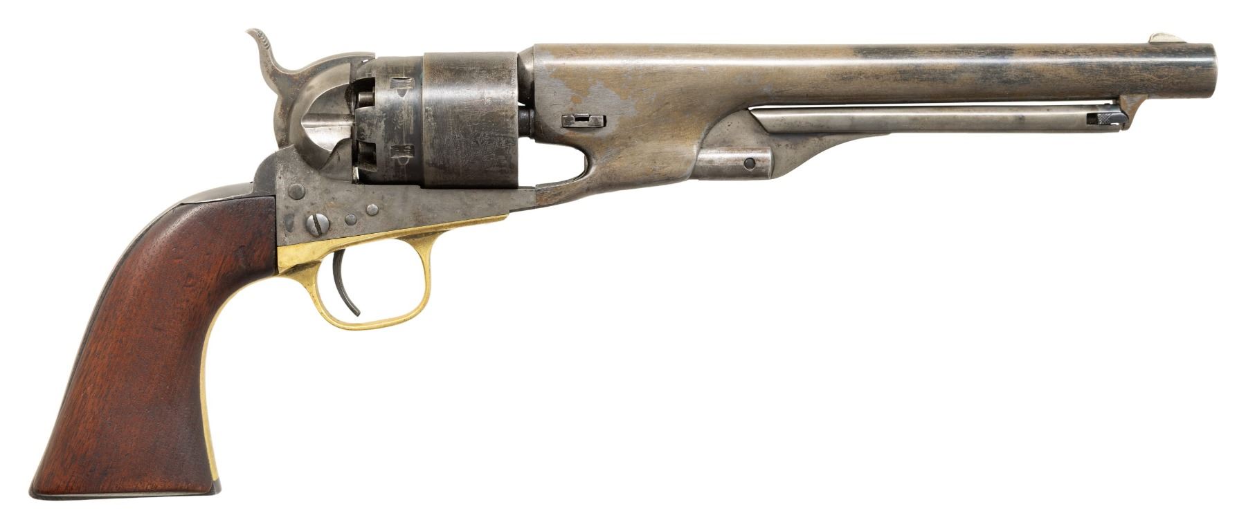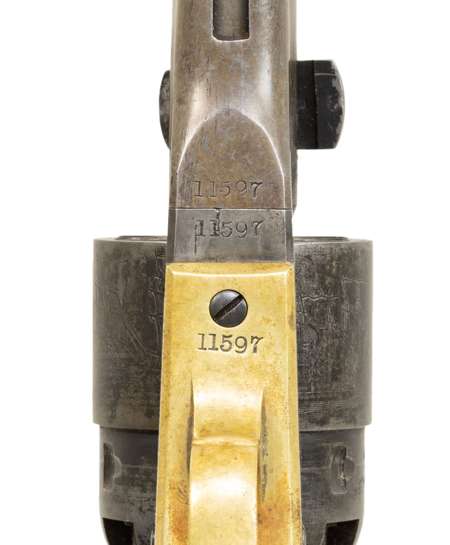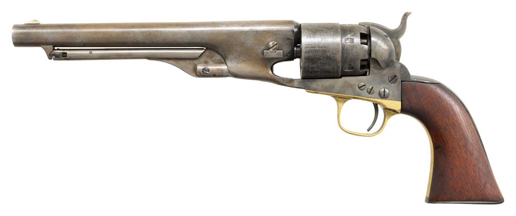 Cal. 44. S# 11597. This revolver appears to be a mix of Italian style reproduction parts with original Colt wood grip. Bbl. 8". Matching numbered bbl., cyl., grip straps & wedge. Brass triggerguard. Backstrap has notch for shoulder stock. "L", "S" & "H" inspector stamps throughout. Round rebated six shot cyl. w/ naval scene roll engraving. CONDITION: cleaned metal has mottled gray coloration from cold blue application showing spots of corrosion. Cleaned brass trigger guard is starting to reacquire a mild patina. Grips are heavily sanded & undersized w/ dark reddish finish & lack any sign of cartouches. Some screws show distortion. Cyl. locks up on 1 notch during hand cycling. Bore has strong rifling showing areas of pitting & frosting. (01-23499). ANTIQUE. $200-300.