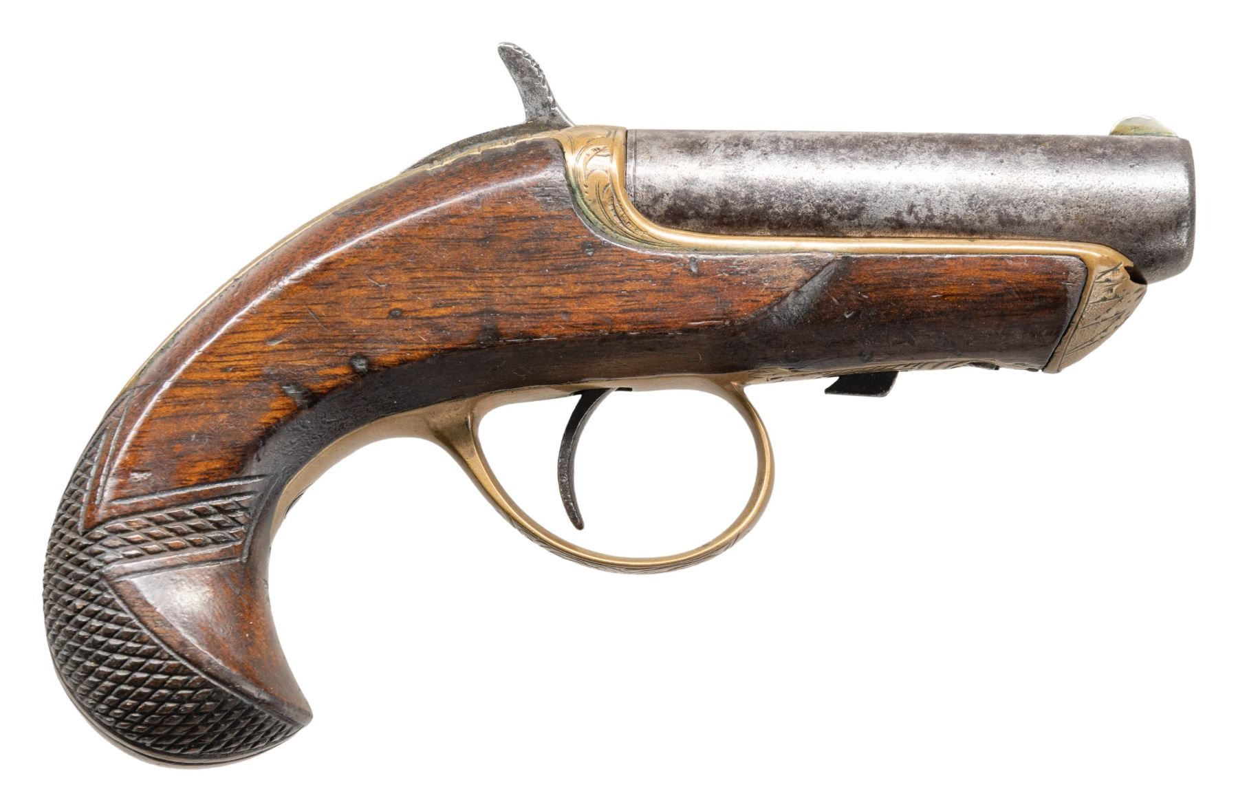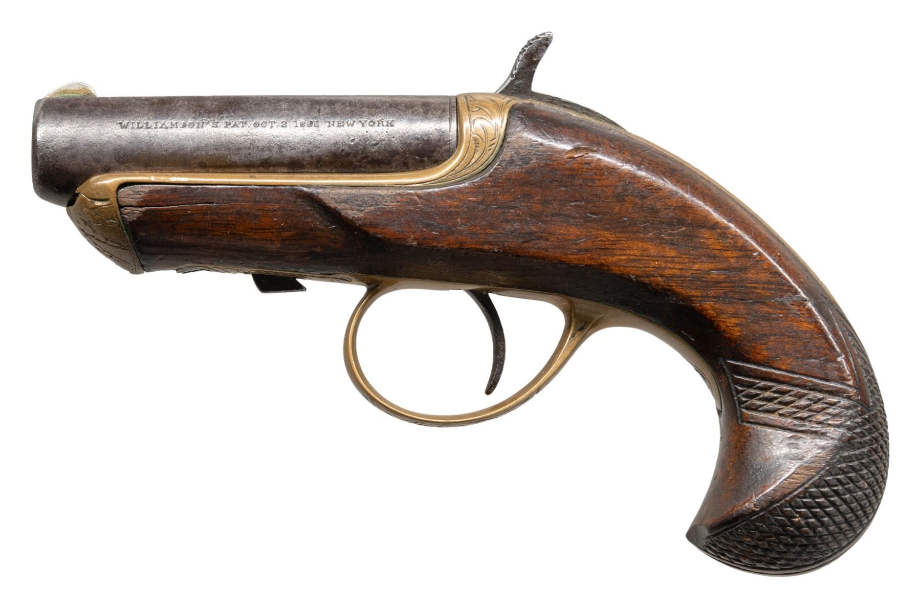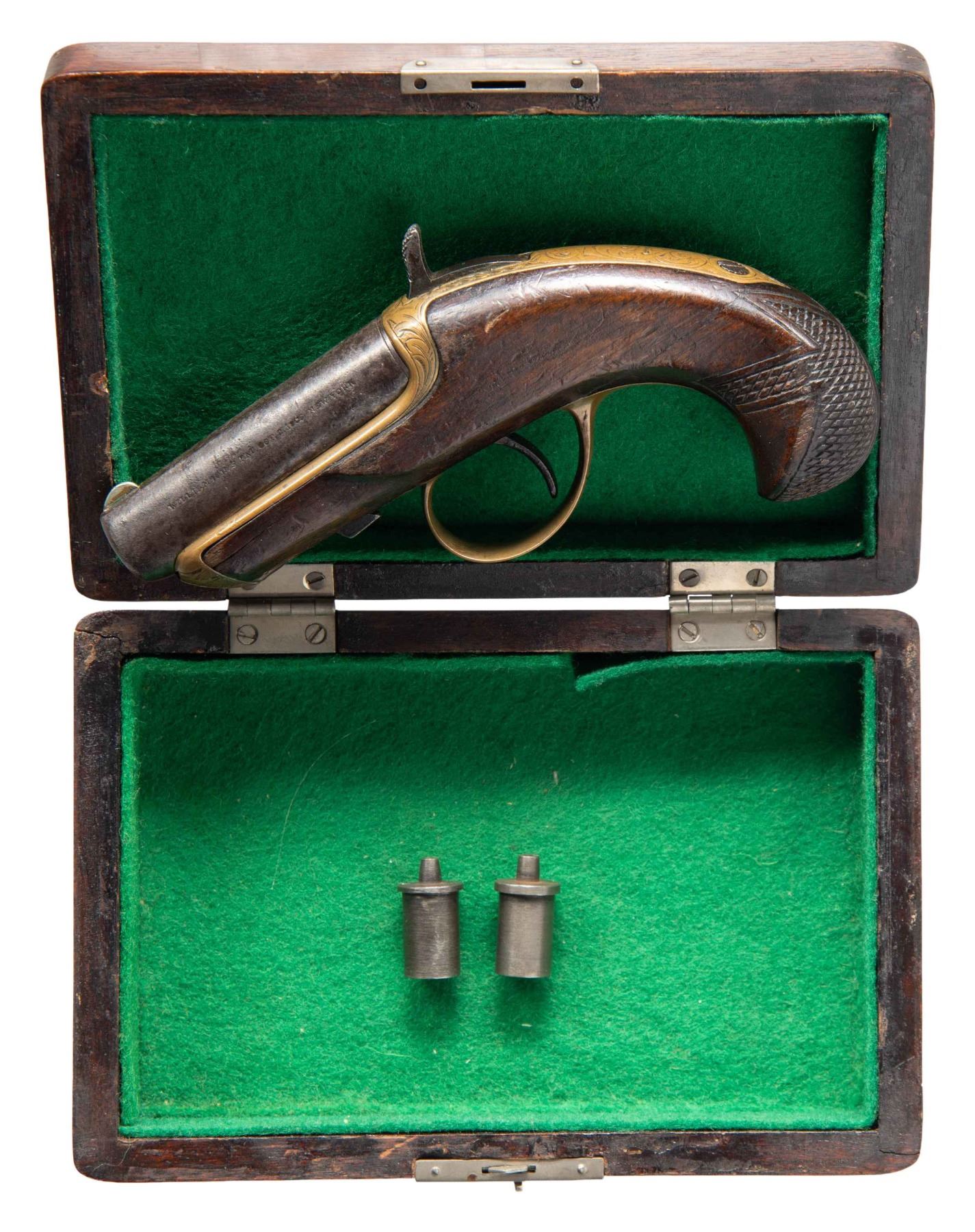 PISTOL WITH CASE. Cal. 38. S# 1183. Bbl. 2 1/2". Williamson's patent single shot sliding bbl. derringer pistol. Left side of the bbl. is marked "WILLIAMSON'S PAT.OCT,2.1866 NEW YORK" with a feathered arrow engraved across the top flat. Brass frame exhibits scroll engraving along the top and sides, terminating in a sunburst motif at the nose. Underside of trigger guard bow features matching pattern engraving, with additional engraving present on the forward tang. 1-piece checkered wood stock. UNATTACHED ACCESSORIES: wood case featuring a green felt lining, containing 2 auxiliary chambers, 1 likely being of contemporary production. CONDITION: iron components exhibit a mottled gray patina, with consistent light pitting and some small spots of mild pitting. Brass frame and trigger guard have acquired a pleasing mellow patina. Bore exhibits scattered spots/patches of dark surface oxidation, while retaining strong rifling throughout. Proper manual mechanics. 1 auxiliary chamber is poorly fit, not locking properly, and pushing the bbl. forward when the hammer is dropped. Stock shows scattered marks and impressions from handling and storage, with a crack stemming from the nose on the left, and a large crack running through the wrist, also on the left. Wood case is good, showing scattered superficial marks from handling and storage. PROVENANCE: The Esteemed Norm Greenberg Collection. (01-27653/MLW). ANTIQUE. $400-600.