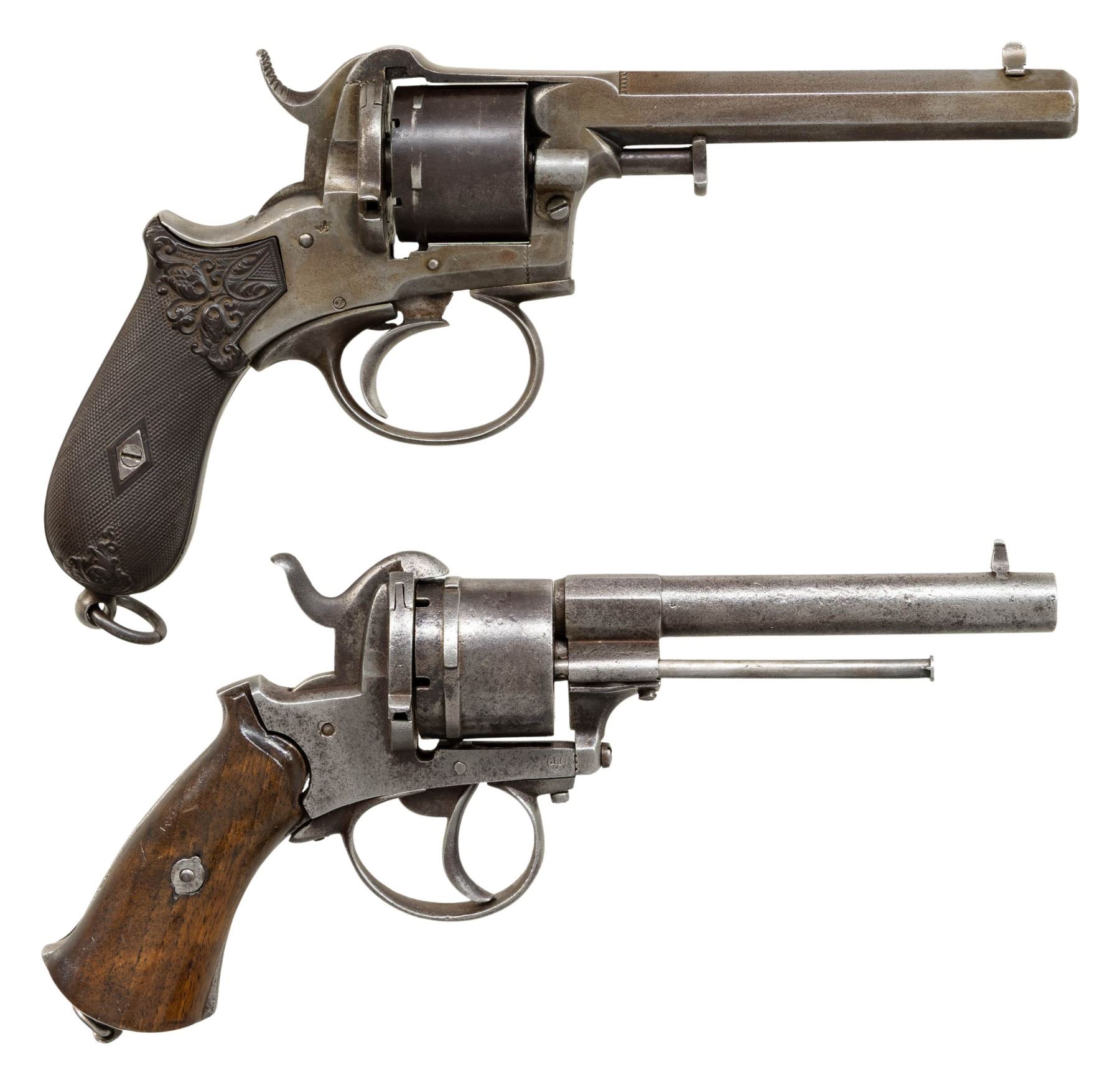 Cal. 9mm pinfire. NSNs. Both pistols are 6-shot double action, one 5" barrel stamped "SYSt. LEFAUCHEUX", decorated hard rubber bag grips. The other revolver has 4.5" barrel with Liege proofs, refinished varnished wood grips. Lot is accompanied with 9mm pinfire cartridge. CONDITION: good overall, no finish, light pitting, 5" functions, 4.5" will not cock but cylinder rotates with trigger pull. Dark rifled bores. (01-28501/JS). ANTIQUE. $400-500.