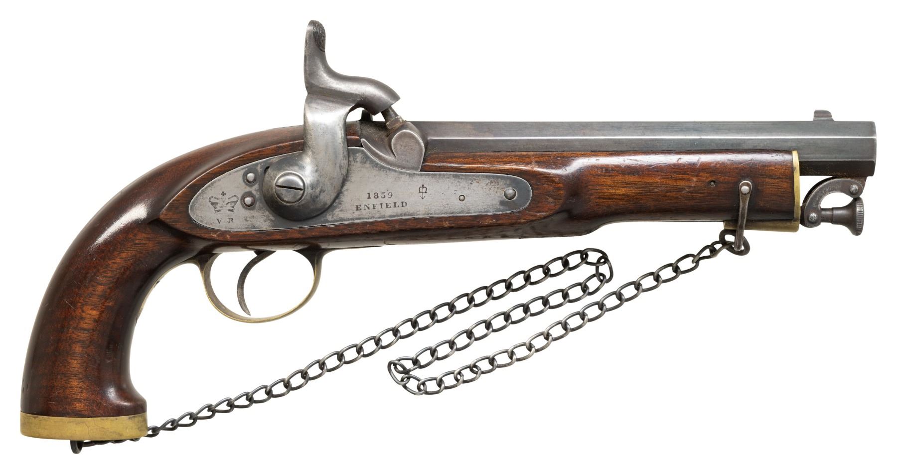 Cal. 70 S# NSN. The 8" octagon barrel having captive ramrod with bridle at front has Enfield markings, military proofs and war department marks on left flat. Standard Enfield percussion lock has crown "VR" at rear, broad arrow at front and center is marked "1859" "ENFIELD". European walnut stock is brass mounted with all mounts having Enfield marks and assembly No. "3". A chain appears original and links steel yoke at front to eye in grip cap. CONDITION: good. Cleaned and refinished. Iron and steel parts are dark gray where not cleaned to silver. Stock has some later marks and dings in its refinish. Bore is dark and pitted. Lock is good. PROVENANCE: Estate Collection of Nicholas Apergis. (01-27428/MGM). ANTIQUE. $1,000-1,500.