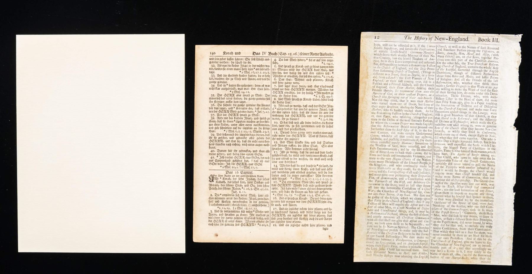 1) Page 11/12 book III, from Cotton Mather's "Magnalia Christi Americana…Ecclesiastical History of New England" published London 1702, (folio 11.75" x 8"). 2) Page from 1776 Christopher Saur Bible printed in Germantown, PA. When Germantown was attacked by British in Revolutionary War, pages from this bible were used by American Forces for gun wadding for their muskets. Saur was a British Loyalist, (folio ~10" x 7.5"). 3) Page printed by Benjamin Franklin, Philadelphia in 1750 from "Reply to Samuel Finley's….", (6.5" x 4"). CONDITION: good overall, pages are in binder with research materials. (02-25894/JS). NON-GUN. $200-400.