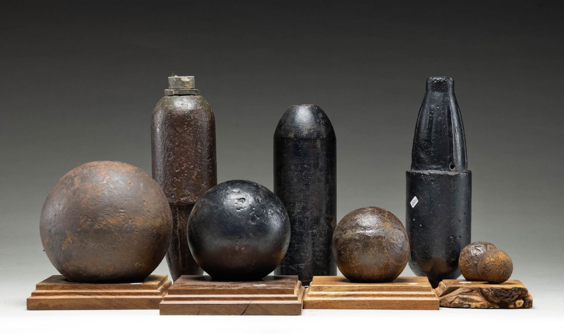 1 - 23.5 lb., 5.5" diameter ball. Also included are 4 wooden stands from 1 shell & 3 balls. CONDITION: items appear intact with corrosion or worn black paint. Stands in good condition with marks. PROVENANCE: Estate Collection of John "Jack" Dhooghe. (02-25570/MD). $500-1,000.