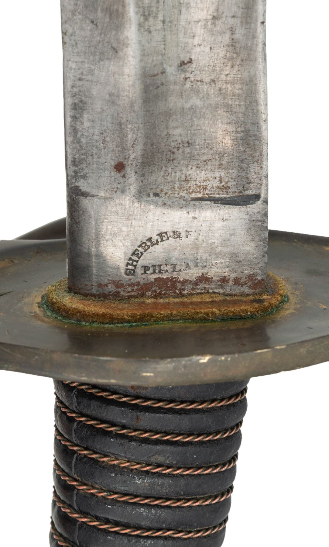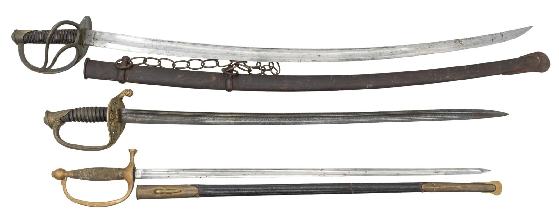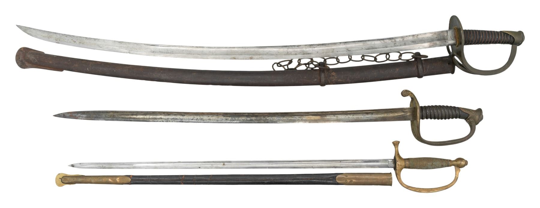 1) Scarce "SHEBLE & FISHER / PHILADELPHIA" marked heavy cavalry saber, 36" blade, complete leather grip & twisted wire wrap, well fit iron scabbard. 2) Ames 1864 dated & inspected Model 1840 Musician's sword, 28" bright polished blade, inspected brass mounted leather scabbard. 3) Unmarked Model 1850 foot officer sword, 30.5" blade, spiral carved horn grip. CONDITION: very good overall. (02-25617/JS). NON-GUN. $500-800.