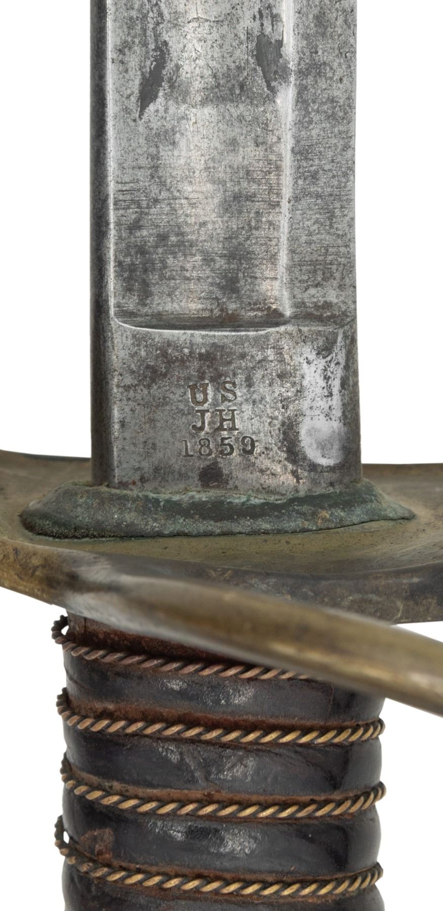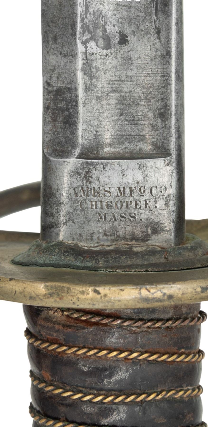 1) SCARCE 1859 DATED AMES model 1860 cavalry saber, 35" blade crisply maker marked, dated & inspected, complete leather & wire grip, well fit scabbard. Hilt has bend in knuckle bow that appears from being hit by ball during battle. 2) 1864 dated & inspected "MANSFIELD & LAMB, FORESTDALE RI" model 1860 cavalry saber, 35" blade, complete leather & twisted wire wrapped grip, well fit scabbard. 3) Unmarked model 1840 artillery saber, 32" blade, well fit scabbard, leather & twisted wire grip. CONDITION: very good overall. (02-25634/JS). NON-GUN. $800-1,200.