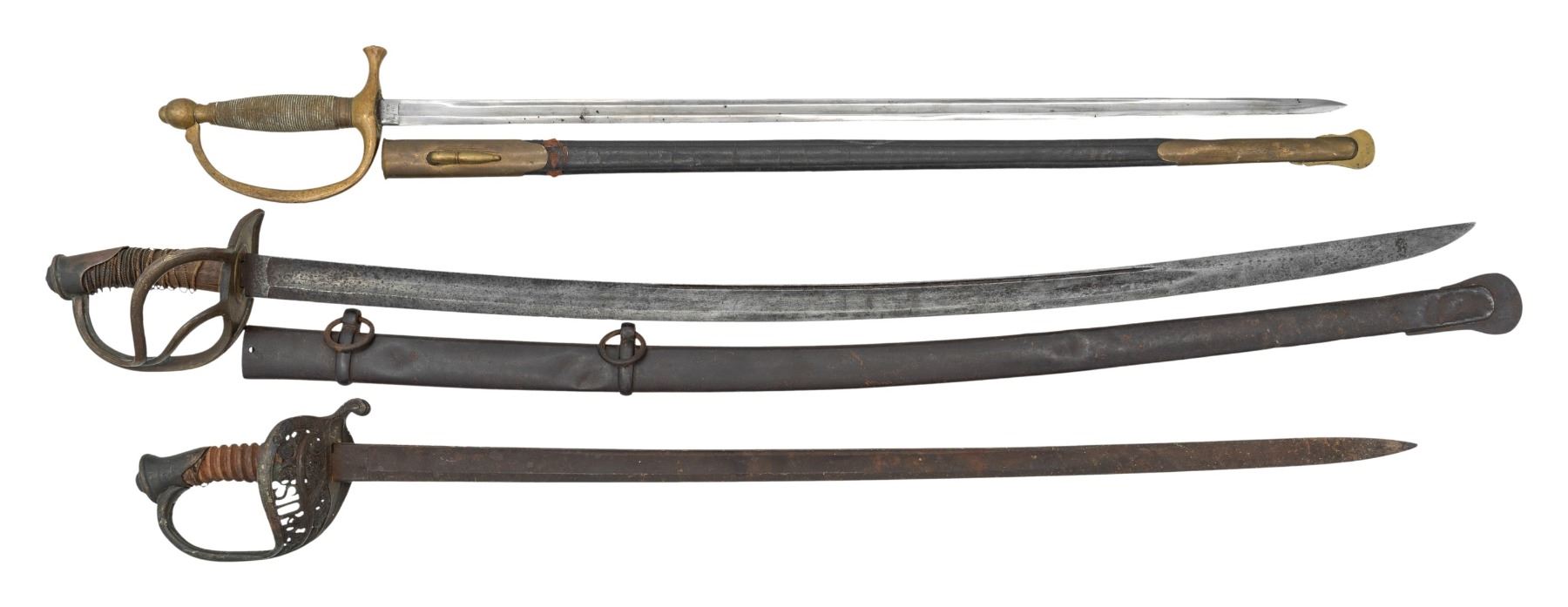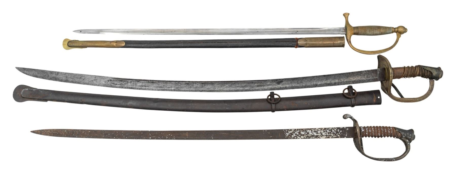 1) Unmarked heavy cavalry saber, 35" blade, iron scabbard, grip leather missing, but sprung wire present. 2) Ames 1864 dated & inspected model 1840 Musician's sword, 28" bright polished blade, inspected brass mounted leather scabbard. 3) Clauberg 1850 staff officer sword, dark pitted 30.5" blade, spiral carved wood grip, fragment of twisted wire, paint spattered. CONDITION: good overall as described. (02-25637/JS). NON-GUN. $600-800.