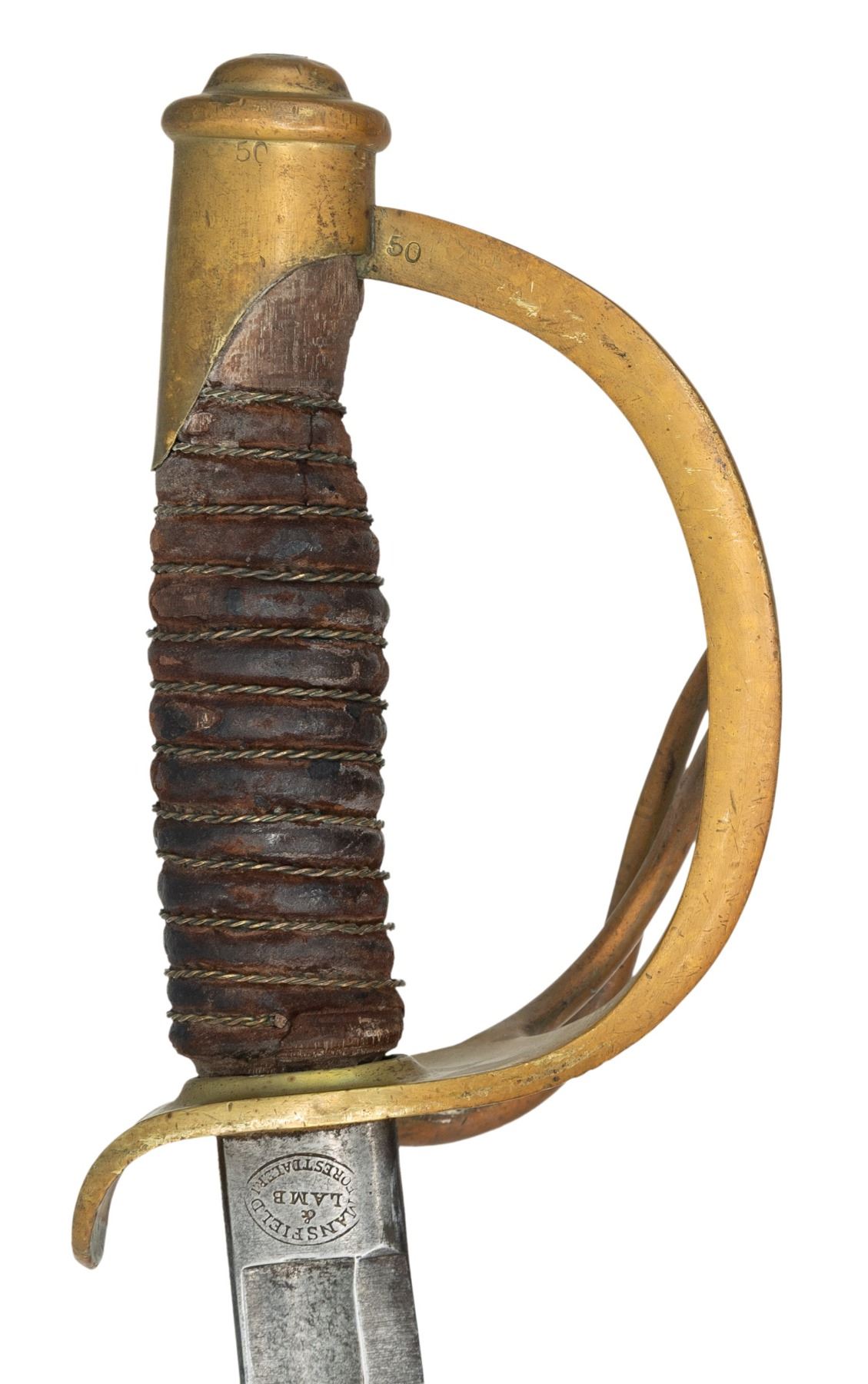 2) MANSFIELD & LAMB. "50" is stamped on guard & pommel. CONDITION: blade shows patina, numerous sm. nicks to edge & scratches. Hilt has appealing mustard patina with spots of paint. Wire is loose to deteriorating grip. Scabbard has added black paint with oxidation & marks. (02-25311/MD). NON-GUN. $100-300.