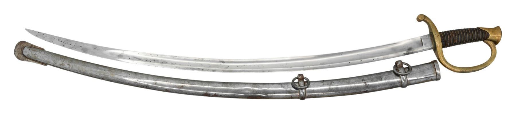SCABBARD. Overall: 37.5". Blade: 32"; barely visible "1865 / A" on ricasso. Brass guard, hilt & pommel. Wire wrapped leather grip. Iron scabbard. CONDITION: blade shows once cleaned appearance reacquiring patina with scattered spots of oxidation. Brass shows mustard patina. Leather is flaking with the wire being reattached near top. Once cleaned scabbard shows oxidation & couple of sm. dents. (02-25217/MD). NON-GUN. $500-800.