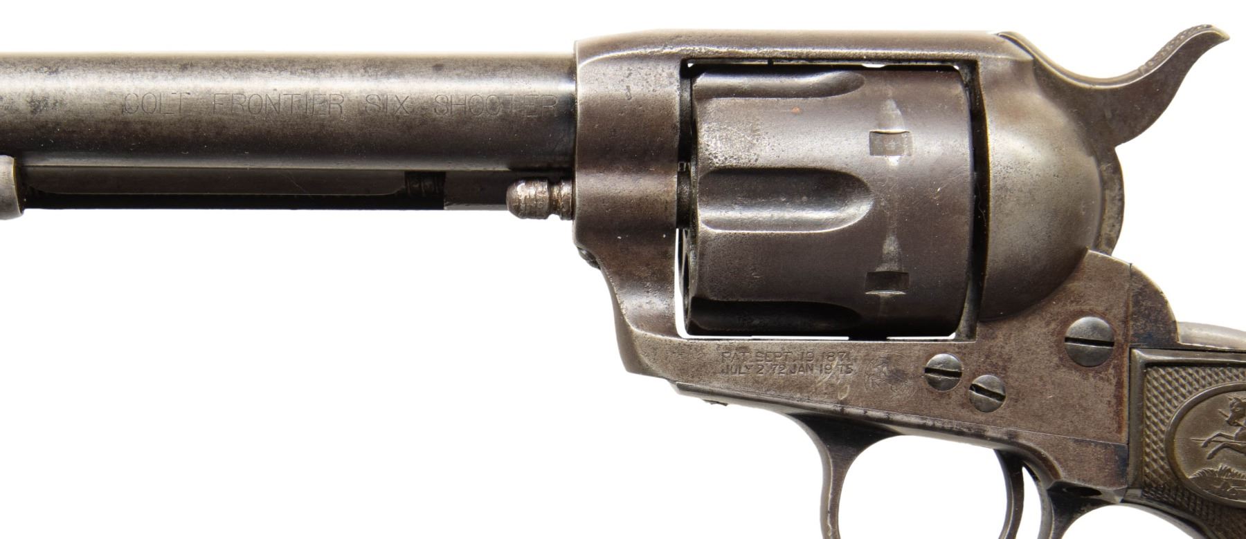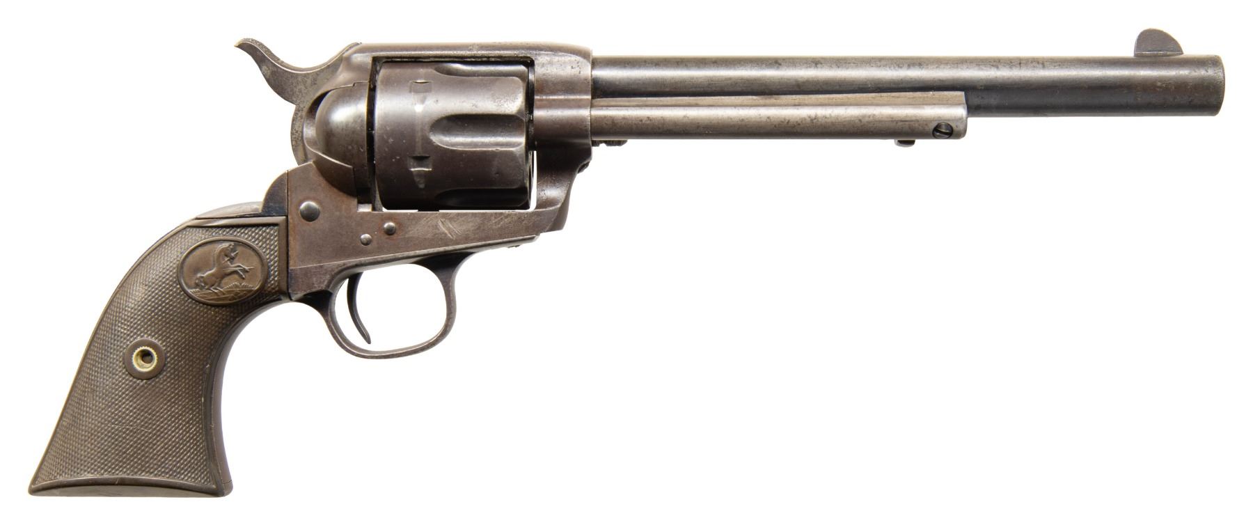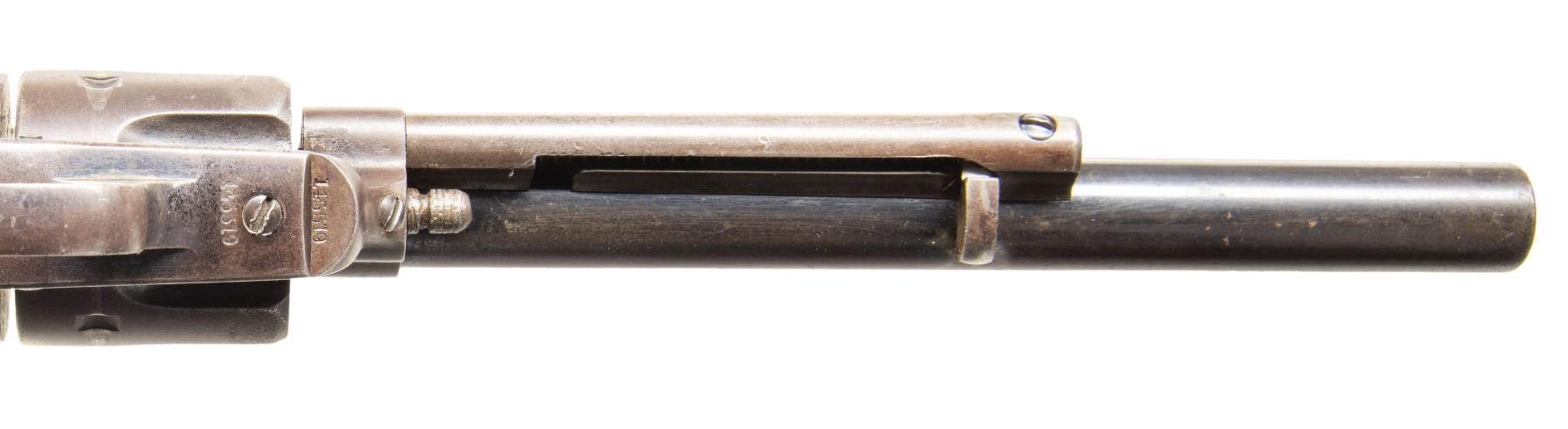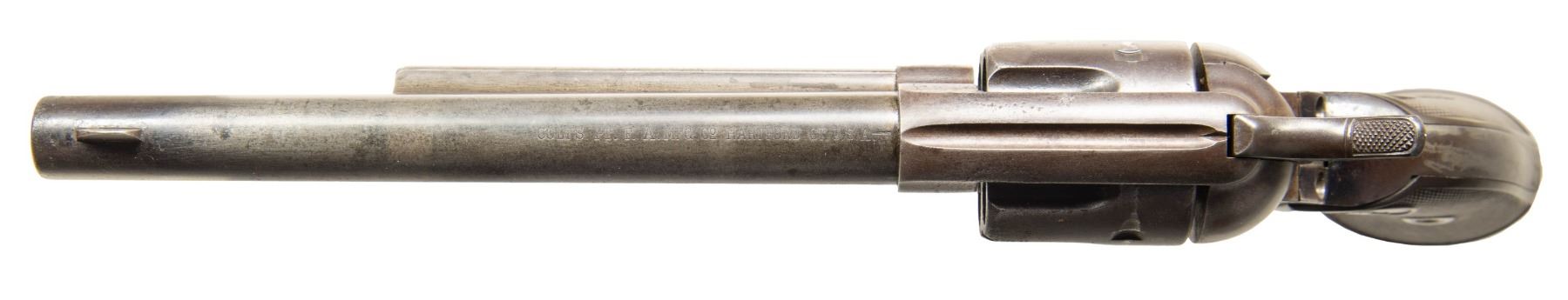 REVOLVER. Cal. 44-40. S# 145519. Made in 1892, standard configuration, 7.5" barrel, 1-line Hartford address, "COLT FRONTIER SIX SHOOTER" stamped on left side, 2-line patent and rampant Colt logo on frame. CONDITION: very good overall, strong traces of blue in protected areas, overall toned iron patina, areas of light pitting, good 2-piece checkered hard rubber grips with rampant Colt logo. Mechanics fine, good sharp rifled bore with areas of light pitting. PROVENANCE: Estate Collection of Compton LaBauve Jr. (01-28919/JS). ANTIQUE. $2,000-3,000.