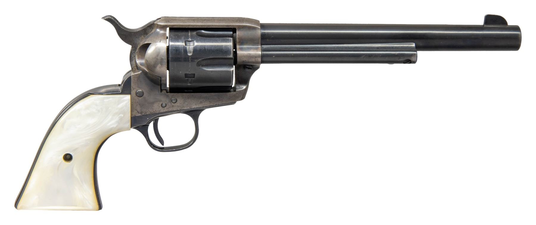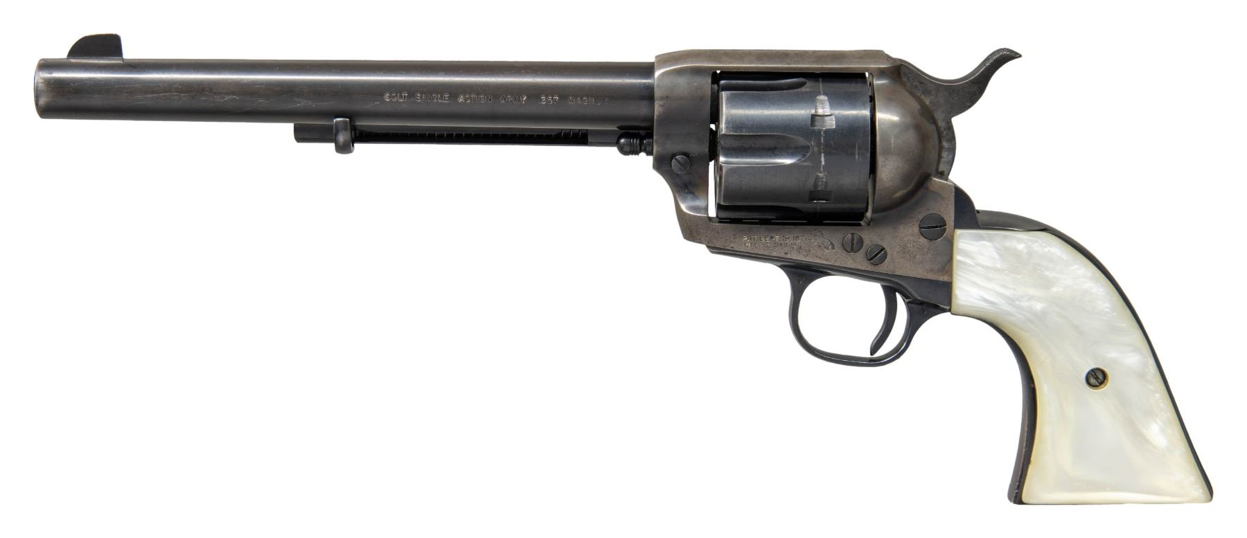 REVOLVER. Cal. 357 Mag. S# 43672SA. Bbl. 7 1/2". Second Generation Single Action Army revolver mfg. by Colt in 1966. Left side of the bbl. is marked "COLT SINGLE ACTION ARMY .357 MAGNUM", with Colt's single line address marked across the top. Left side of the frame is marked with Colt's 2-line patent information, followed by the Rampant Colt logo. Frame and loading gate exhibit a case colored finish, with remaining metal components exhibiting a blue finish. Sides are hammer are polished in-the-white. Frame is mounted with 2-piece aftermarket faux pearl and black synthetic grips, marked "55" and "OLD MODEL/ Colt Single Action Army" in white ink on the interior of the panels. All serialized parts are matching and include the frame, cyl., as well as the grip straps (left side, beneath grip panel). Frame and loading gate do not have matching assembly #s. CONDITION: frame and loading gate retain trace to fair amounts of their original case colored finish, with the balance exhibiting wear and fading to gray patina, as well as scattered spots of age related discoloration. Blued parts retain large amounts of their original finish, showing areas of wear and thinning, scattered scratches and superficial marks, as well as scattered spots of light surface oxidation overall. Mirror bore, exhibiting some spots of light pitting, while retaining well defined rifling throughout. Proper manual mechanics. Grips show scattered scratches and superficial marks, but otherwise remain sound. PROVENANCE: The Esteemed Norm Greenberg Collection. (25-4171/MLW). CURIO. $1,750-2,500.