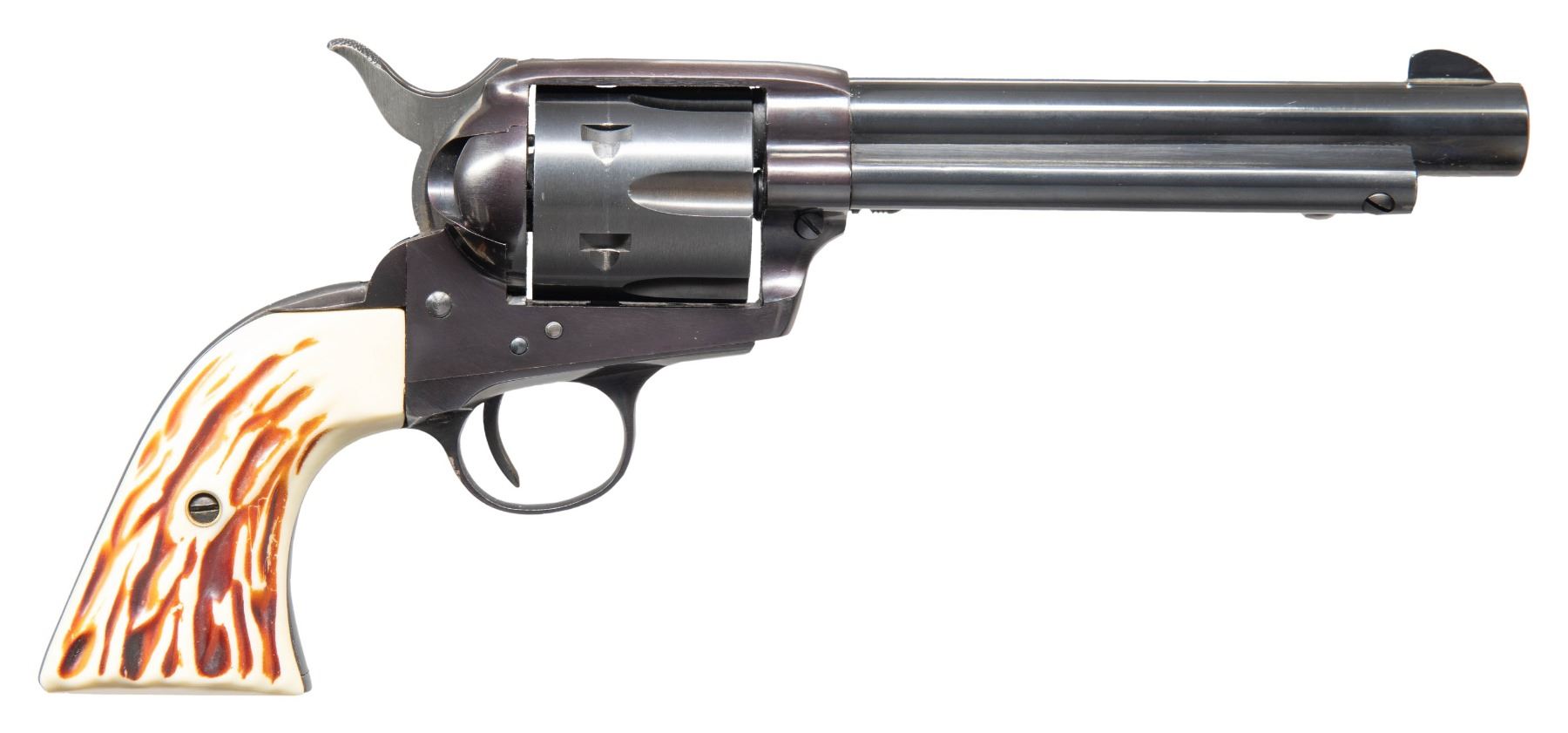 REVOLVER. Cal. 22 LR / WMR. S# 13595. mfg. 1954-1964. Bbl. 5.5". Fixed sights. 6 Shot fluted cyl. Blued finish. Two piece stag grips. CONDITION: very good blue on barrel & ejectors housing. Frame & grip straps has a plum tone mixing with the very good metal finish with light marks. Very good grips. Very good rifling. (25-5774/MD). CURIO. $300-500.