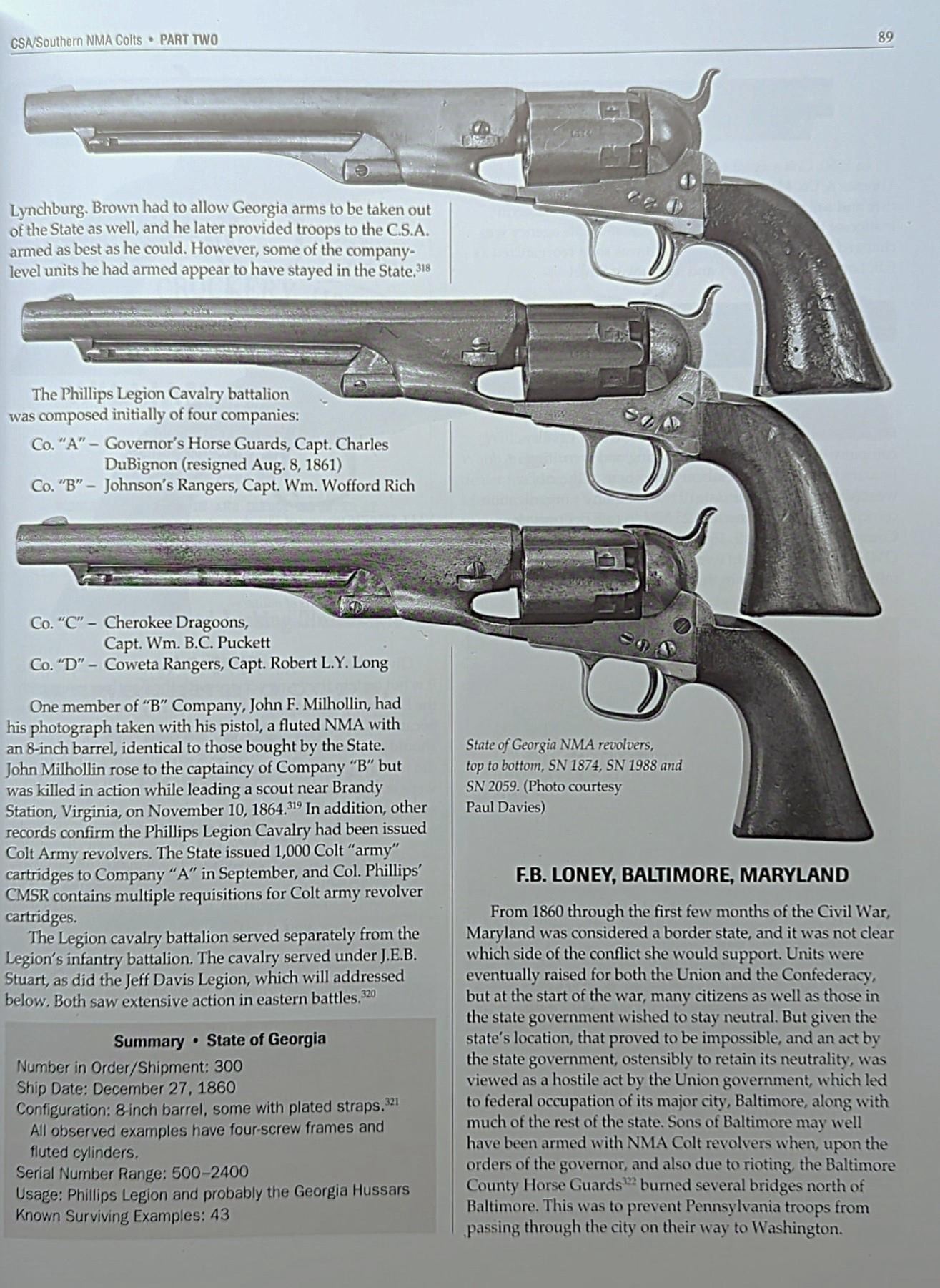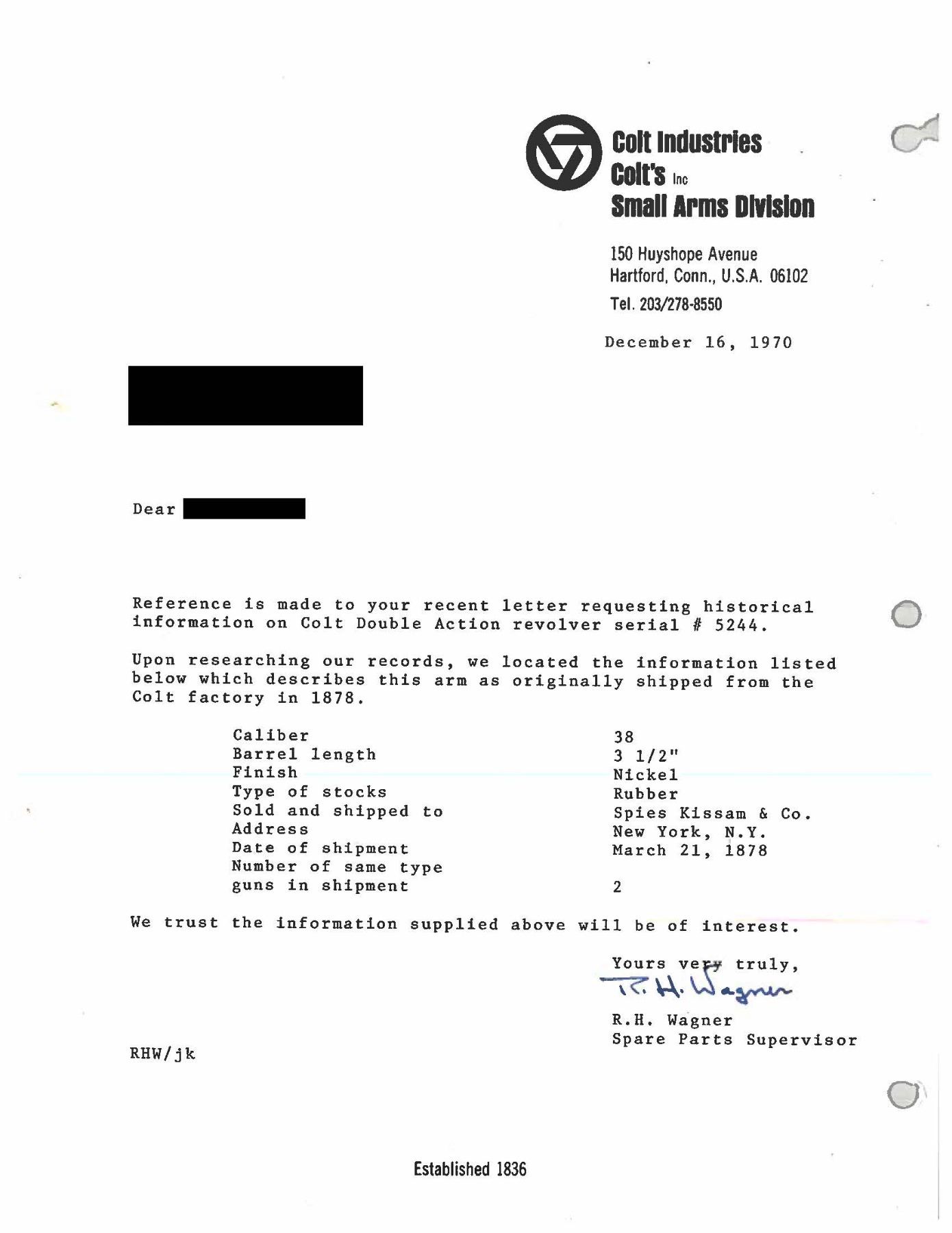 DOUBLE ACTION REVOLVER WITH FACTORY LETTER. Cal. 38 Colt. S# 5244. Bbl. 3 1/2". Model 1877 "Lightning" double action revolver mfg. by Colt in 1878. Let side of the bbl. exhibits a faint "COLT D.A. 38" etched panel, with Colt's 2-line address stamped across the top. Left side of the frame is marked with Colt's 3-line patent information, with "38 CAL" marked on the left side of the rear trigger guard web. Metal components exhibit a nickel plated finish. Frame is mounted with 2-piece Colt checkered brown hard rubber grips. Interior of right panel is inscribed with an "R". Half-moon blade front sight and frame notched rear sight. Frame, trigger guard, and rear grip strap are matching via "5244" with the cyl. matching via "244". UNATTACHED ACCESSORIES: Colt factory letter dated December 16, 1970 stating: "Caliber 38/ Barrel length 3 1/2"/ Type of stocks Rubber/ Sold and shipped to Spies Kissam & Co./ Address New York, N.Y./ Date of shipment March 21, 1878/ Number of same type guns in shipment 2". CONDITION: metal components retain traces of their original nickel plated finish, with the balance having faded to a gray patina, showing some spots/areas of light pitting and age related discoloration. Relatively bright bore, exhibiting scattered spots and patches of mild pitting and consistent mild pitting at/around the muzzle, while retaining strong rifling throughout. Action does not function, with the cyl. not rotating when hammer is cocked. Hammer and trigger lock up when the trigger is in the forward position. Grips show smoothing and scattered superficial handling marks, but otherwise remain sound. PROVENANCE: The Esteemed Norm Greenberg Collection. (01-27684/MLW). ANTIQUE. $400-600.