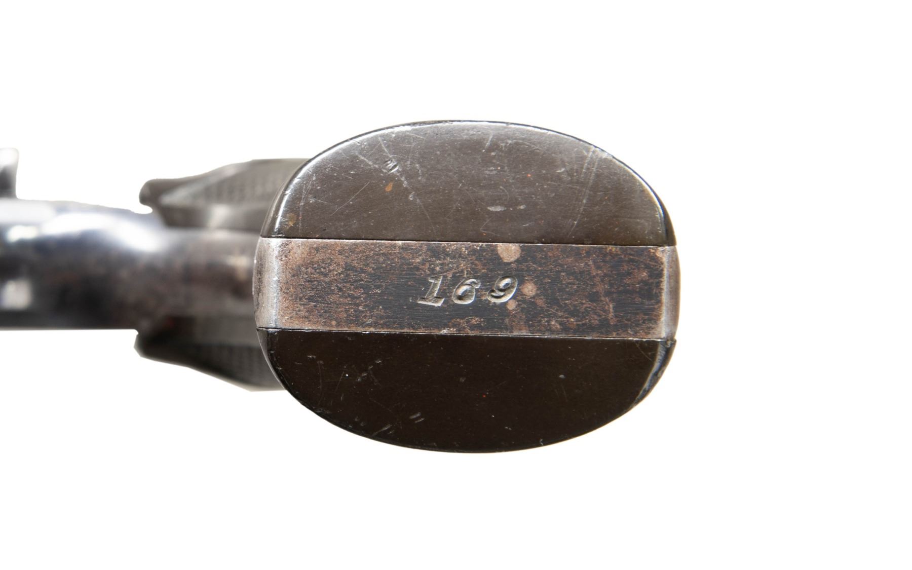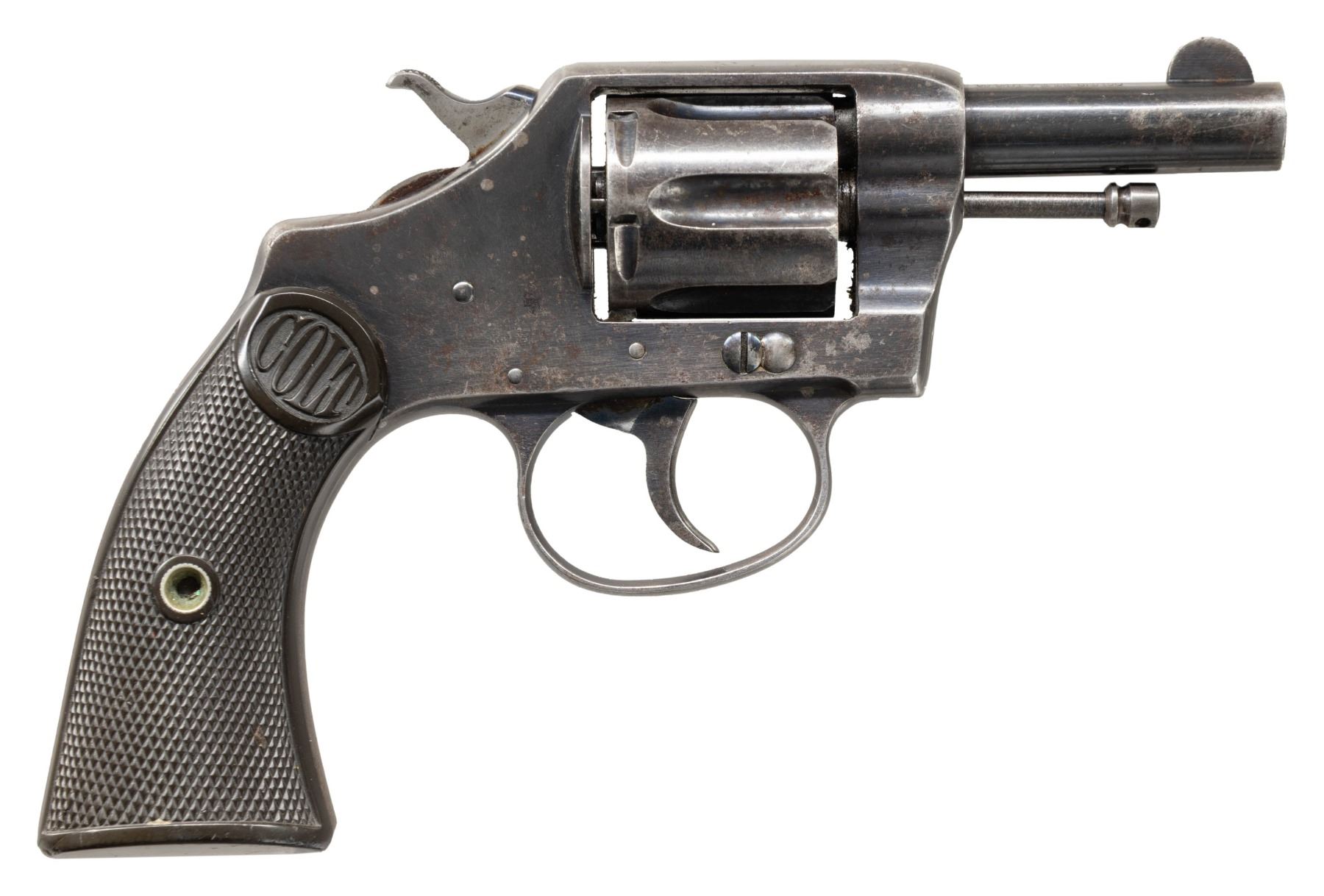 ACTION REVOLVER. Cal. 32. S# 169. Bbl. 2 7/16". Extremely early New Police double action revolver mfg. in 1897 (first year of production). Left side of the bbl. is marked "COLT. D.A. 32", with Colt's 3-line mfg. and patent information marked across the top. Left side of the frame is marked with the Rampant Colt logo surmounted by "(MALTESE CROSS) COLT'S (MALTESE CROSS)/ NEW POLICE". Metal components exhibit a blue finish overall, with the trigger and top/rear strap of the hammer exhibiting a nitre blue finish. Sides of the hammer are polished in-the-white. Frame is mounted with 2-piece "COLT" checkered brown hard rubber grips. Standard fixed half-moon blade front sight and frame notched rear sight. All serialized parts are matching, including the frame (butt and interior) and cyl. crane. Grips are matching via "169", which is etched on the interior of the panels. CONDITION: metal components retain good amounts of their original factory blue finish, exhibiting areas of wear and thinning that are fading to gray patina, some superficial handling marks, as well as scattered spots of light surface oxidation and pitting overall. Top strap of frame exhibits an area of consistent mild to moderate pitting. Grip straps have faded to a mostly mottled gray patina. Bore is relatively bright, exhibiting scattered patches and areas of mild to moderate pitting, while retaining strong rifling throughout. Proper manual mechanics. Grips show some smoothing, as well as scattered superficial marks from handling and storage, but otherwise remain sound. An extremely early 3-digit Colt New Police revolver. (01-28754/MLW). ANTIQUE. $300-500.