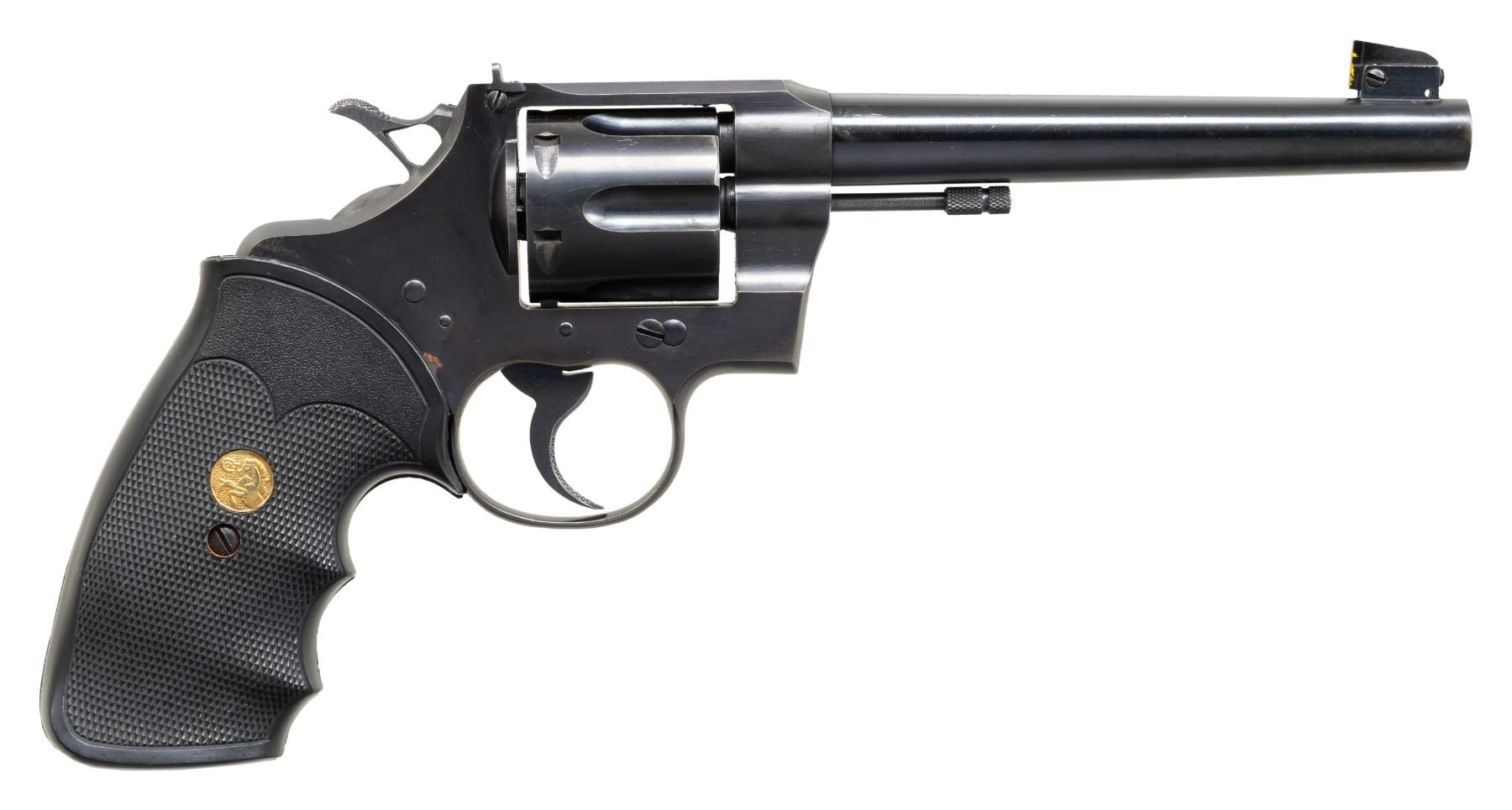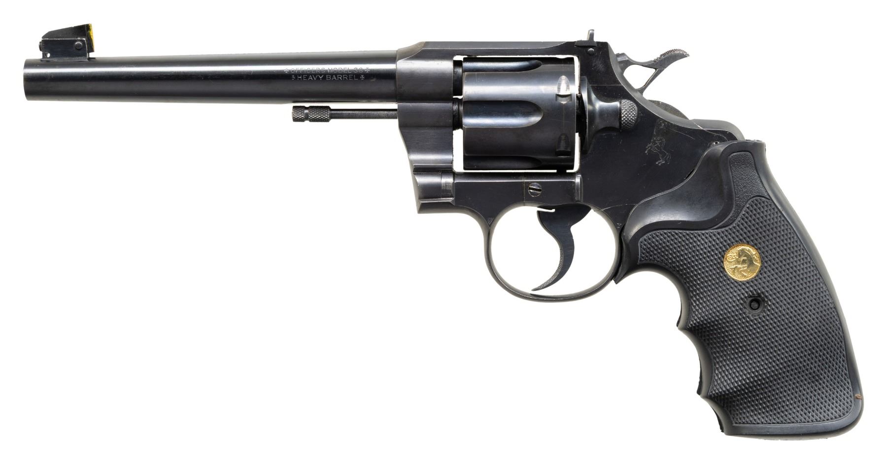 REVOLVER. Cal. 38 Spl. S# 625737. Bbl. 6". Officers Model .38 Heavy bbl. double action revolver mfg. by Colt in 1938 (serialized in sequence with the Official Police revolver). The left side of the bbl. is marked "OFFICERS MODEL 38/ HEAVY BARREL" (both lines between Maltese crosses), with Colt's 2-line mfg. and patent information marked across the top. Left side of the frame is marked with the Rampant Colt logo. Metal components exhibit a blue finish overall, with the top strap of the frame exhibiting a matte blue finish. Sides of the hammer are polished in-the-white. Frame is mounted with a later production 1-piece Colt gold medallion checkered black rubber Pachmayr "Gripper" grip. Patridge blade front sight (rear face painted yellow) with adj. square notch rear sight. Hammer has been "skeletonized" via the removal of a tear dropped section of material at the spur area, with 3 grooves added forward of the checkered panel on the spur. Custom tuned action allows only single action function, with double action rotating the cyl., but not cocking the hammer. All serialized parts are matching and include the frame and cyl. crane. CONDITION: metal components retain the majority of their original factory blue finish, exhibiting some light edge wear, scattered superficial handling marks, as well as some scattered spots of light to mild surface oxidation overall. Underside of frame and trigger guard bow exhibit areas of wear and thinning fading to brown patina. Mirror bore, exhibiting a few small spots of light pitting, while retaining well defined rifling throughout. Proper manual mechanics in-line with aforementioned action tuning statement. Grip shows some light wear, with a tear stemming from the butt and running up the rear grip strap area. (25-5114/MLW). CURIO. $400-600.