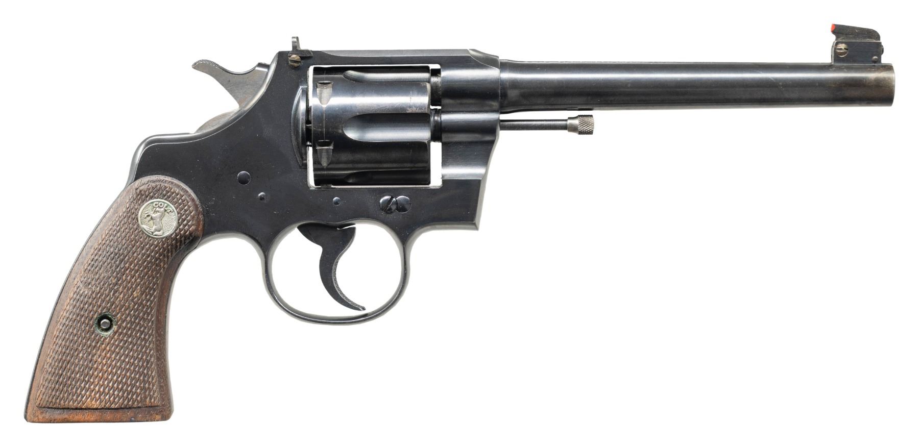 Cal. 38 Spl. S# 532256. Bbl. 6". Officers Model Target double action revolver mfg. by Colt circa. 1926 (serialized in sequence with the Army Special revolver). Left side of the bbl. is marked "(MALTESE CROSS) OFFICERS MODEL 38 (MALTESE CROSS), with Colt's 2-line mfg. and patent information marked across the top. Left side of the frame is marked with the Rampant Colt logo. Left side of the frame is electro-penciled with an apparent "Property of/ Kenneth R Smith" beneath the grip panel. Metal components exhibit a blue finish overall, save for on the sides of the hammer, which are polished in-the-white. Frame is mounted with 2-piece Colt silver medallion checkered wood grips. Partridge blade front sight with red synthetic bead and dovetailed adj. square notch rear sight. Checkered trigger and back strap. Matching numbers are present on the frame and cyl. crane. CONDITION: metal components retain the vast majority of their original factory blue finish, exhibiting some light edge wear, some superficial handling marks, as well as some small scattered spots of light surface oxidation. Sides of the bbl. exhibits patches of wear and thinning that are fading to brown patina on either side of the muzzle. Mirror bore, exhibiting some very light pitting, while retaining well defined rifling throughout. Proper manual mechanics. Grips show some light smoothing, as well as some superficial marks and impressions from handling and storage, with the left panel exhibiting a chip along the butt. (25-5118/MLW). CURIO. $500-800.