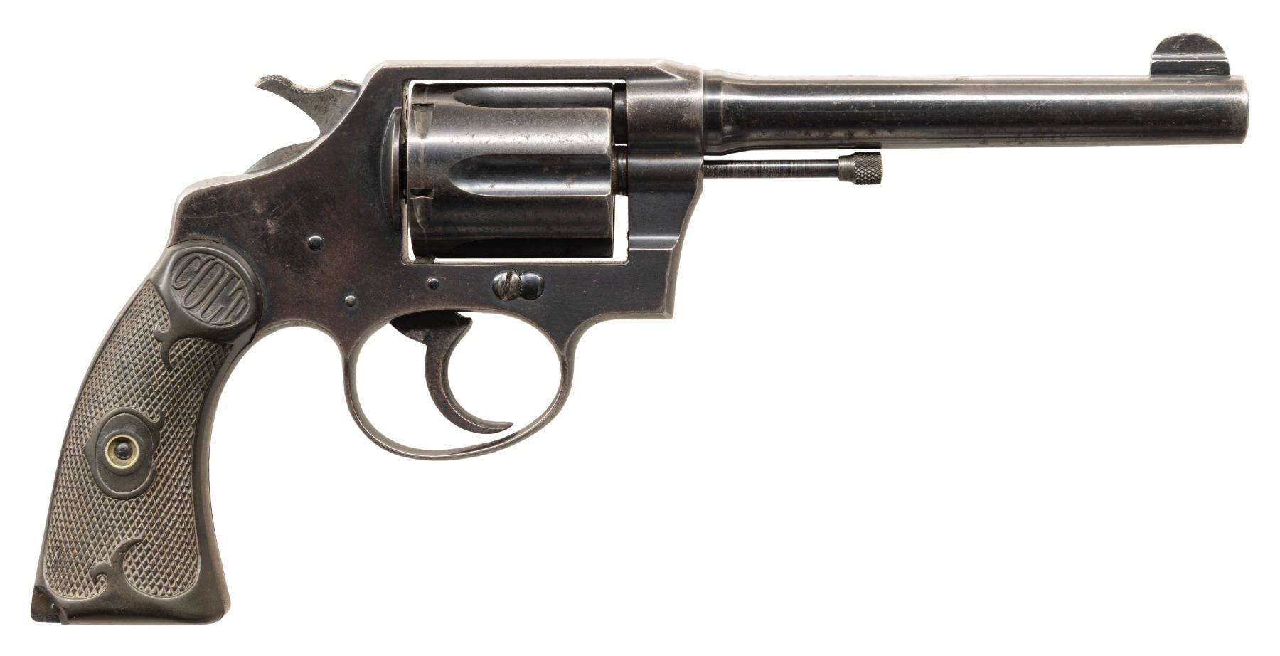 Cal. 38 Spl. S# 264364. Bbl. 5". Round blade front sight. Fixed rear sight. 1922 made Police Positive Special revolver. 6-shot cyl. Blued finish. Checkered brown hard rubber grips with mismatch pencil numbers inside. CONDITION: right grip panel shows a notable chip at bottom rear, grips otherwise show scattered staining, overall checkering wear & handling marks. Metal retains 40% original blue with overall fading, scattered oxidation, light dings, handling marks & edge wear. Action functions properly when hand cycled. Very good bore with strong rifling. (25-6542/MJC). CURIO. $250-450.