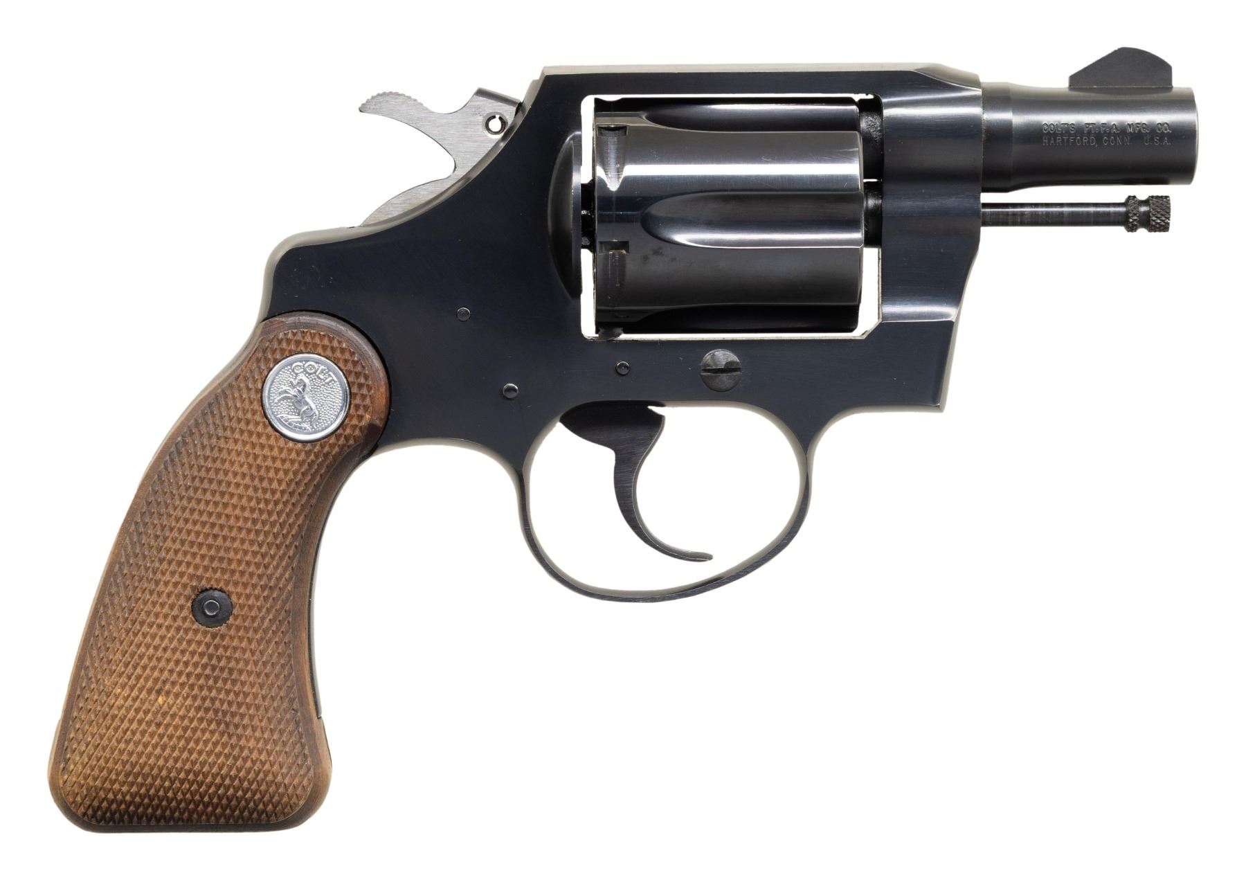 ACTION REVOLVER. Cal. 38 Spl. S# 921540. Bbl. 2". Detective Special double action revolver mfg. by Colt in 1966. Left side of the bbl. is marked "DETECTIVE SPEC./ .38 SPECIAL CTG.", with Colt's 2-line address marked on the right. Left side of the frame is marked with the Rampant Colt logo. Metal components exhibit a blue finish overall, save for on the sides of the hammer, which are polished in-the-white. Frame is mounted with 2-piece Colt silver medallion checkered wood grips. Standard fixed blade front sight and square frame notched rear sight. Matching numbers are present on the frame and cyl. crane, with the grips matching via "540" in white grease pencil. CONDITION: metal components retain the vast majority of their original factory blue finish, exhibiting some light edge wear, as well as a few scattered spots of light surface oxidation. Cyl. exhibits a light dragline. Mirror bore, exhibiting some streaks of hardened grease, while retaining well defined rifling throughout. Proper manual mechanics. Grips show some light smoothing and a few superficial handling marks, but otherwise remain very good overall. (25-4677/MLW). CURIO. $400-600.
