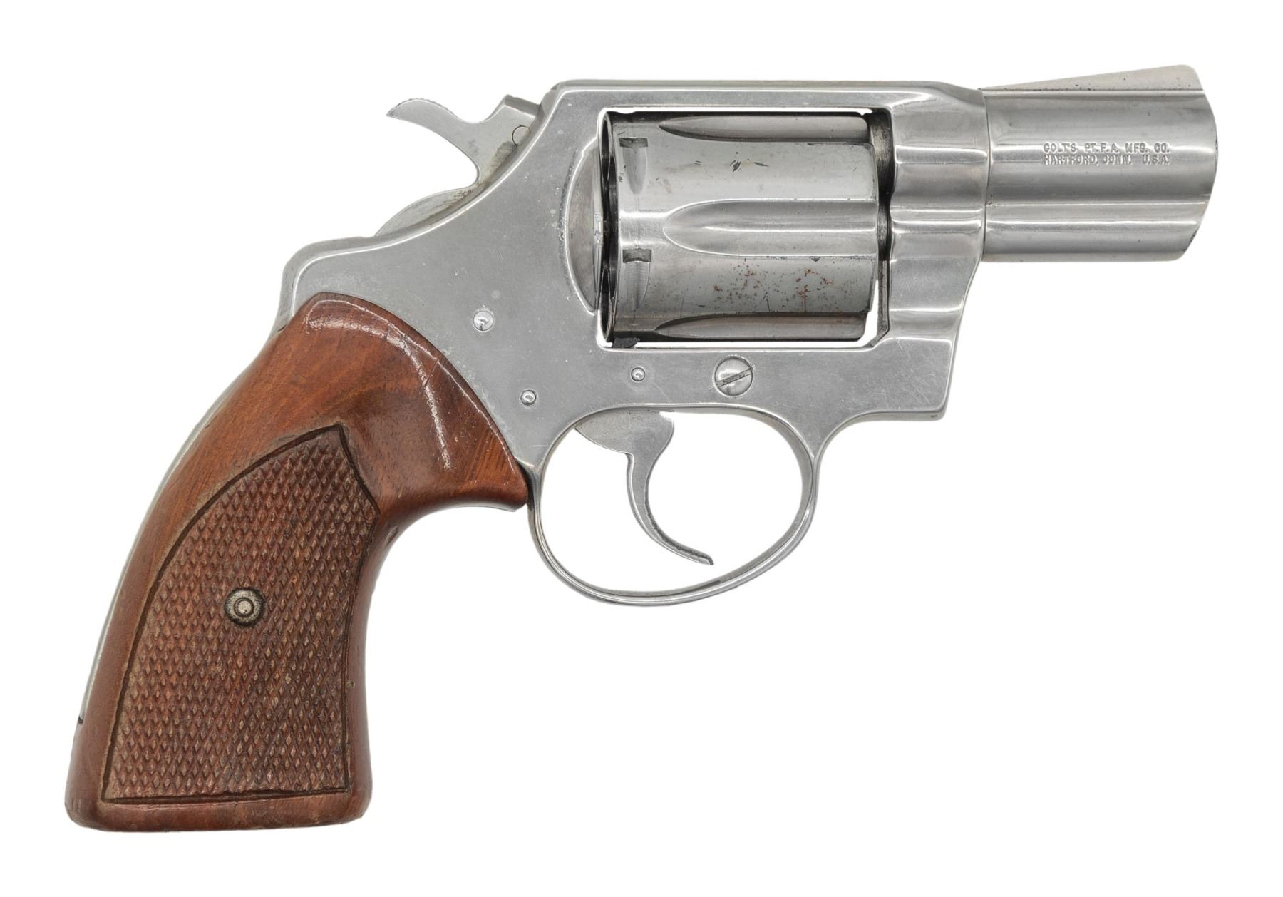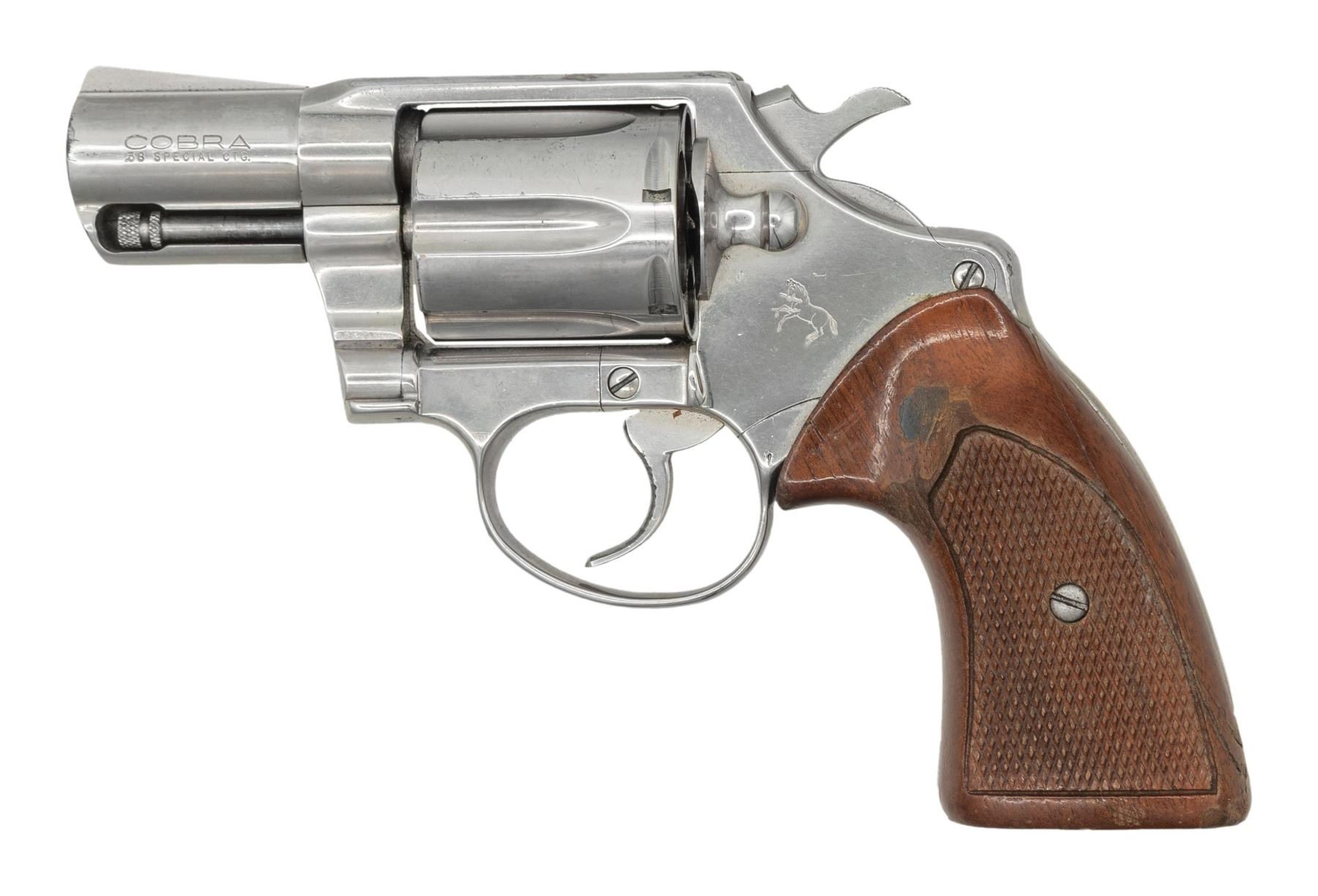 Cal. 38 Spl. S# C99081. Bbl. 2 1/8". Cobra double action revolver mfg. by Colt. Left side of the bbl. is marked "COBRA/ .38 SPECIAL CTG.", with Colt's 2-line mfg. information marked on the right. Left side of the frame is marked with the Rampant Colt logo. Metal components (including the aluminum frame) exhibit a nickel plated finish overall. Frame is mounted with 2-piece checkered wood grips. Ramped blade front sight with frame square notch rear sight. CONDITION: metal components retain the majority of their original nickel plated finish, exhibiting scattered superficial handling marks, with spots / small areas of flaking. Mirror bore, exhibiting well defined rifling throughout. Proper manual mechanics in SA and DA. Grips show scattered handling marks and some areas of wear to the varnish, with 1 large and 1 small crack present on the rear of the left panel. (25-4862/MLW). MODERN. $350-550.