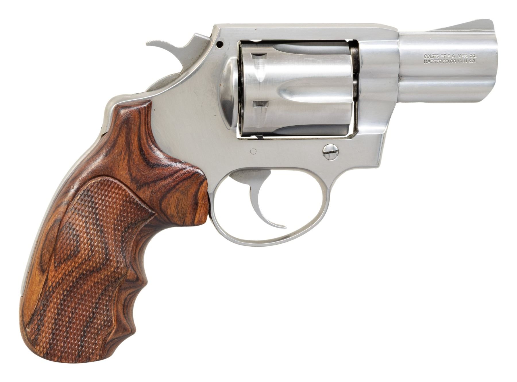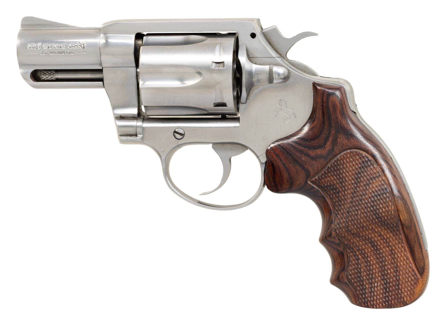 1) COLT MAGNUM CARRY DOUBLE ACTION REVOLVER. Cal. 357 Mag. S# SY1139. Bbl. 2 1/8". Magnum Carry double action revolver mfg. by Colt in 1998. Left side of the bbl. is marked with the model and cal. designations, with Colt's 2-line address marked on the right. Left side of the frame is marked with the Rampant Colt logo. Metal components exhibit a stainless steel finish overall. Frame is mounted with a 1-piece checkered laminated wood grip. Standard fixed blade front sight and square frame notched rear sight. Matching numbers are present on the frame and cyl. crane. Sides of the frame (at hammer) and the top of the rear grip strap exhibit drilled and threaded holes. CONDITION: very good, with some scattered superficial handling marks present overall. Mirror bore, retaining well defined rifling throughout. Proper manual mechanics. Grip shows some light wear, as well as some minor separation on the upper section of the front grip strap but otherwise remains sound. (25-4661/MLW). MODERN.