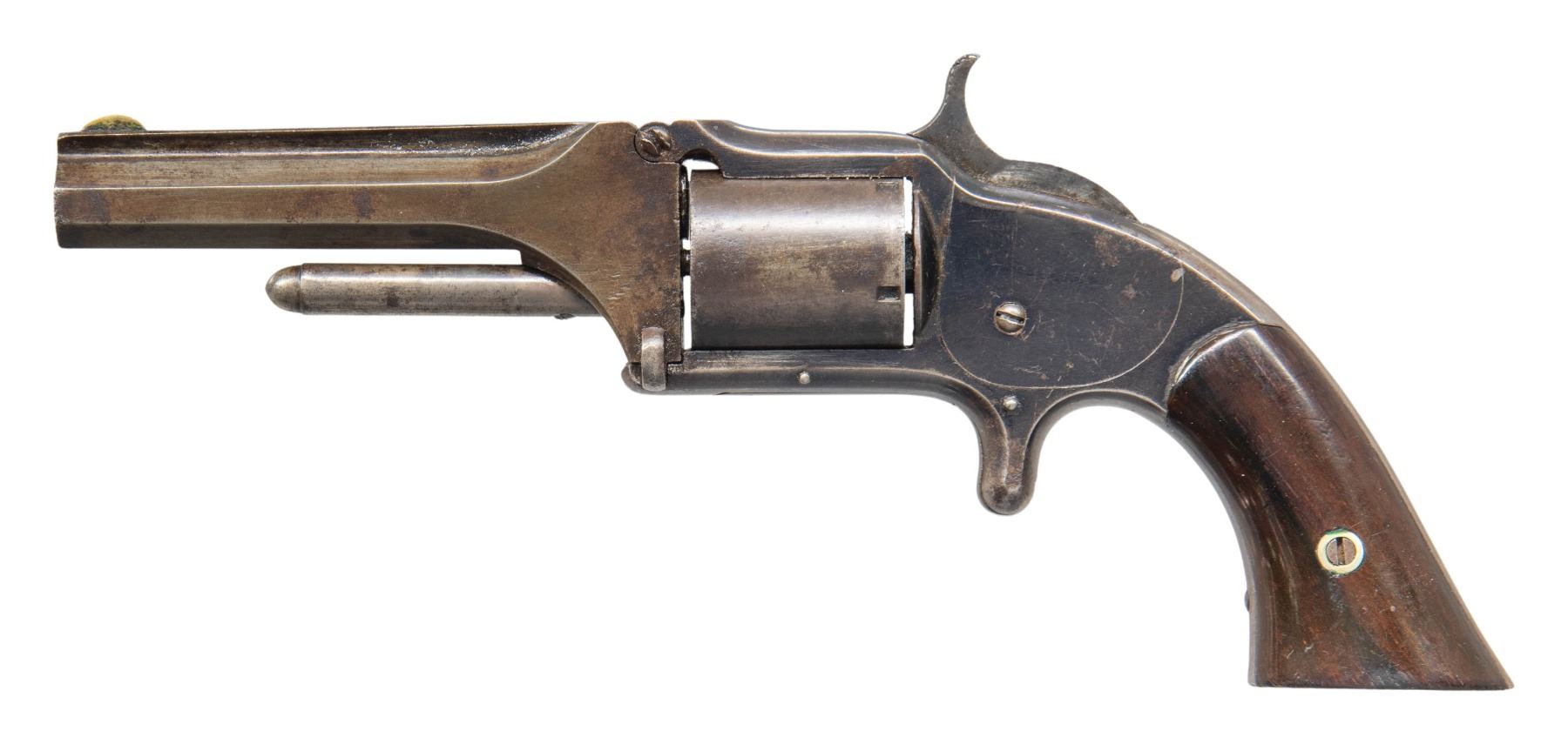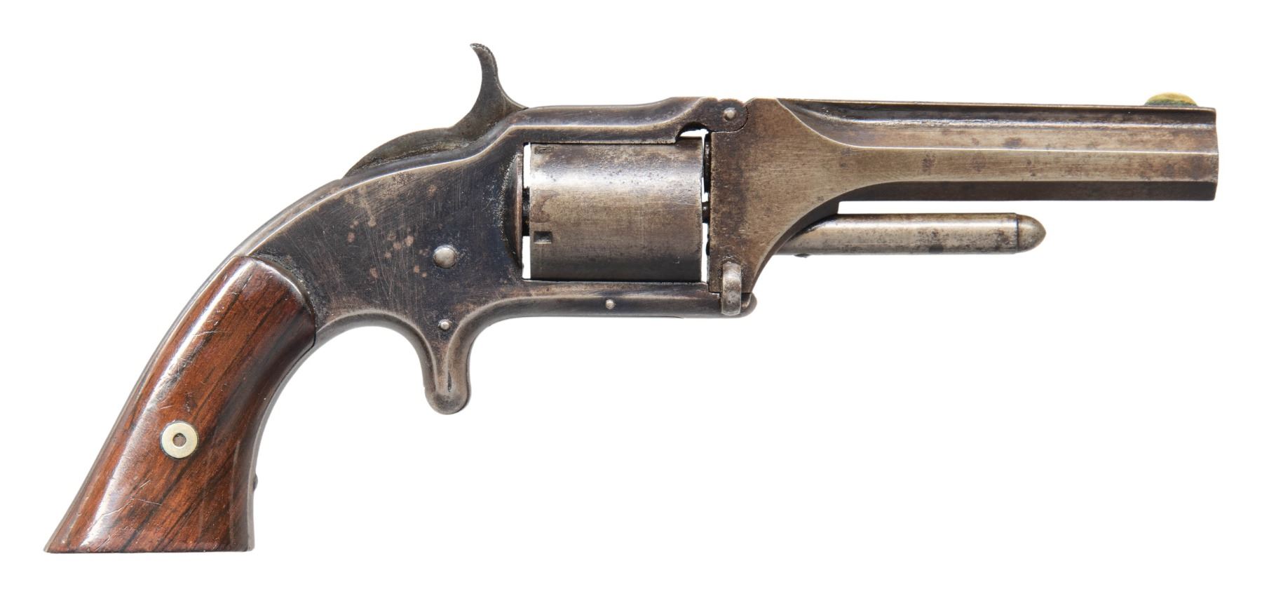 Cal. 32 RF. S# 6602. Bbl. 3 1/2". Round blade front sight. Matching assembly numbers on grip frame, bbl. & cyl. First issue Model 1 1/2 revolver. Blued finish. Smooth hardwood grips with matching numbered right panel. CONDITION: grips show an older added finish with flaking, dings & scratches. Metal retains perhaps 20% blue with overall fading to gray, scattered oxidation, pitting, handling marks & edge wear. Action is loose but appears functional when hand cycled. Bore shows pitting & oxidation along its length with evident rifling. (01-28218/MJC). ANTIQUE. $700-1,000.