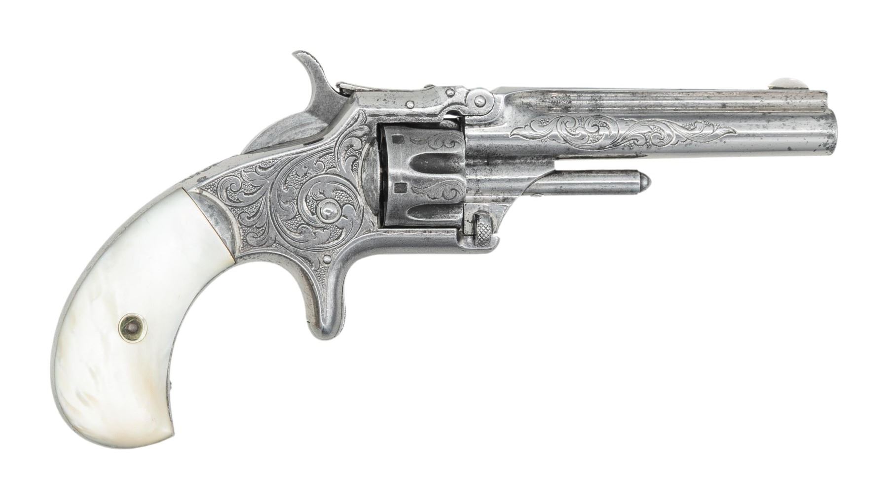 Cal. 22 S. S# 70696. Bbl. 3 3/16". Round blade front sight. 3rd issue No. 1 Revolver. Nickel finish with case colored hammer & trigger. Metal has what appears to be period floral engraving with about 75% coverage. Pearl style grips. UNATTACHED ACCESSORIES: rosewood case with red velvet lining. CONDITION: grips show some dings & handling marks. Trigger & hammer retain traces of their case colors with overall fading to gray, some operational wear & oxidation. Balance of metal retains most of its nickel finish with evidence of polishing, cleaned oxidation, pitting dings & handling marks. Frame & bbl. are loose, cyl. is loose, hammer goes to full cock but does not have all clicks & may need attention. Bore shows pitting along its length but good rifling. (01-27893/MJC). ANTIQUE. $500-800.