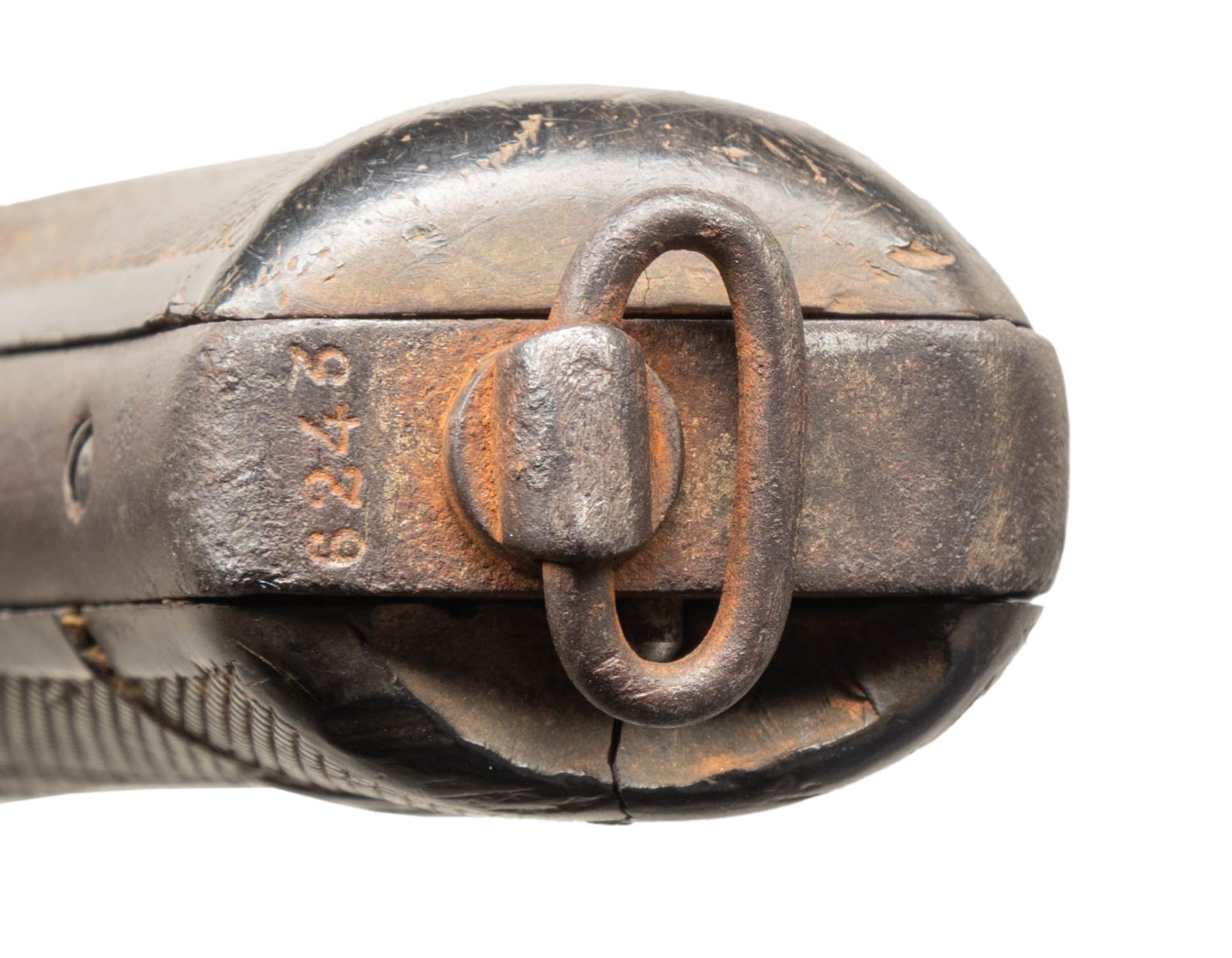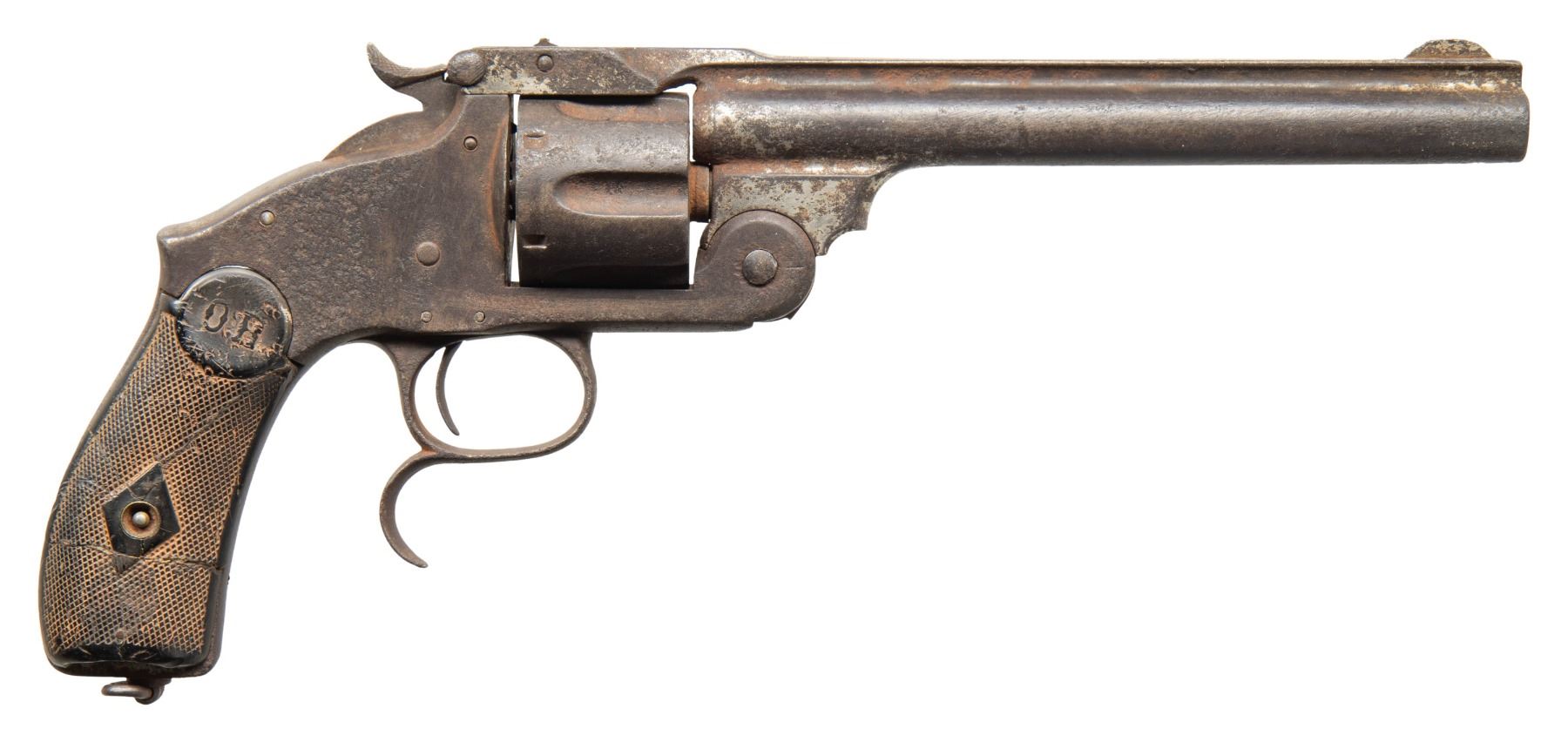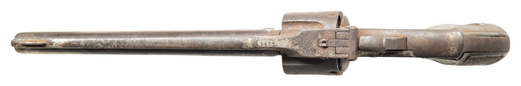 ARMY. Cal. 44. S# 6243. Spanish copy S&W by Orbea Hermanos, 7" barrel, Mexican Army inventory number added on top strap "1455". UNATTACHED ACCESSORIES: collection tag "Smith & Wesson Russian (Spanish) copy—Mexican Army / #6243-butt (1455-Amry Issue no.)". CONDITION: fair to good overall, appears complete & original, heavy iron patina, no discernible maker's or RM markings, checkered grips heavily worn and one glue repaired. Still functions well, discernible rifled bore. PROVENANCE: Estate Collection of Compton LaBauve Jr. (01-28908/JS). ANTIQUE. $700-900.