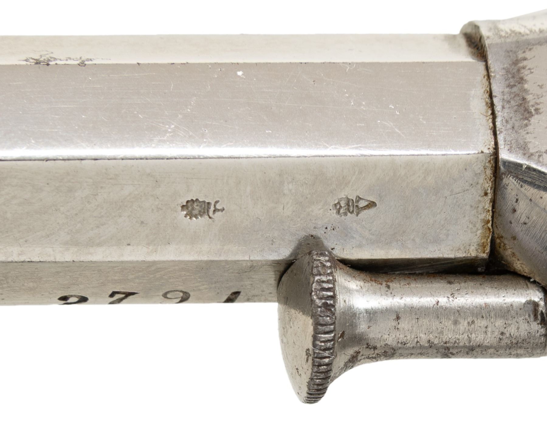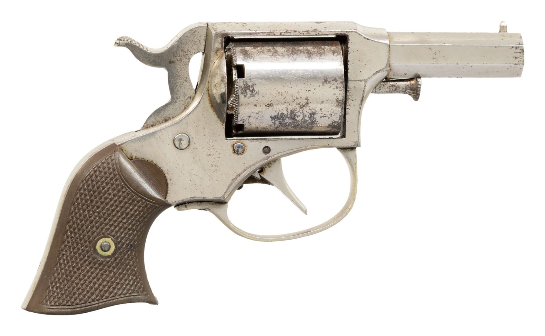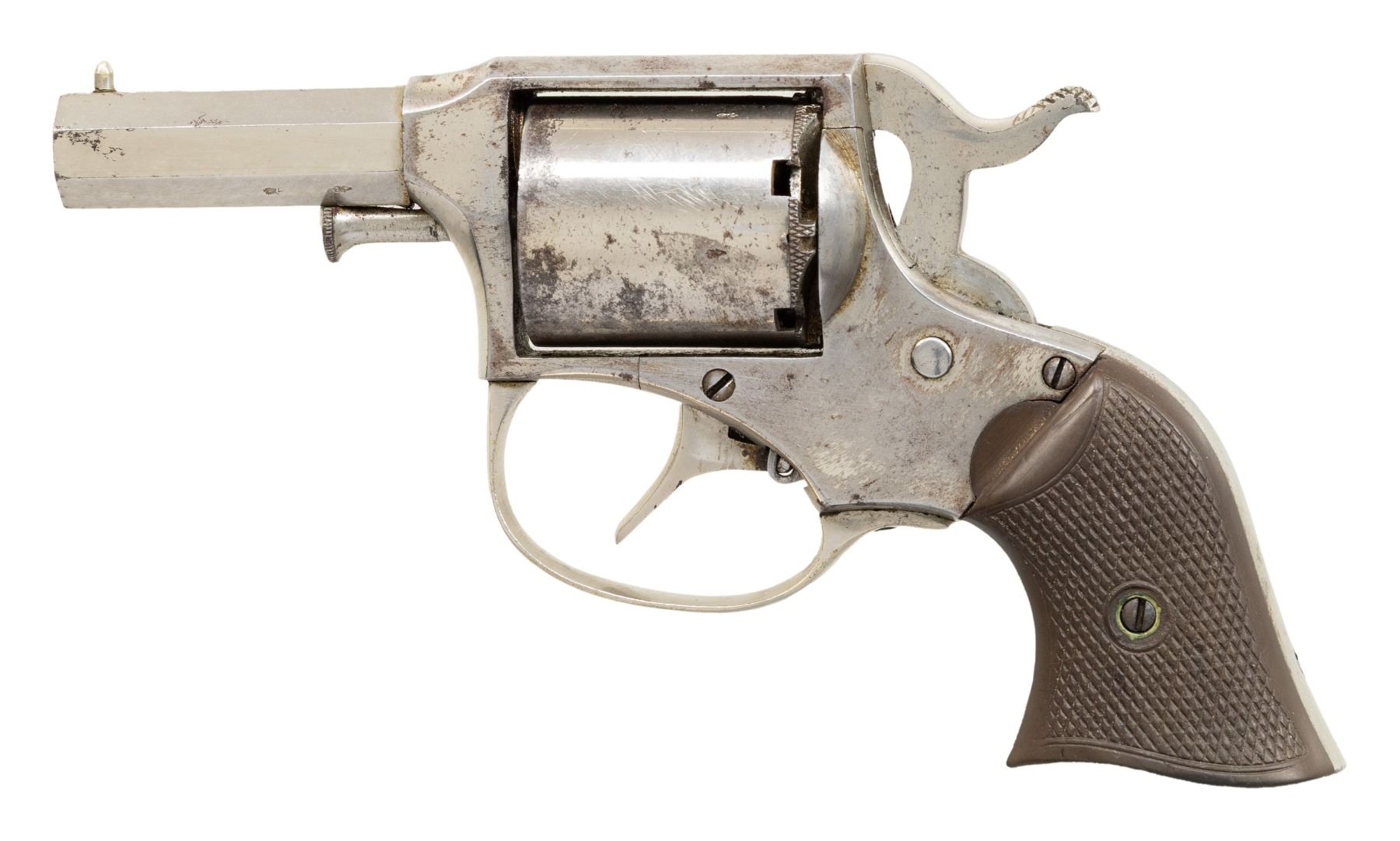 CONVERSIONPOCKET MODEL DOUBLE ACTION REVOLVER. Cal. 32 RF. S# 2791. Bbl. 2". 1 of only approx. 2,000 (total production between the percussion and cartridge conversion) Pocket Model double action revolvers mfg. by Remington circa. 1860-1873. The top flat of the octagonal bbl. is marked "REMINGTON'S ILION. N.Y.", with a pair of diminutive British Crown/GP and Crown/V proofs marked on the lower left quarter flat (British proofs repeated around circumference of cyl.). Metal components exhibit a nickel plated finish overall. Frame is mounted with 2-piece checkered brown hard rubber grips. German silver pin type blade front sight with frame V-notched rear sight. Frame and bbl. are matching via the full S# "2791", with the grips each matching via "91". Cyl. and conversion plate are matching via the assembly # "563". CONDITION: metal components retain the majority of their original factory nickel plated finish, exhibiting some scattered spots of flaking and light pitting overall. Relatively bright bore, exhibiting scattered spots and a few patches of mild to moderate pitting, while retaining strong rifling throughout. Proper manual mechanics. Grips show some light wear, as well as some superficial handling marks, but otherwise remain sound. A nice example of a late production and British proofed Remington-Rider Pocket Model revolver, considered by many to be the first double action cartridge revolver produced in the United States. (01-28566/MLW). ANTIQUE. $500-700.