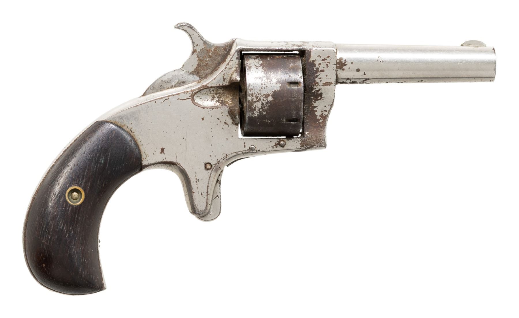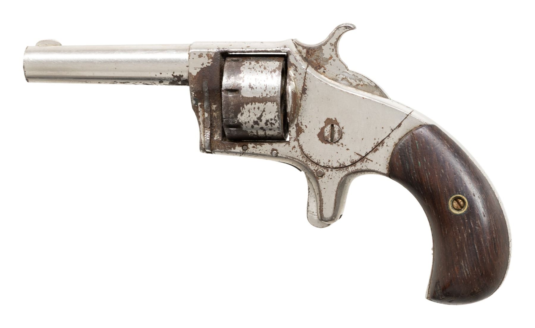 Cal. 22 Short. S# 5620 (under grips). Bbl. 2.5". Nickel finish. 7 Shot cyl. Spur trigger. 2 Piece walnut grips. CONDITION: fair peeling nickel with marks & oxidation. Fair grips with large chip & break on left panel. Pitted bore. Hammer periodically doesn't rotate cyl. Replacement cyl. pin. PROVENANCE: Estate of Groves Herrick. (01-28357/MD). ANTIQUE. $75-150.