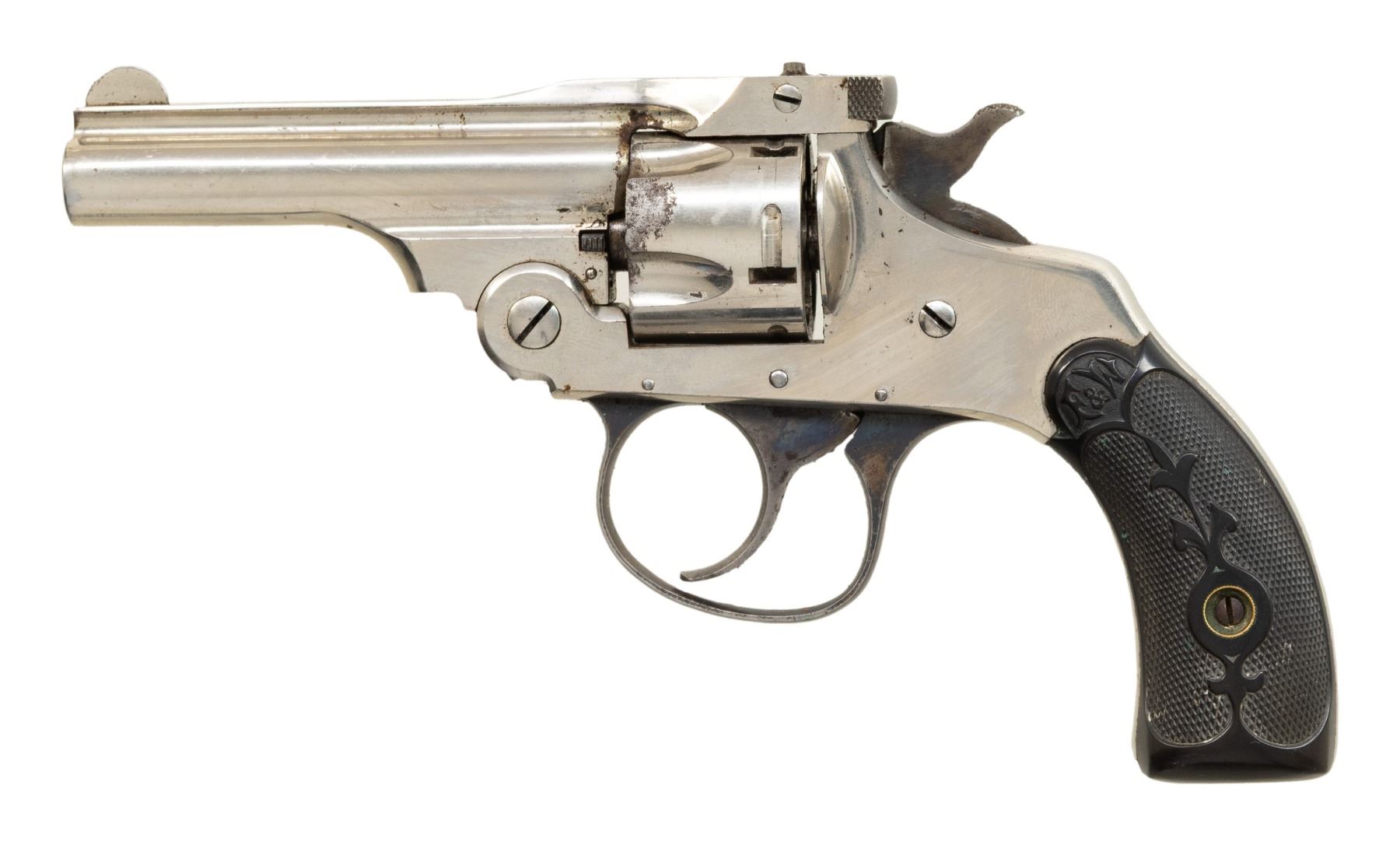 Cal. 32 S&W. S# 11017. Bbl. 3". Round blade front sight. Fixed u-notch rear sight. 5-shot cyl. Nickel finish with case colored hammer & trigger. Hard black rubber grips with F&W logo. UNATTACHED ACCESSORIES: older leather holster in fair-good condition. CONDITION: grips show some handling marks, staining & checkering wear. Trigger & hammer retain strong case colors with some oxidation & fading to gray. Balance of metal retains 80% nickel with a notable pitting patch on cyl., some oxidation more heavy on grip frame, scattered handling marks & light flaking. Cyl. has notable play when hammer is cocked & will likely require attention to fix. Bore shows scattered pitting & oxidation but visible rifling. (25-6540/MJC). CURIO. $50-100.