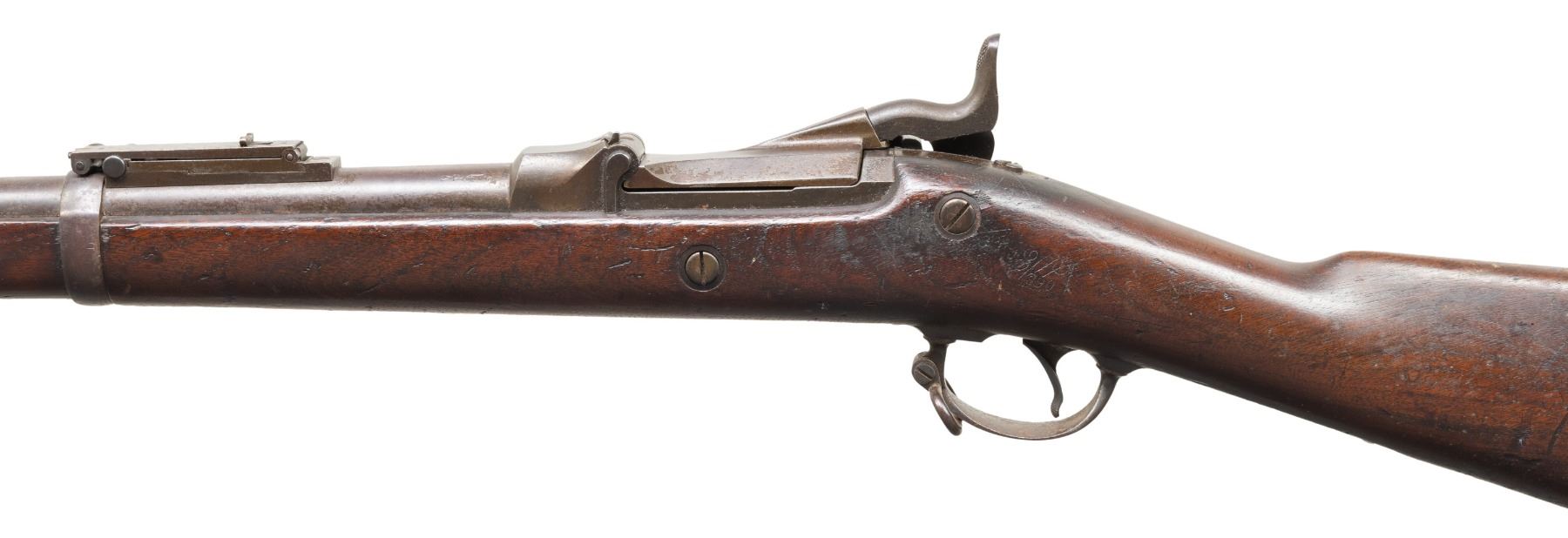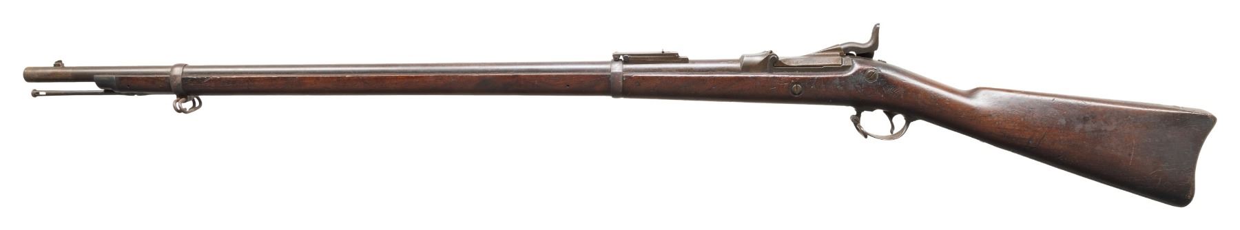 MILITARY RIFLE. Cal. 45-70. S# 498227. Bbl. 32 1/2". Barrel is marked on the left over chamber "VP / eagle's head / P". Chamber is marked on top "I". "R" marked Buffington rear sight graduated to 2,000 yards. Blade front sight. Receiver manufacture date corresponds to the the "SWP 1890" boxed acceptance mark. Breech block is faintly marked "U.S. / MODEL / 1884". Three position tumbler. Lockplate marked with the spread wing "eagle" and "U.S. / SPRINGFIELD". Walnut stock carries an encircled script "P" proof in addition to the acceptance mark. Forearm with two bands. Correct late type slotted head ramrod. Two piece trigger guard. Buttplate tang marked "U.S.". Upper band carries sling swivel and stacking swivel. CONDITION: stock set has a well-worn original finish with numerous handling marks. Scratch which resembles a crack extends rearward from breech block tang. Metal turning overall gray and patina with wear, light oxidation and scattered fine pitting. Bore has strong rifling with sharp lands, light frosting and scattered shallow pitting throughout. (01-28658/RW). ANTIQUE. $400-600.