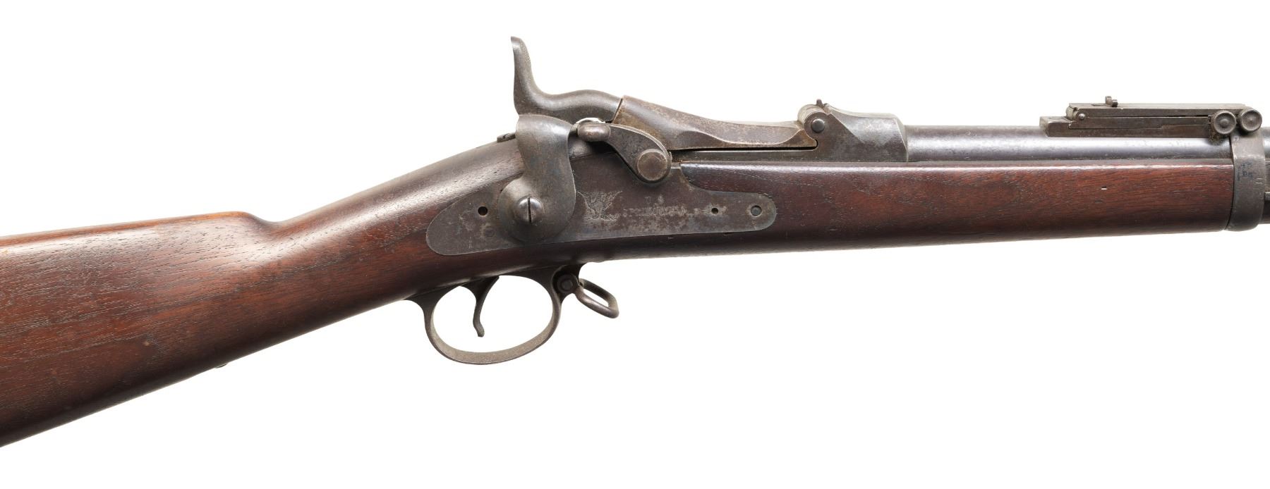 MILITARY RIFLE. Cal. 45-70. S# 518311. Bbl. 32 1/2". Barrel is marked on top over chamber with "I" and marked on the left side with "V / P / eagle's head / P". "R" marked Buffington ladder rear sight graduated to 2,000 yards. Blade front sight. Blade has been modified with solder to increase the height. The 1888 rifles are referred to as Rod Bayonet Springfields as the cleaning rod is configured to serve as a combination cleaning rod and bayonet. This rifle manufactured in 1891 carries its crisp boxed "SWP 1891" acceptance mark on the left side of stock and the encircled script "P" proof behind trigger guard tang. The rod bayonet is carried underneath the barrel and measures 35 1/2" overall. Breech block is marked "U.S. / MODEL / 1884". Lockplate has the spread wing "eagle" and "U.S. SPRINGFIELD" Three click tumbler. Two band walnut stock. Both bands carry stacking swivels. One piece trigger guard. Buttplate marked "U.S. CONDITION: stock has a moderately worn original finish with the scattered scratches and handling marks expected in a service rifle. Metal turning gray and patina with extensive areas of light oxidation and very fine pitting. Bore has strong sharp lands with a lightly frosted appearance throughout. PROVENANCE: Estate of Groves Herrick. (01-28769/RW). ANTIQUE. $400-600.