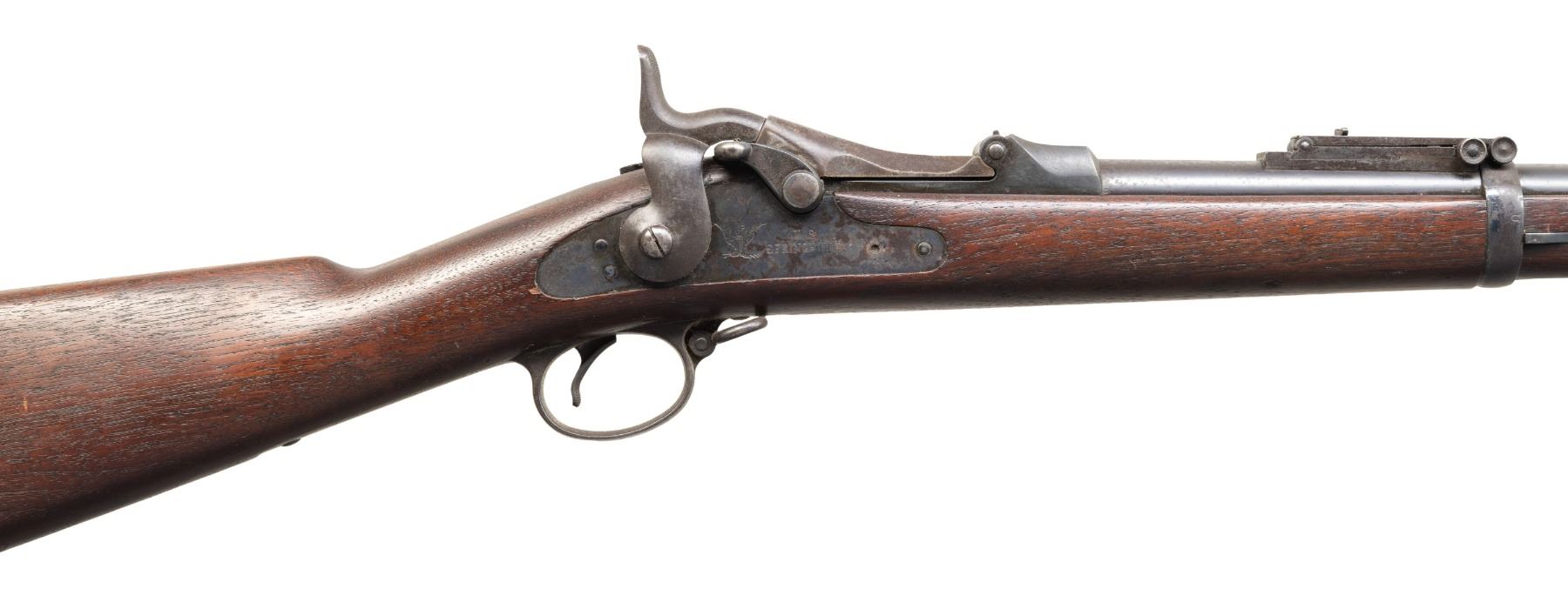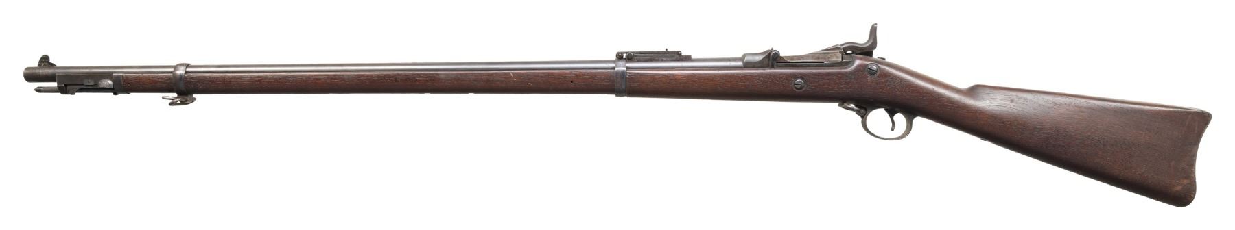 MILITARY RIFLE. Cal. 45-70. S# 516658. Receiver manufactured in 1891. Bbl. 32 1/2". Barrel marked on left rear with "VP" eagle proof. Buffington rear sight marked "R". Original front sight blade replaced with Lyman 26UA with white bead. The rod bayonet Springfield was produced as an improvement over previous models by replacing the ramrod with a combination bayonet and cleaning rod. The ramrod bayonet was not well-liked in service. Low arch 1884 dated breech block. Flat lockplate with the "U.S. SPRINGFIELD" and "eagle" markings. 3 click tumbler. Walnut stock has crisp boxed "SWP 1891" acceptance mark and encircled script "P" proof under grip. One piece trigger guard. Blued steel rod bayonet threaded on the small end, measures 35 1/2". CONDITION: stock has moderately worn original finish with scattered handling marks throughout. Metal turning gray and patina, retains 40% of its original blue with scattered spots of light oxidation. Bore has strong lands with lightly frosted grooves. PROVENANCE: Estate of Groves Herrick. (01-28373/RW). ANTIQUE. $500-900.