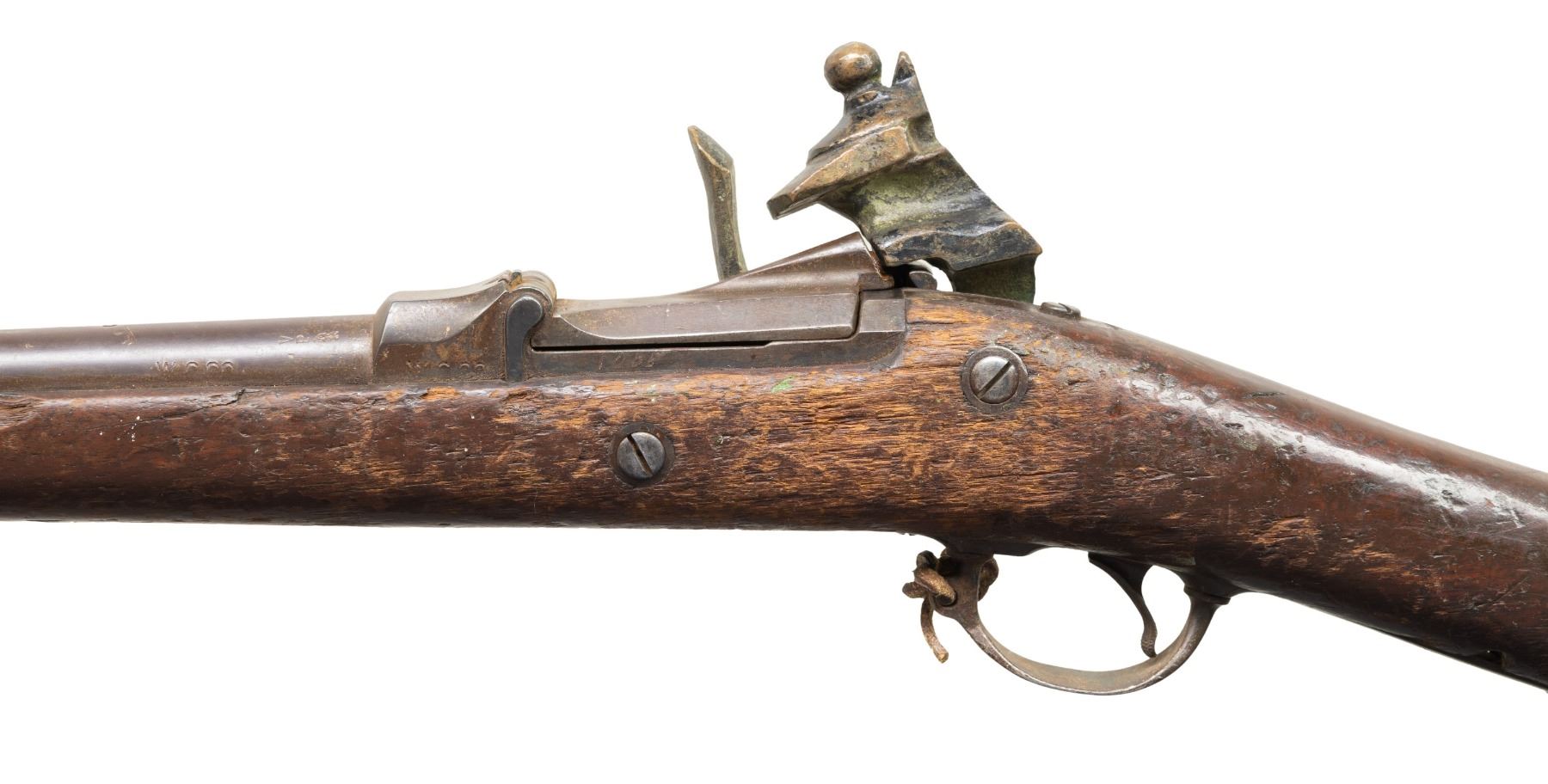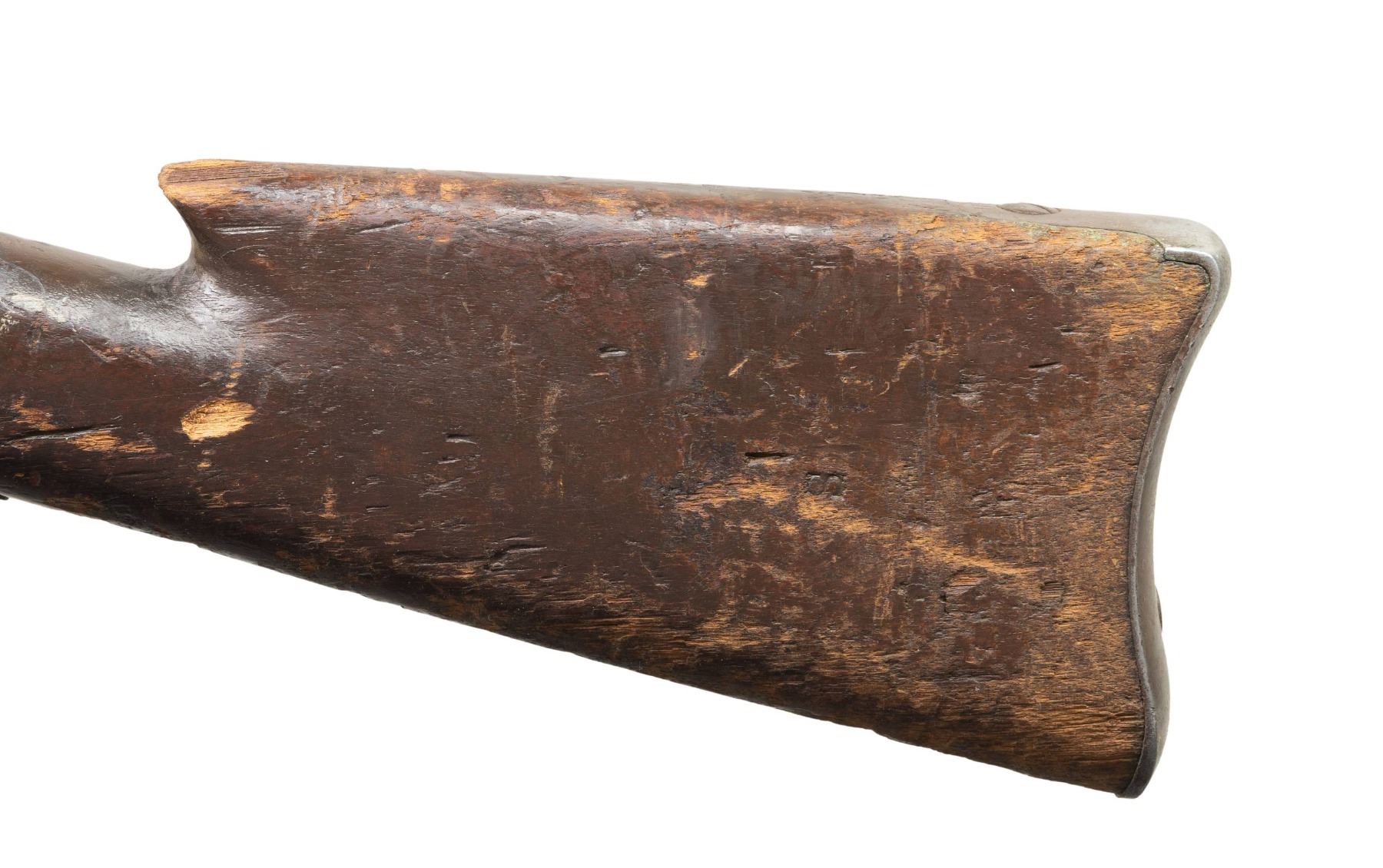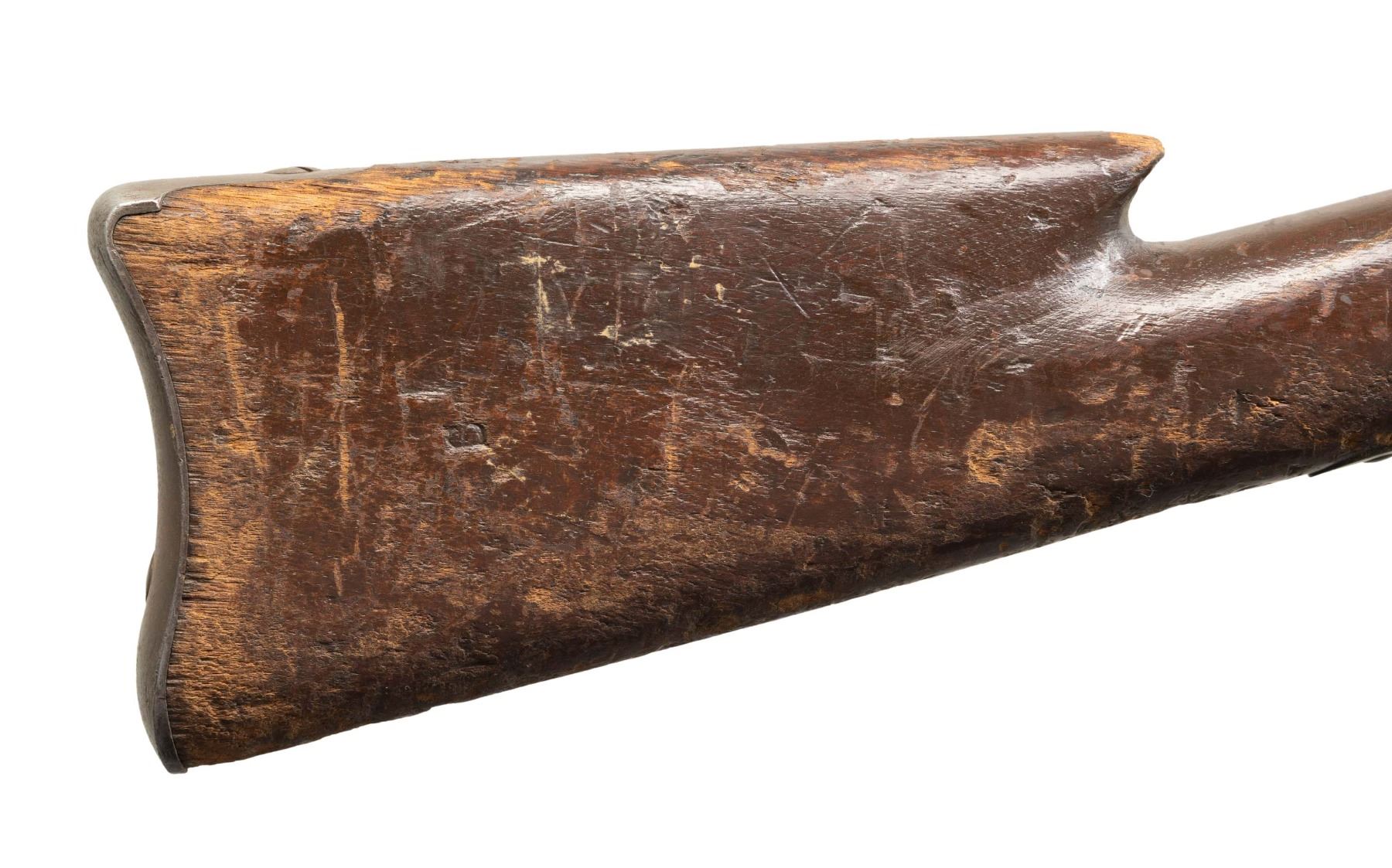 Cal. 45-70. S# 256416. Bbl. 32 1/2". Rifle is marked on receiver and barrel "WC CO", indicating ownership by the Western Costume Company, a notable supplier to the movie industry. It is also notably marked on both sides of the buttstock with an "S" which indicates it may have been property of Stembridge Movie Rentals at some point. Rifle has been converted to resemble a flintlock gun using brass castings, although the hammer will still strike the firing pin, allowing the use of blanks. The rifle will not fire as a flintlock. Rear sight has been removed. Original front sight remains in place. The walnut stock has been coated with a brown coating, resembling paint. Stock has two bands retained by springs. Sling swivels are not present. CONDITION: the rifle shows extensive hard use. The stock has heavy wear, abrasions and chips throughout. The metal has turned overall gray and patina with extensive wear and handling marks. Heavily oxidized bore with no visible rifling. Ramrod is not readily removed. Stock has two small transverse holes, likely to allow for use of rope sling. PROVENANCE: From the PMRB Collection. (01-28430/RW). ANTIQUE. $400-600.