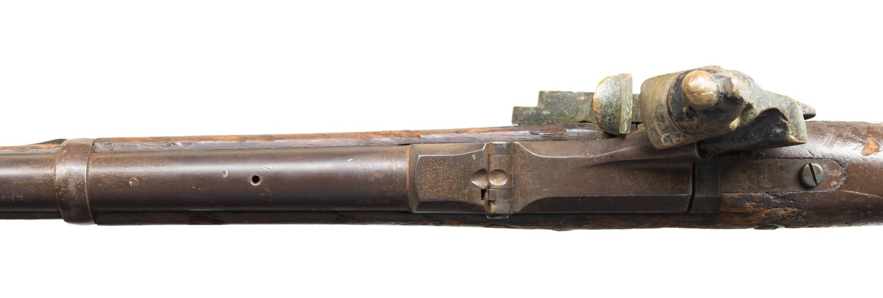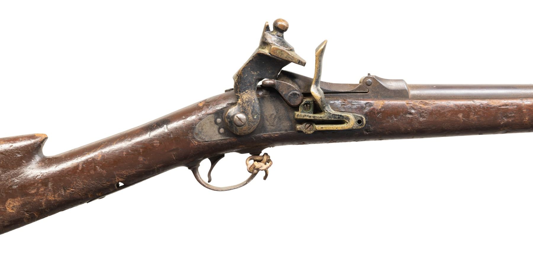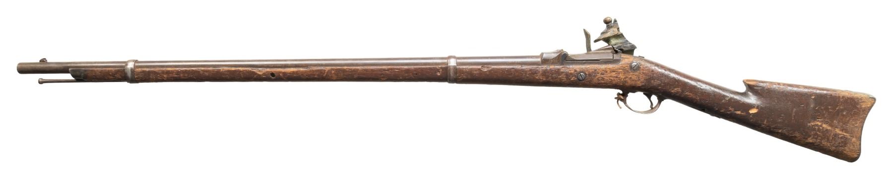 Cal. 45-70. S# 256416. Bbl. 32 1/2". Rifle is marked on receiver and barrel "WC CO", indicating ownership by the Western Costume Company, a notable supplier to the movie industry. It is also notably marked on both sides of the buttstock with an "S" which indicates it may have been property of Stembridge Movie Rentals at some point. Rifle has been converted to resemble a flintlock gun using brass castings, although the hammer will still strike the firing pin, allowing the use of blanks. The rifle will not fire as a flintlock. Rear sight has been removed. Original front sight remains in place. The walnut stock has been coated with a brown coating, resembling paint. Stock has two bands retained by springs. Sling swivels are not present. CONDITION: the rifle shows extensive hard use. The stock has heavy wear, abrasions and chips throughout. The metal has turned overall gray and patina with extensive wear and handling marks. Heavily oxidized bore with no visible rifling. Ramrod is not readily removed. Stock has two small transverse holes, likely to allow for use of rope sling. PROVENANCE: From the PMRB Collection. (01-28430/RW). ANTIQUE. $400-600.