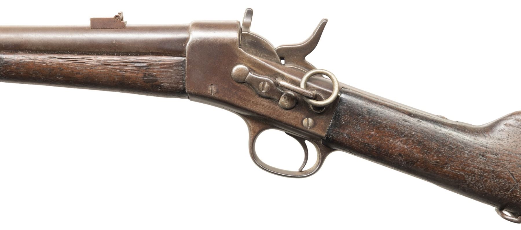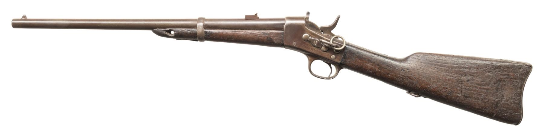 Cal. 43 Spanish. NSN. Bbl. 20 1/2". Blade front sight. Flip up rear sight. Upper tang has faint Remington markings with last patent date being 1874. This pattern carbine was known as the "Spanish Model" & was used by that country as well as Argentina. Saddle bar & ring present on left side of action. Hardwood stock set with added large hole in front of forend & only rear sling swivel present. CONDITION: heavily worn stock set shows some cracks, chips, dings, gouges, handling marks, scratches & overall wear. Metal is a dull gray patina with oxidation, pitting, edge wear & dings. Action functions properly when hand cycled. Bore shows pitting & oxidation along its length but visible rifling. (01-28657/MJC). ANTIQUE. $400-700.