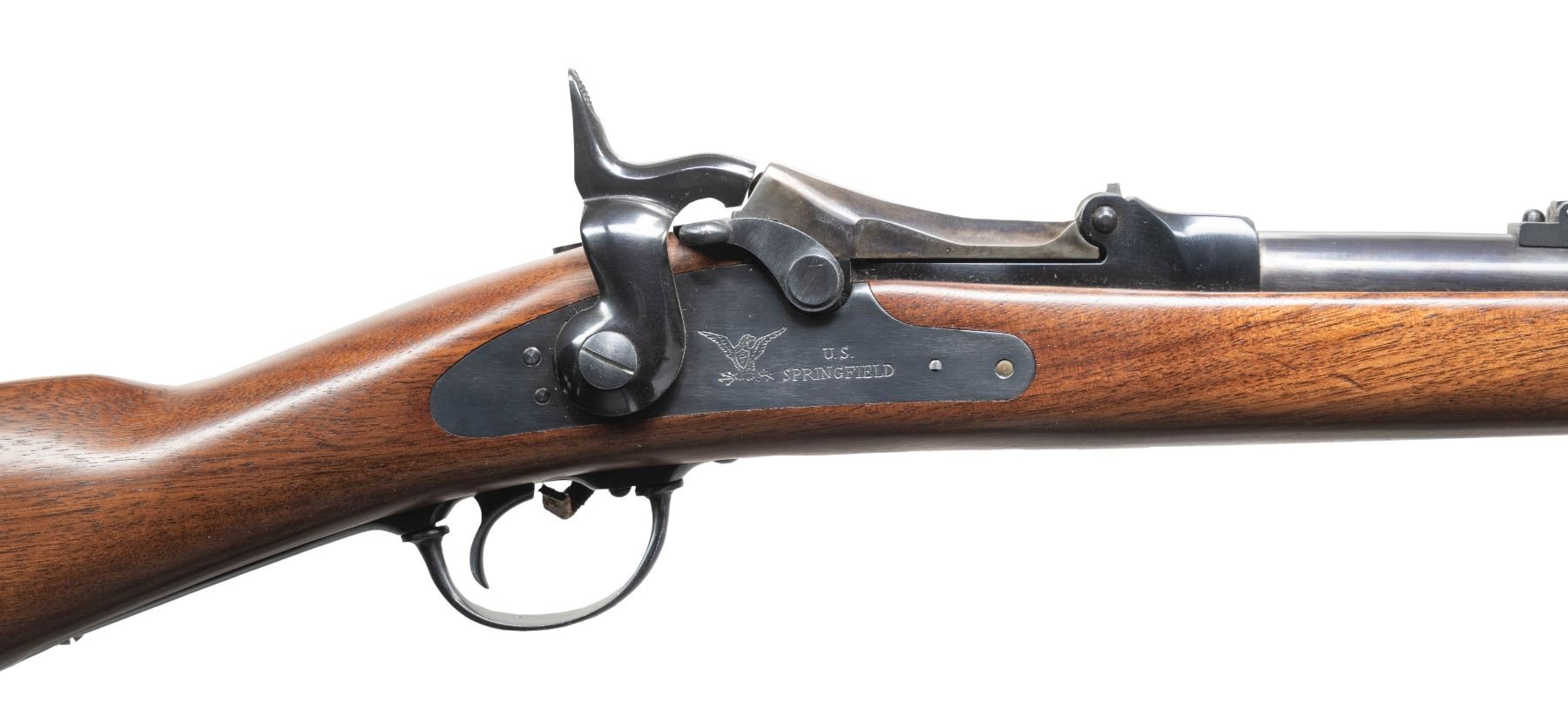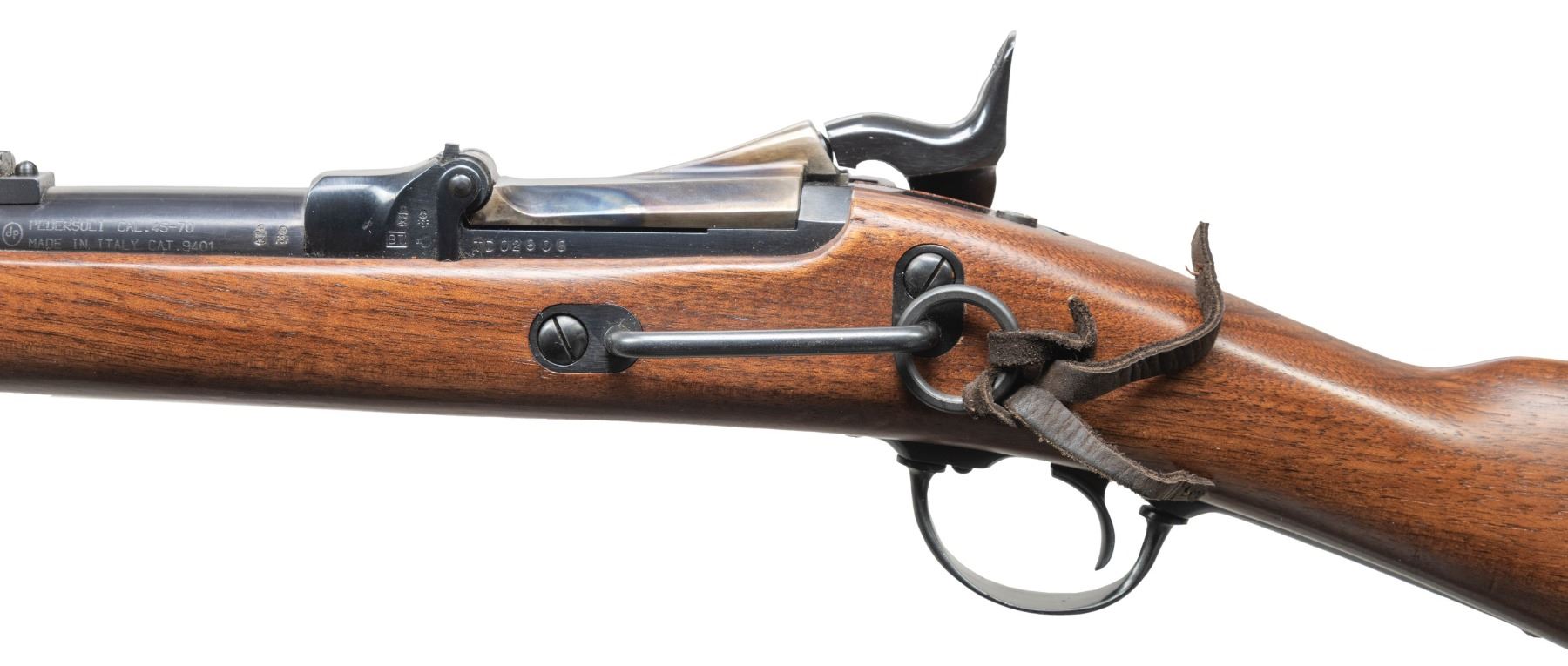 Cal. 45-70. S# TD02606. Bbl. 22". Blade front sight. Ladder rear sight graduated to 1200yds. Italian repro of an 1873 Trapdoor carbine. Lock has eagle with "US SPRINGFIELD" markings. Case colored buttplate & breechblock. Balance of other parts are blued. Walnut stock with saddle ring & bar on left side. CONDITION: stock set shows some dings & scattered handling marks. Metal retains 98% original finishes with light handling marks. Action functions properly when hand cycled. Bright near excellent bore. (25-5484/MJC). MODERN. $300-500.