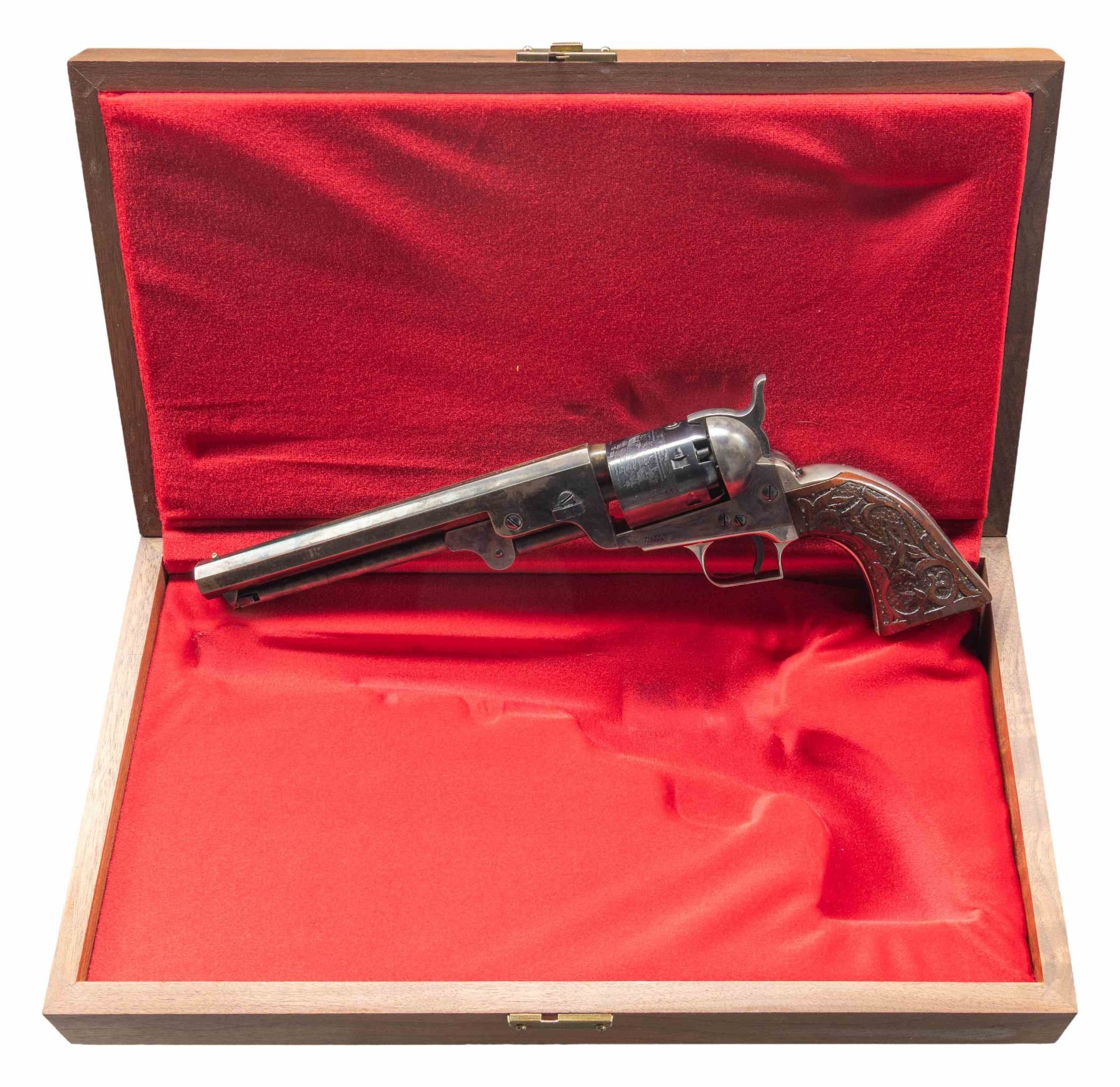 ACTION PERCUSSION REVOLVER WITH CASE. Cal. 36. S# 32411. Bbl. 7 1/2". Second Generation Model 1851 Navy single action percussion revolver mfg. by Colt. Top flat of the octagonal bbl. is marked with Colt's single line New York address. Left side of the frame is marked "COLT'S/ PATENT". Rear grip strap is engraved "Saml Colt" in script. Cyl. is roll engraved with Colt's naval engagement scene. Sides of rear grip strap have been hand engraved with a starburst motif. Case colored frame, hammer, and loading lever, with blued bbl. and cyl. Trigger guard (with flat back trigger guard bow) and rear grip strap exhibit a nickel plated finish. Frame is mounted with a 1-piece foliate relief carved and brass pinned wood grip, featuring a natural white inlaid spade on the right side. Brass blade front sight with hammer notched rear sight. All serialized parts are matching and include the frame, cyl., bbl. trigger guard, and rear grip strap. UNATTACHED ACCESSORIES: contemporary wood display case featuring a red fabric lined interior. CONDITION: frame and hammer retain large amounts of their original case colored finish, exhibiting some areas of wear and fading to gray patina, with some light pitting present on the sides of the frame. Loading lever retains fair amounts of case coloring, exhibiting areas of wear and thinning fading to gray, as well as scattered spots of light pitting. Bbl. exhibits areas of wear fading to gray and brown patinas, with the cyl. retaining the majority of its original finish. Nickel plated parts are very good to excellent overall. Mirror bore, exhibiting some light to mild pitting towards the muzzle. Proper manual mechanics. Grip is very good overall. Case is excellent, with some light superficial marks from handling and storage. (01-27895/MLW). ANTIQUE. $400-600.