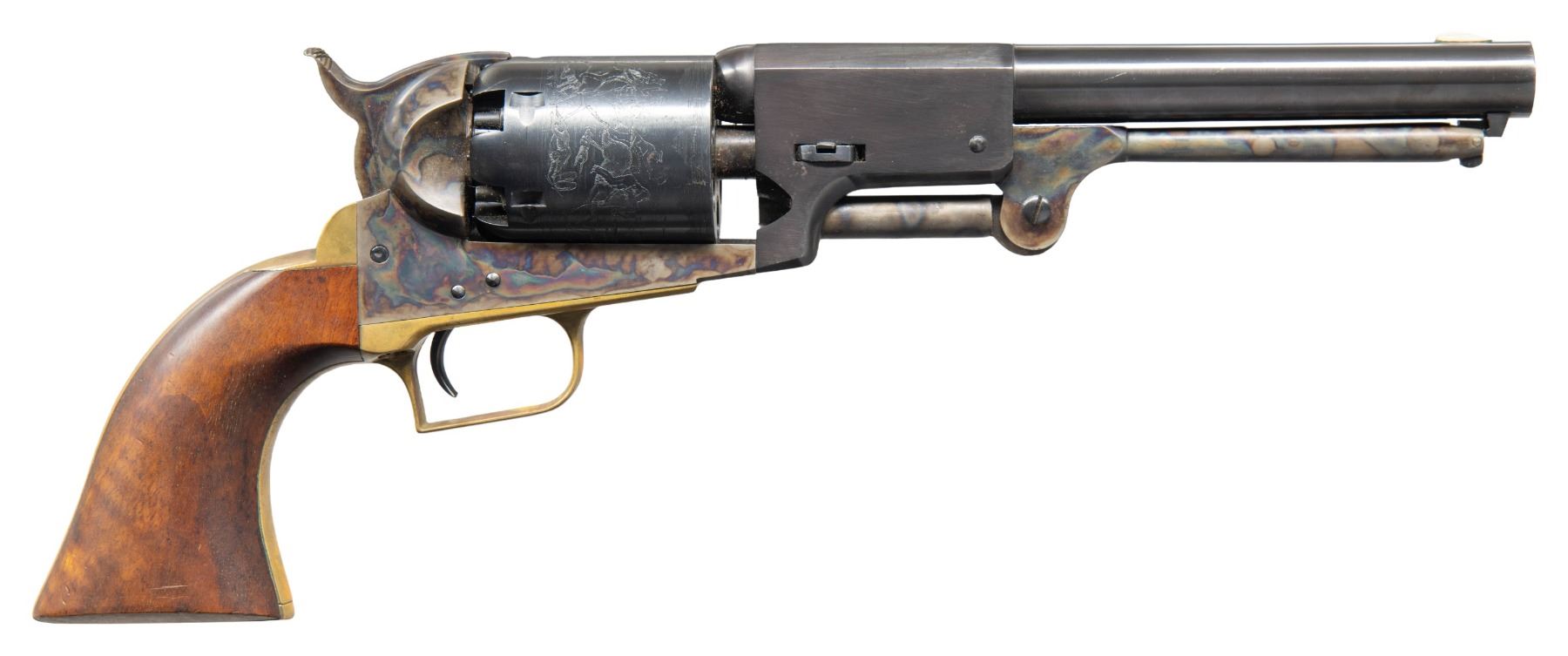 Cal. 44. S# 28012. Standard configuration 7.5" half octagonal to round barrel, blue & case colors, one line Colt New York City address, rolled dragoon-Indian fight cylinder scene, walnut grips. UNATTACHED ACCESSORIES: Colt brochure advertising "1995 Signature Series Black Powder Models" showing this model. CONDITION: revolver retains most all bright blue and case colored finish, mechanics fine, bright shiny rifled bore. (01-28708/JS). ANTIQUE. $400-600.