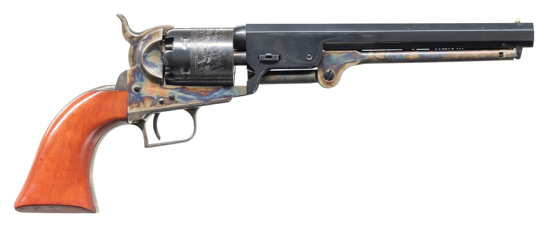 NAVY REVOLVER. Cal. 36. S# 4565. Standard configuration 7.5" octagonal barrel, blue & case colors, one line Colt New York City address, rolled naval battle cylinder scene, silver plated brass backstrap & triggerguard, varnished walnut grips. CONDITION: revolver retains most all bright blue and case colored finish, mechanics excellent, bright shiny rifled bore. (01-28671/JS). ANTIQUE. $300-500.