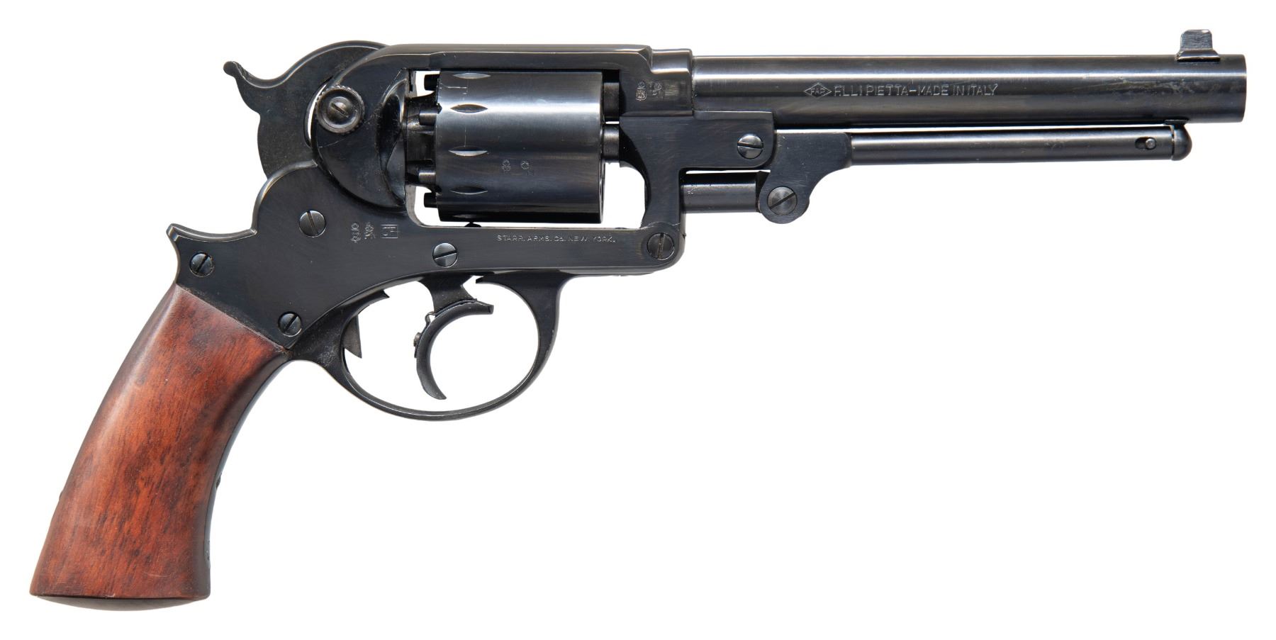SINGLE ACTION PERCUSSION REVOLVER. Cal. 44. S# 603571. Bbl. 6". Reproduction Starr Model 1863 single action percussion revolver mfg. in Italy by Pietta. Left side of the bbl. is marked "BLACK POWDER ONLY 44 CAL", with Pietta's "FAP" within a diamond logo and mfg. information marked on the right. Left side of the frame is marked "STARR'S PATENT JAN. 15. 1856" above the S#, with Italian proofs, "CF" (2010) date code, and "STARR. ARMS. Co. NEW. YORK." marked on the right. Metal components exhibit a blue finish overall. Frame is mounted with a 1-piece plain wood grip. Dovetailed blade front sight and frame notched rear sight. Cyl. matches the frame via "571". CONDITION: metal components retain virtually all of their original factory blue finish, exhibiting few light superficial handling marks and a few spots of hardened grease overall. Mirror bore, retaining well defined rifling throughout. Proper manual mechanics. Grip shows a few minor superficial marks from handling and storage, but otherwise remains very good overall. (01-26694/MLW). ANTIQUE. $300-500.