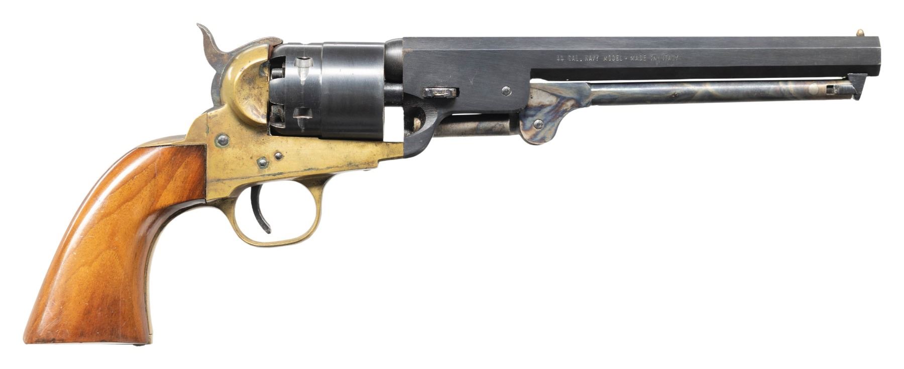 Cal. 44. S# 16189. Bbl. 7 1/2". Brass post front sight. Italian repro black powder revolver imported by Hawes in California. Blued bbl. & cyl. Case colored ejector rod & hammer. Brass frame, trigger guard & grip assembly. Walnut grips. CONDITION: grips show some handling marks, light finish loss & handling marks. Brass parts are a dull yellow patina with scattered oxidation more heavy around hammer recess & handling marks. Case colored parts retain most of their finish with some heavy oxidation on hammer & operational wear. Blued parts retain 95-97% original finish with some edge & operational wear, staining & light oxidation. Action functions properly when hand cycled. Very good bore with strong rifling. (01-28543/MJC). ANTIQUE. $100-200.