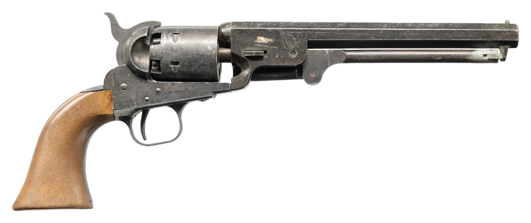 Non-firing Japanese made replica of an 1851 Navy revolver. Matte gray finish. Simulated hardwood grips. UNATTACHED ACCESSORIES: S&W 41 box & some tools. CONDITION: metal shows scattered flaking finish & handling marks. Grips show some handling marks. Hammer & cyl. function when hand cycled. (02-26576/MJC). NON-GUN. $100-150.