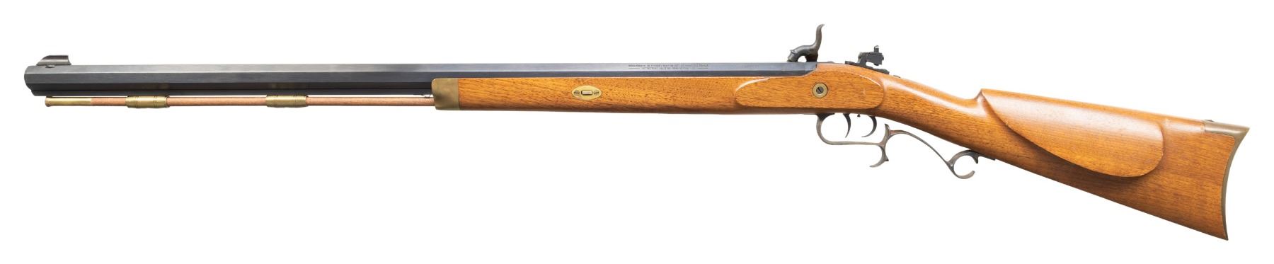 Cal. 45. S# 527691. Bbl. 30". Bead front sight. Tang mounted aperture rear sight. Bbl. Has two screw holes for further sight mounting. Blued bbl. Case colored lock, hammer & trigger guard. Double set triggers. Brass furniture. Half-length walnut stock. Brass tipped hardwood ramrod. CONDITION: stock shows a few spots of finish loss, some light dings & scattered handling marks. Case colored parts retain amounts of case colors with some light oxidation & fading to gray. Brass parts are dulling to yellow with some light oxidation. Blued parts retain nearly all their finish with some scattered light oxidation, edge wear & handling marks. Action functions properly when hand cycled. Bore shows light oxidation but has strong rifling. PROVENANCE: Estate of Groves Herrick. (01-28319/MJC). ANTIQUE. $100-300.