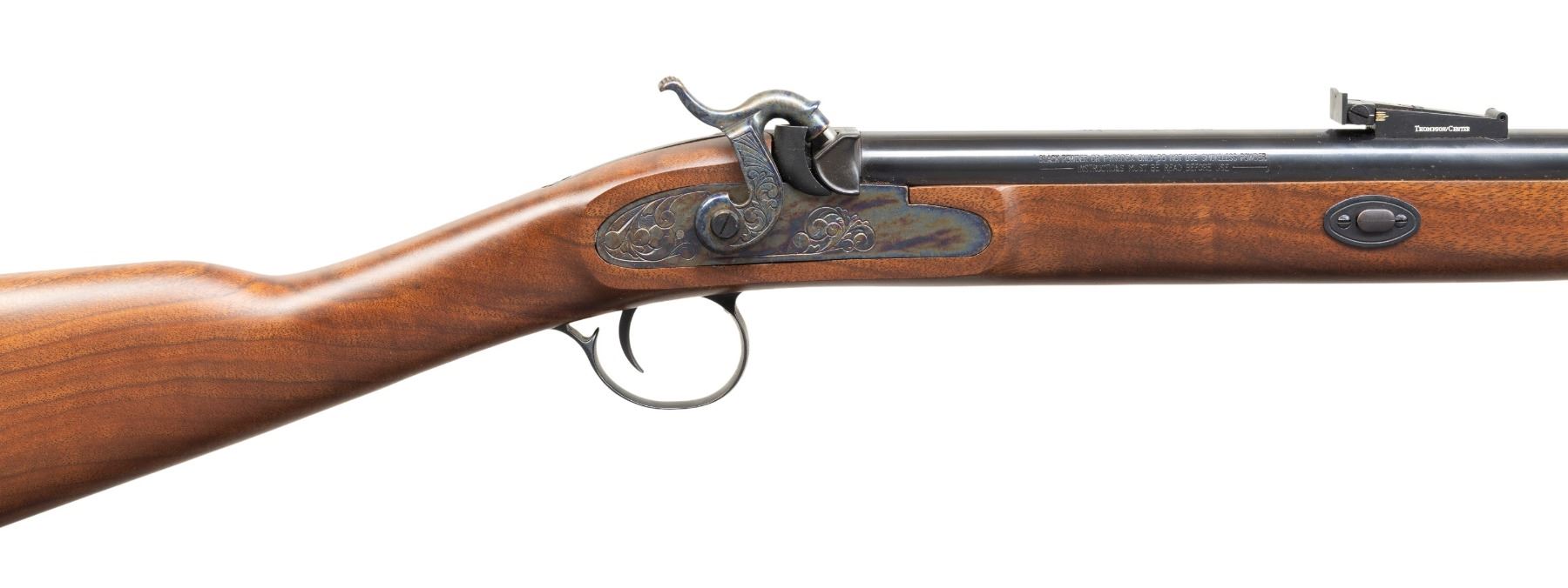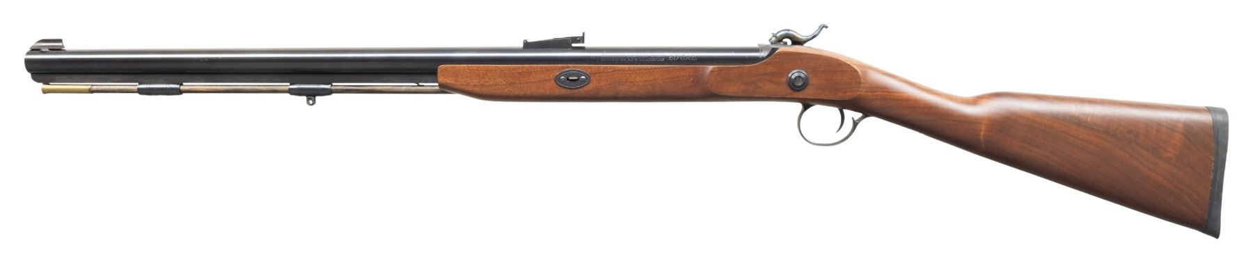 Cal. 50. S# 128792. Bbl. 26". Bead front sight. Adjustable TC rear sight. Case colored lock assembly. Balance of other parts are blued. Half-length walnut stock with bottom mounted sling studs & factory recoil pad. LOP: 14". Hardwood ramrod with brass tip. CONDITION: stock shows some scattered light handling marks. Lock retains nearly all its case colors with some light oxidation. Balance of metal retains 998% original blue with some light oxidation specks & handling wear. Action functions properly when hand cycled. Very good bore with some light oxidation. PROVENANCE: Estate of Groves Herrick. (01-28363/MJC). ANTIQUE. $100-300.