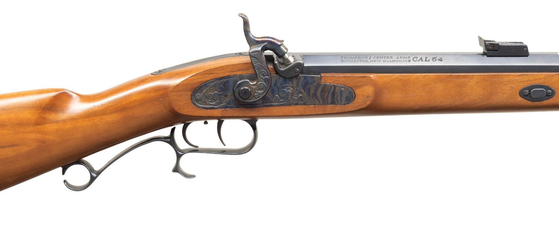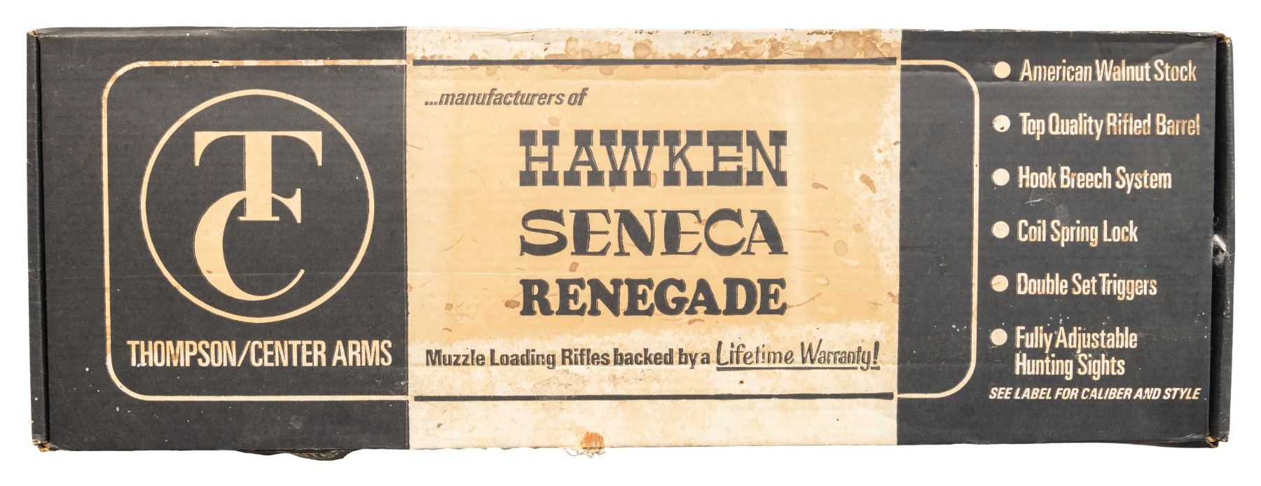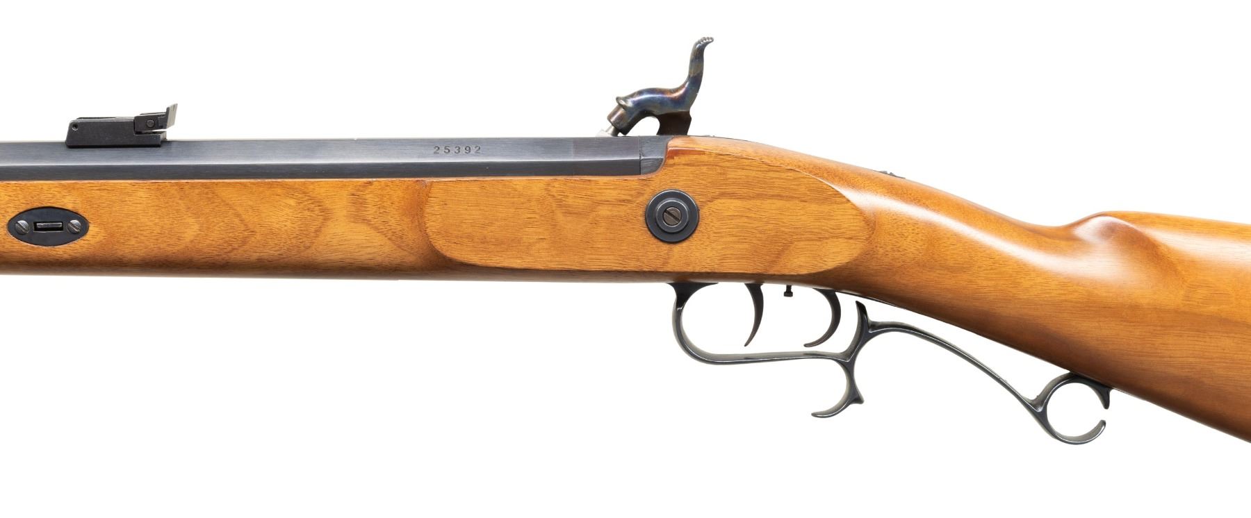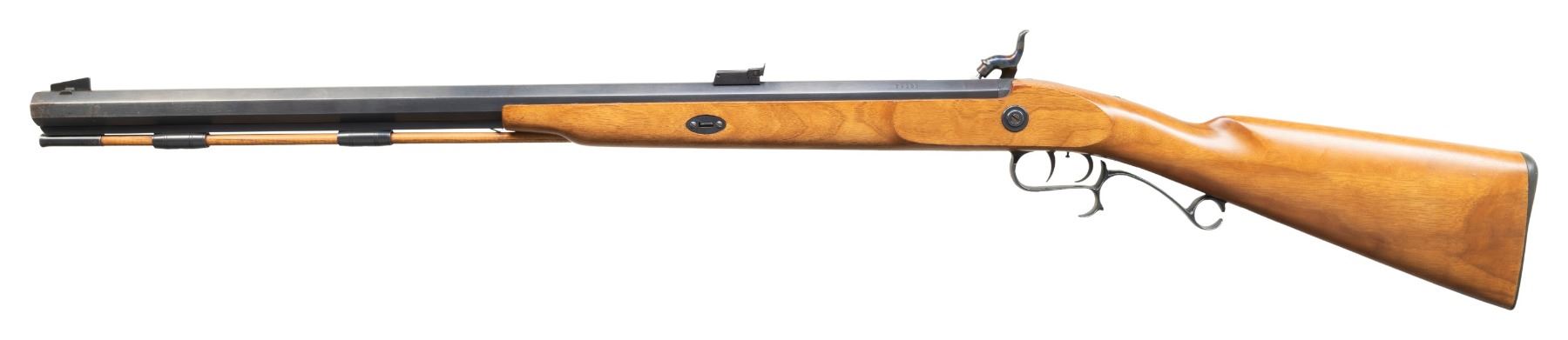 Cal. 54. S# 25392. Bbl. 27" oct. Blade front sight. Adjustable rear sight. Case colored lock assembly. Balance of other parts are blued. Double set triggers. Half-length walnut stock set. Hardwood ramrod with iron tip. UNATTACHED ACCESSORIES: replacement TC Seneca box in fair condition with staining & notable wear. CONDITION: stock shows a thin crack above eschuteon on right side, some handling marks & scratches. Metal retains 95% original finishes with some oxidation along bbl. most notable near muzzle handling marks & edge wear. Action functions properly when hand cycled. Very good bore with some light oxidation but strong rifling. PROVENANCE: Estate of Groves Herrick. (01-28362/MJC). ANTIQUE. $100-300.