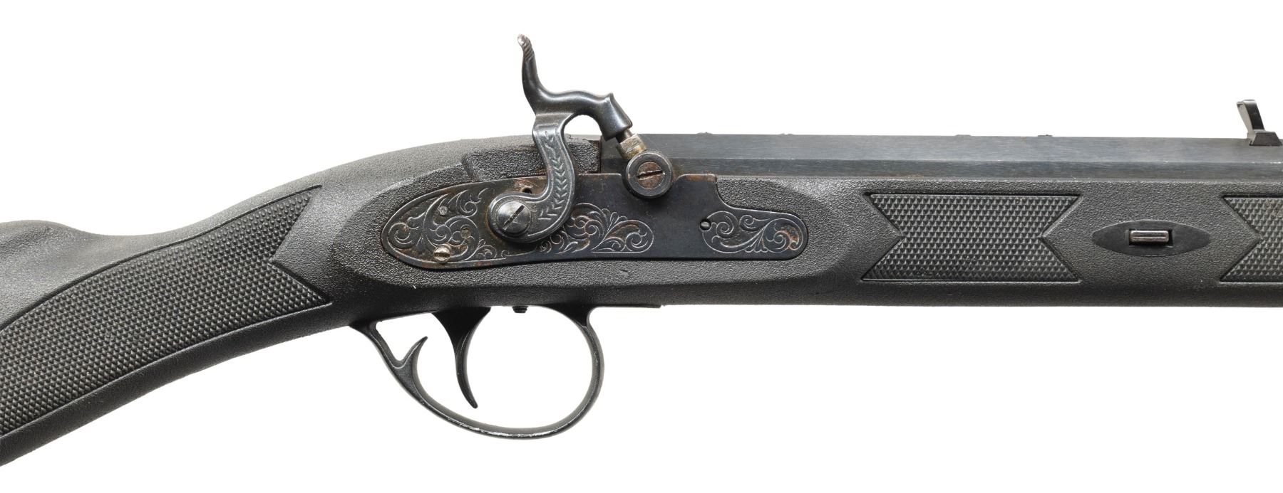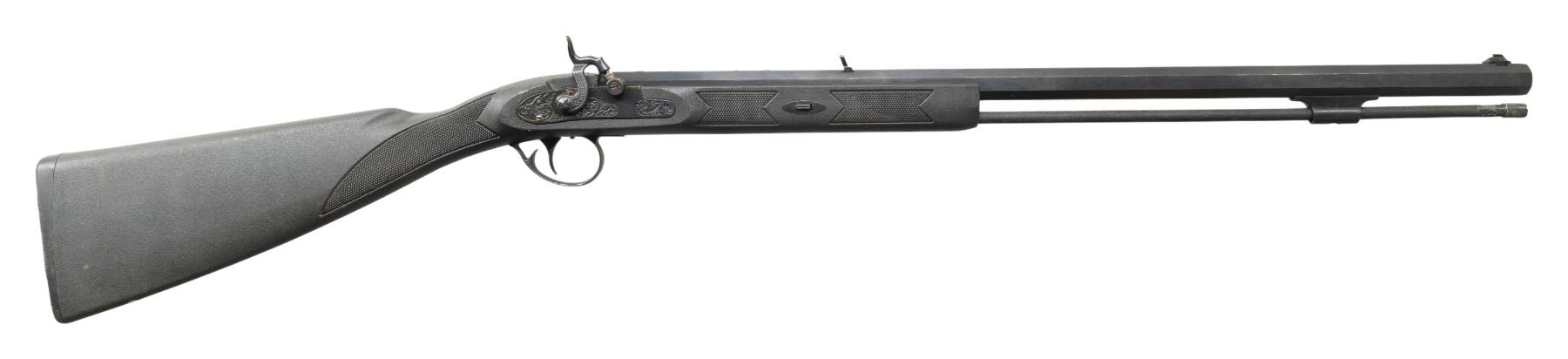 Cal. 50. S# 61-13-003173-96. Bbl. 26" oct. Bead front sight. V-notch rear sight. Bbl. has four holes for sight mounting. Blued finish. Black synthetic pistol grip stock with bottom mounted but vacant sling stud holes. Ramrod present. CONDITION: stock shows scattered scuffs & handling marks. Metal retains 95% original blue with scattered edge wear, light oxidation & handling marks. Action functions properly when hand cycled. Very good plus bore with strong rifling. (01-28178/MJC). ANTIQUE. $150-250.